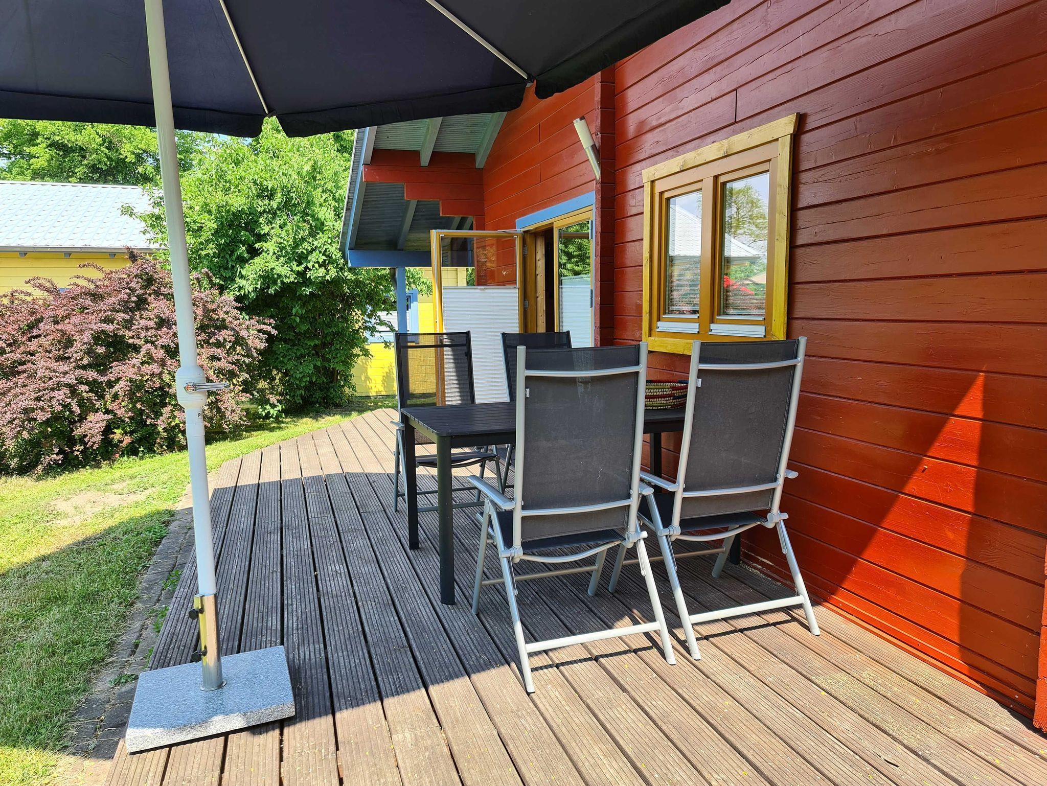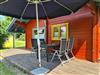 Zu jedem Haus gehört eine Terrasse mit Möbeln, Sonnenschirm und Grill sowie ein kostenfreier Parkplatz direkt am Gartenzaun.
