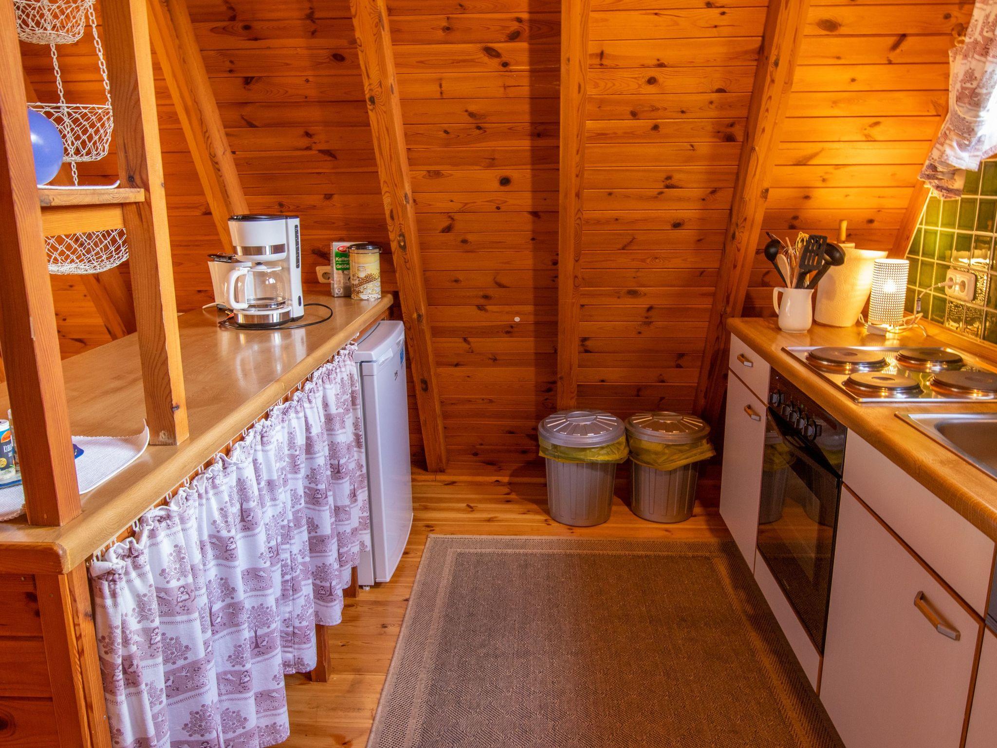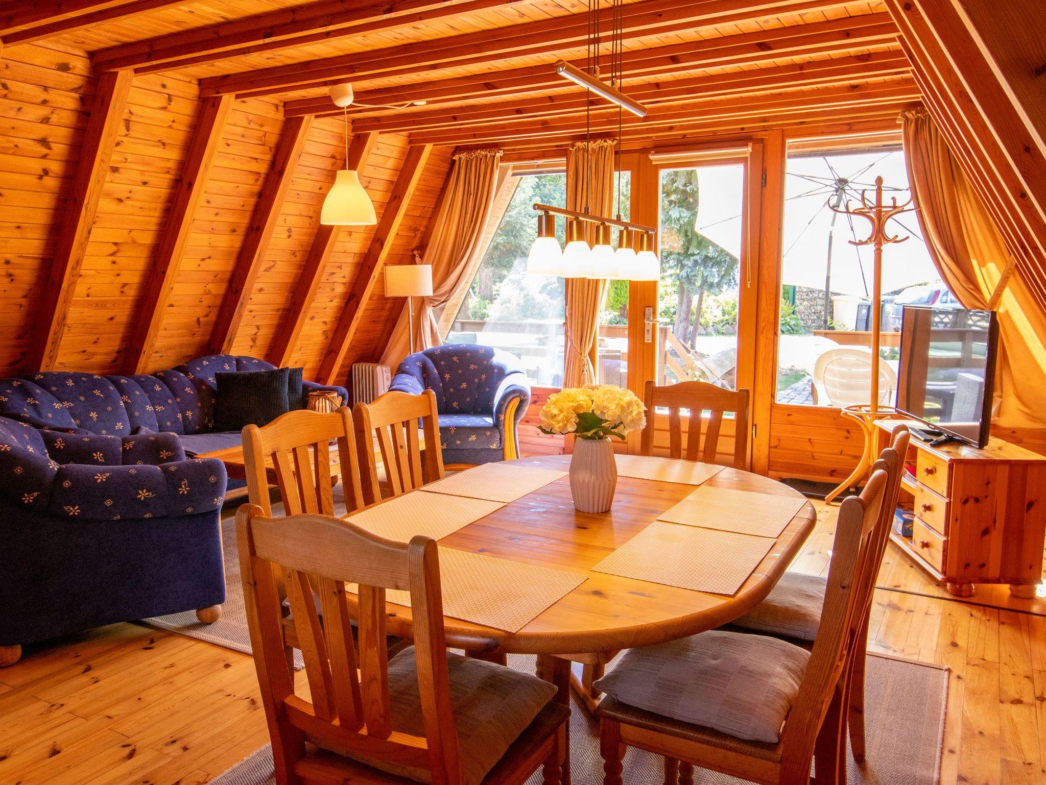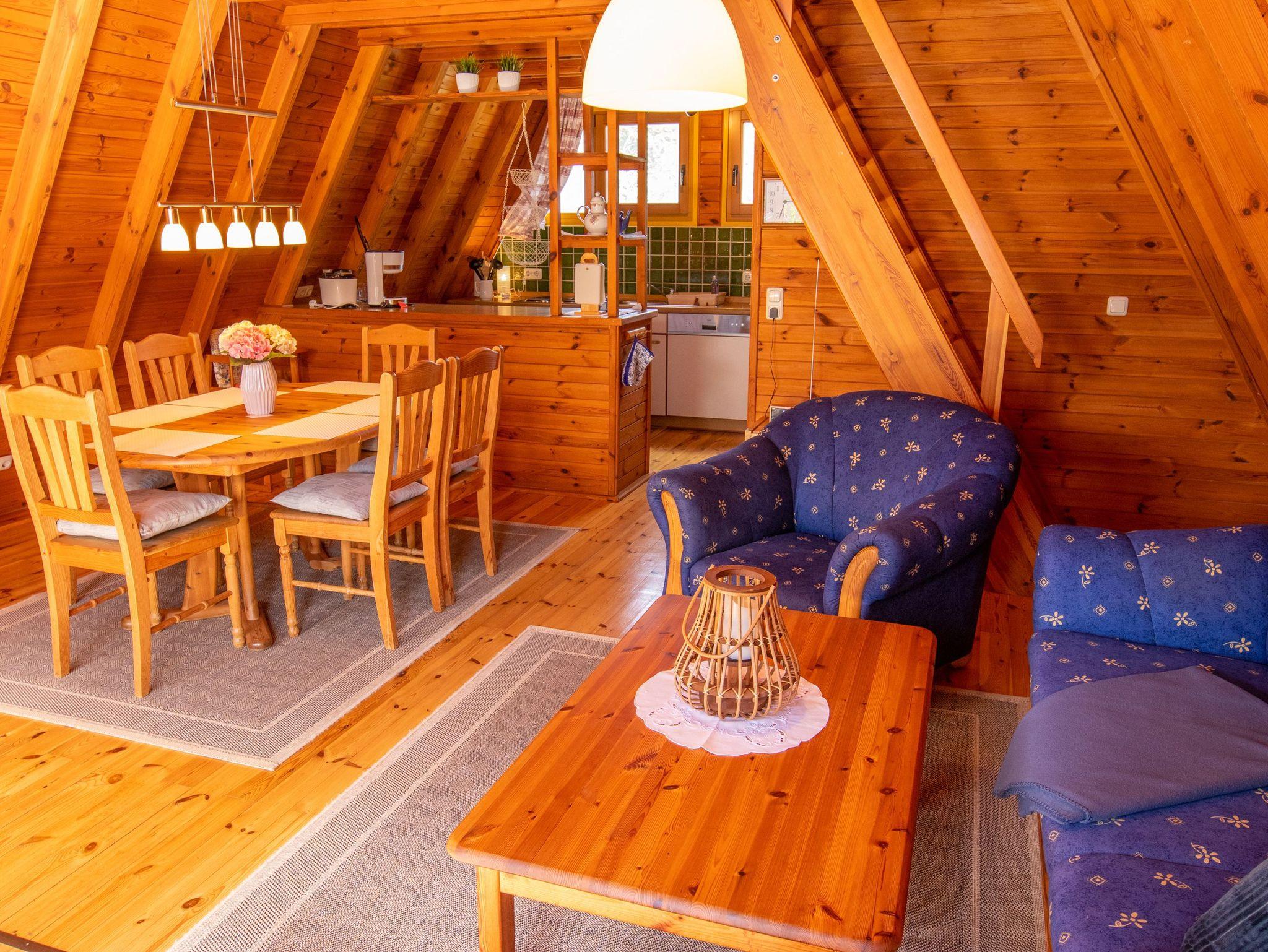 Im Erdgeschoss findest du ein geräumiges Wohnzimmer mit TV, einer gemütlichen Sitzecke und einem Esstisch. Die angrenzende offene Küche ist vollständig ausgestattet, inklusive Kühlschrank, Geschirrspüler und Kaffeemaschine. Außerdem gibt es im Erdgeschoss ein Badezimmer mit Dusche, WC und einer Waschmaschine. Über eine Raumspartreppe gelangst du ins Obergeschoss, wo sich zwei Schlafzimmer mit insgesamt 5 Einzelbetten (90x200) befinden. Jede unserer 70 m² großen Finnhütten verfügt über eine eigene Terrasse und einen Grillplatz. Zudem stehen eine Tischtennisplatte, ein Sandkasten und eine Schaukel für Kinder zur gemeinsamen Nutzung bereit.