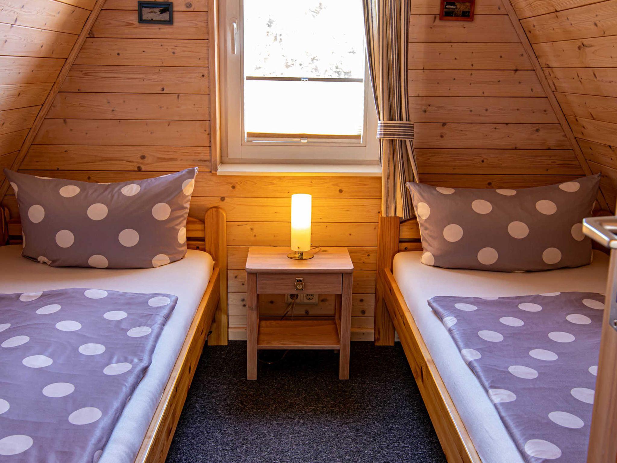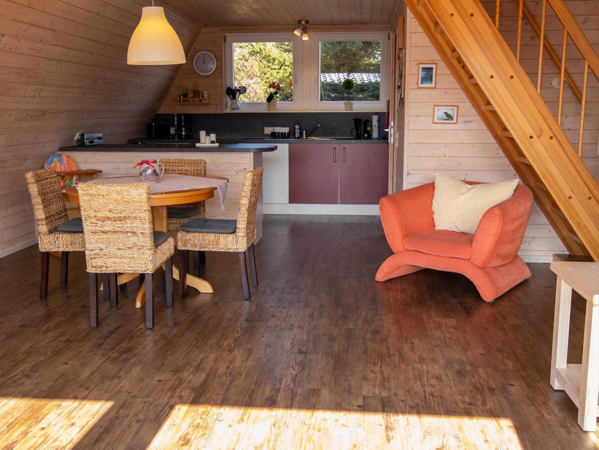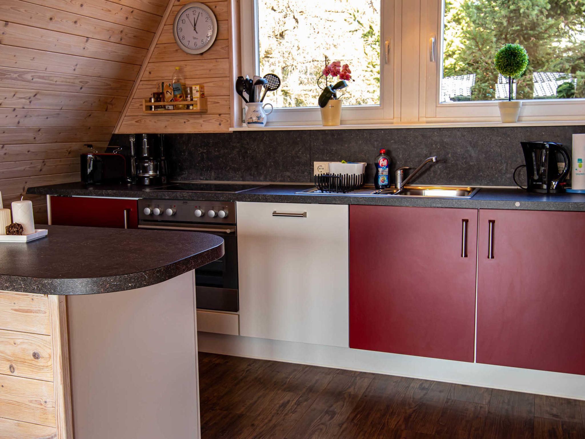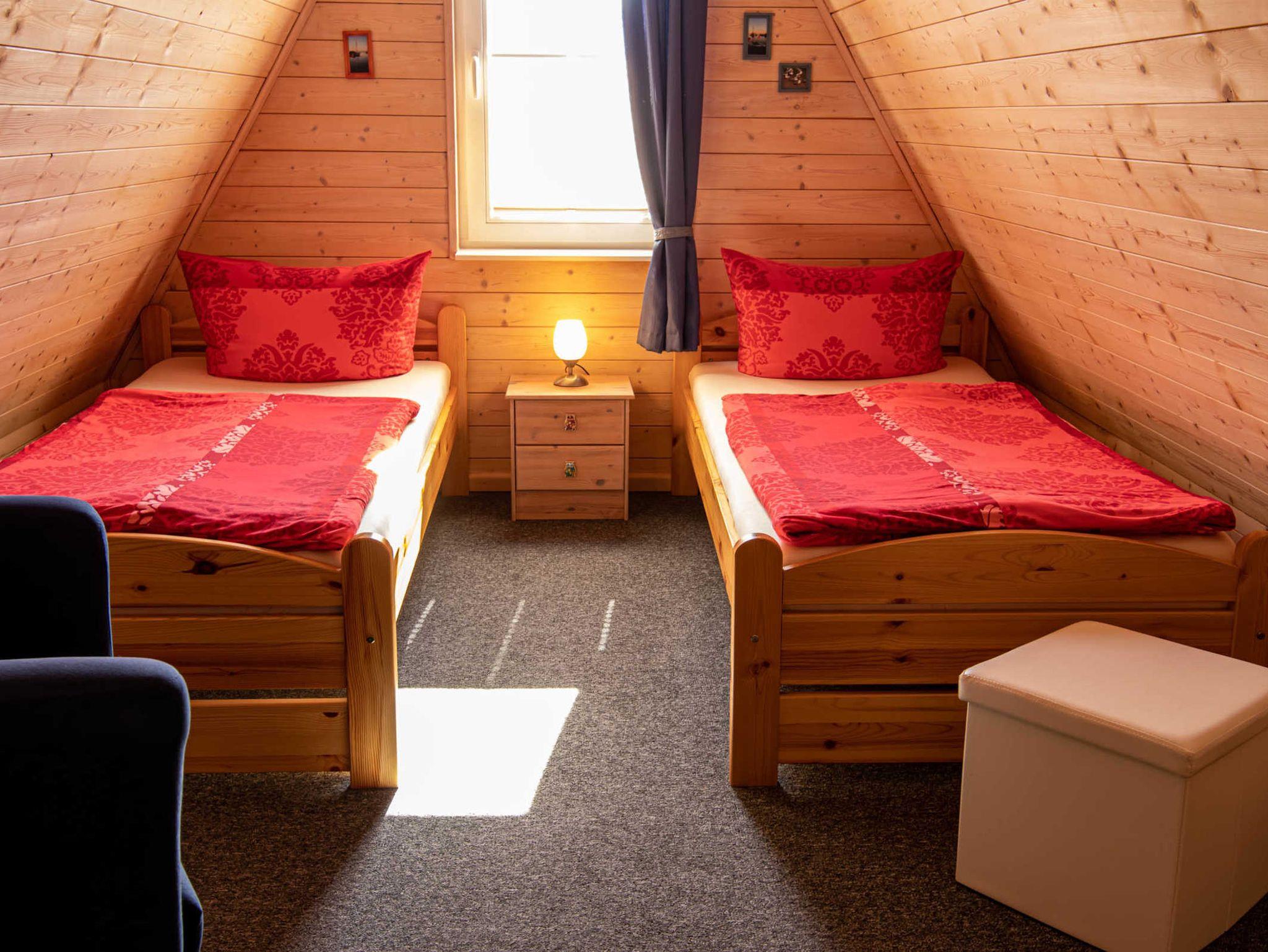 Die Finnhütte verfügt im Obergeschoss über zwei Schlafzimmer mit je zwei Einzelbetten (jeweils 90x200). Ein Kinderbett (bis 1 Jahr) kann zugestellt werden. Im unteren Bereich befinden sich ein gemütlich eingerichteter Wohnraum mit einer offenen, neuen und modernen Küche, ein Essbereich mit Esstisch und 4 Stühlen sowie das Bad mit Dusche und WC. Die Küche ist umfangreich ausgestattet mit Kühlschrank (mit 18l Frostfach), Ceran-Herd mit Backofen, Spülmaschine, Wasserkocher, Toaster und Kaffeemaschine. Internet-WLAN steht kostenfrei zur Verfügung.