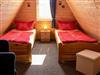 Die Finnhütte verfügt im Obergeschoss über zwei Schlafzimmer mit je zwei Einzelbetten. Ein Kinderbett (bis 1 Jahr) kann zugestellt werden. Im unteren Bereich befinden sich ein gemütlich eingerichteter Wohnraum mit einer offenen, neuen und modernen Küche, sowie das Bad mit Dusche und WC.