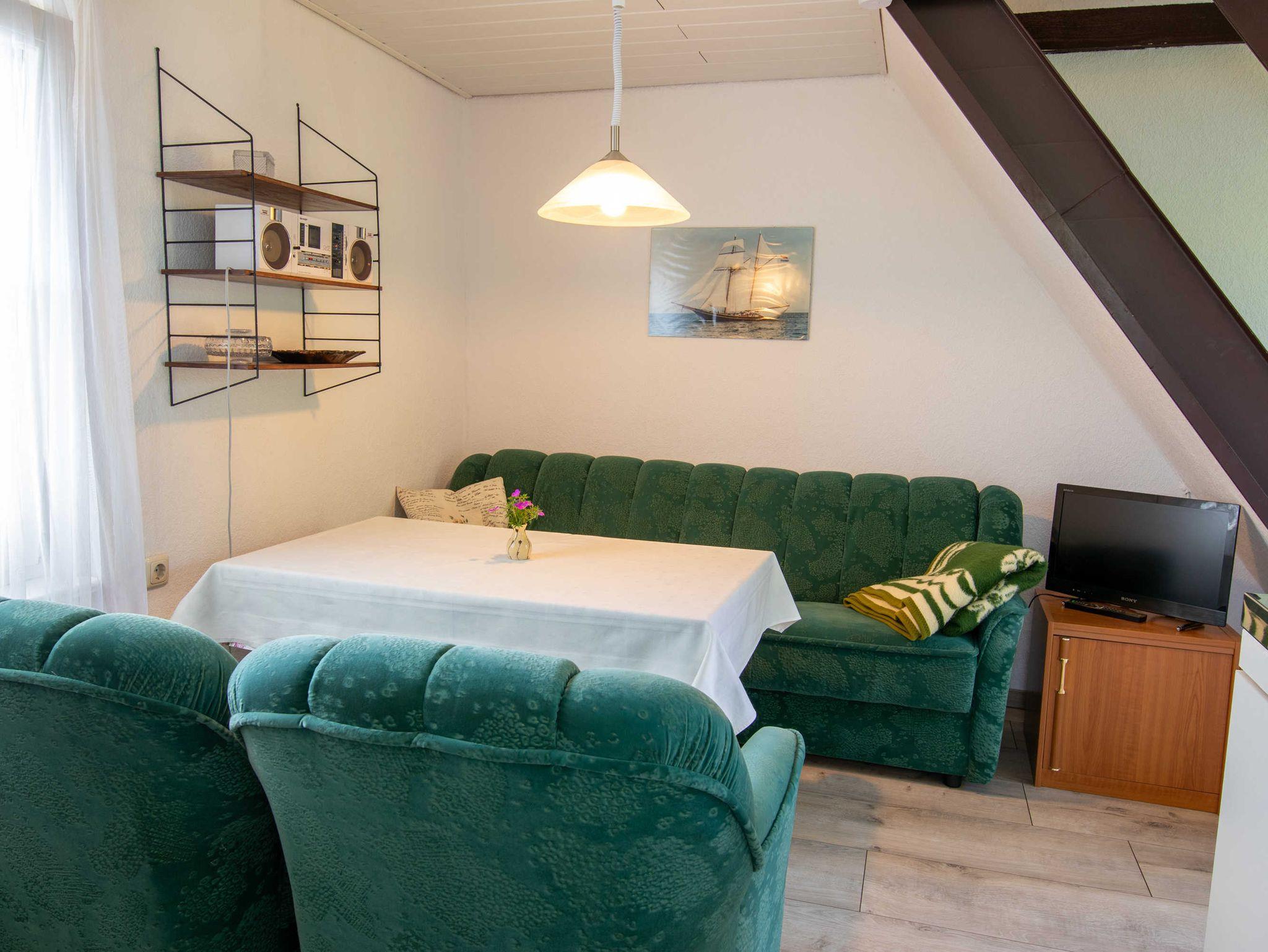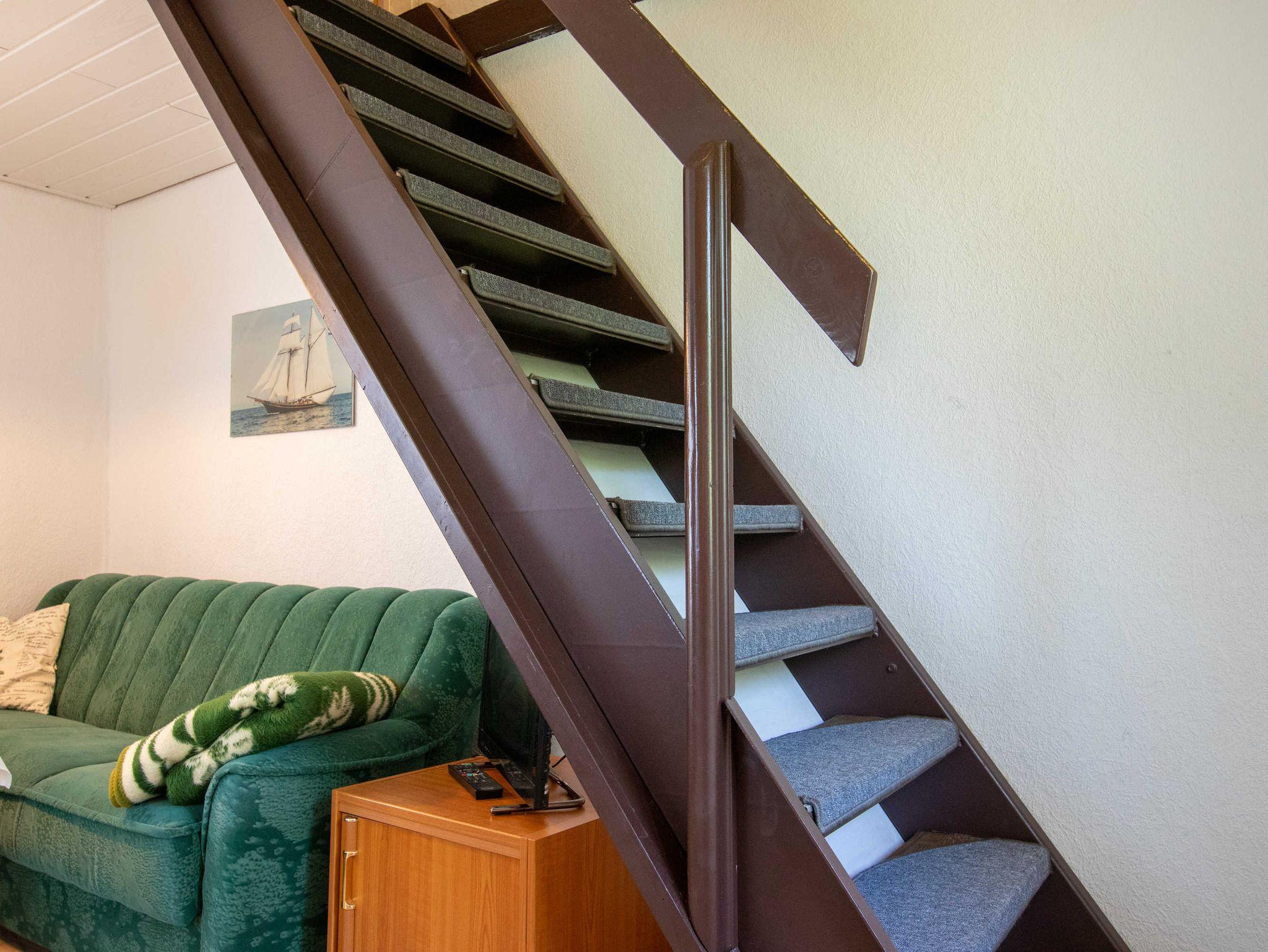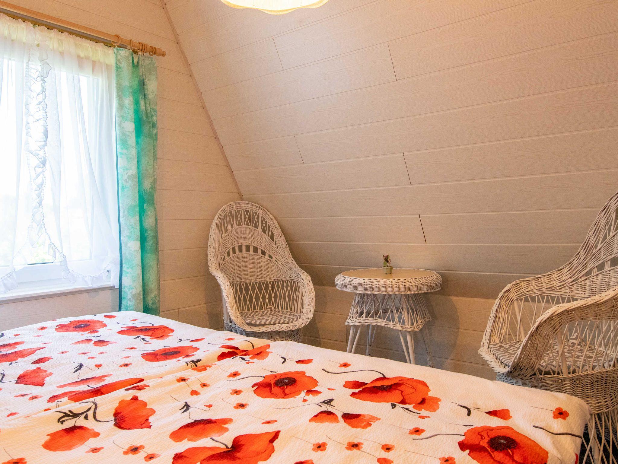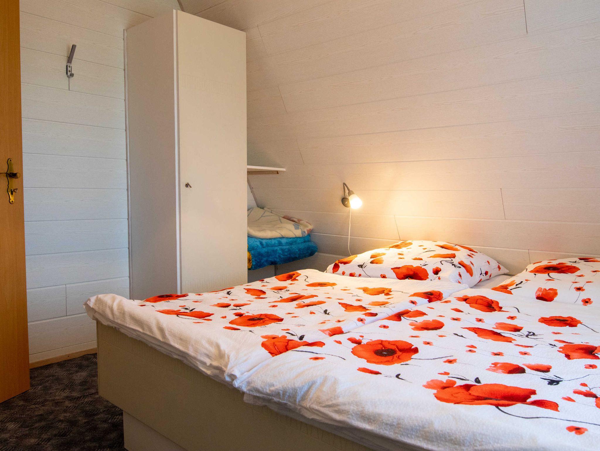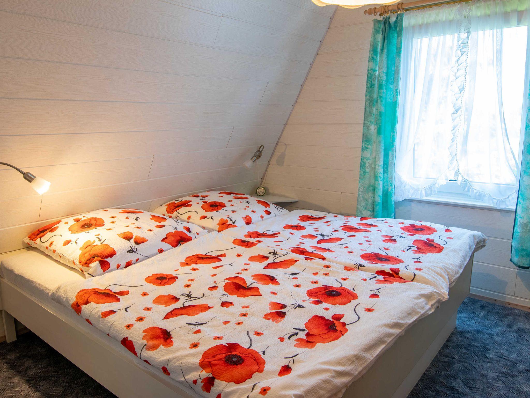 Das ca. 40 m² große Haus verfügt im Erdgeschoss über einen Wohnbereich mit Miniküche (2-Platten-Herd, Kühlschrank, Spüle, Toaster, Kaffeemaschine, Wasserkocher) und kombinierter Sitz-Essecke mit TV und Radio. Bad mit Dusche und WC befinden sich ebenfalls im unteren Bereich. Das Obergeschoss bietet zwei Schlafzimmer, eines mit Blick zum Wasser, Doppelbett (180x200 cm) und Sitzgelegenheit, das andere Zimmer ist mit zwei Einzelbetten ausgestattet.