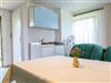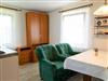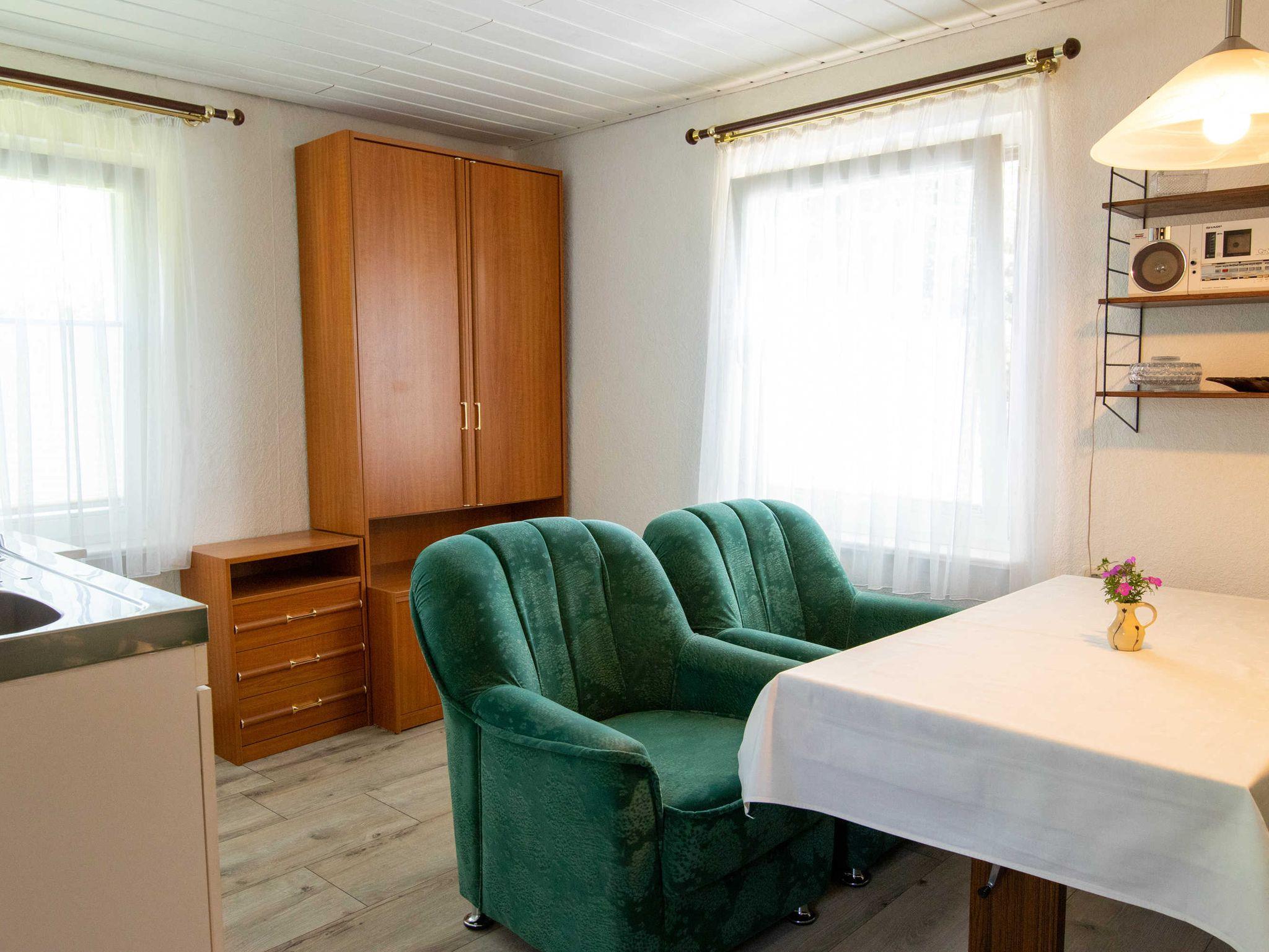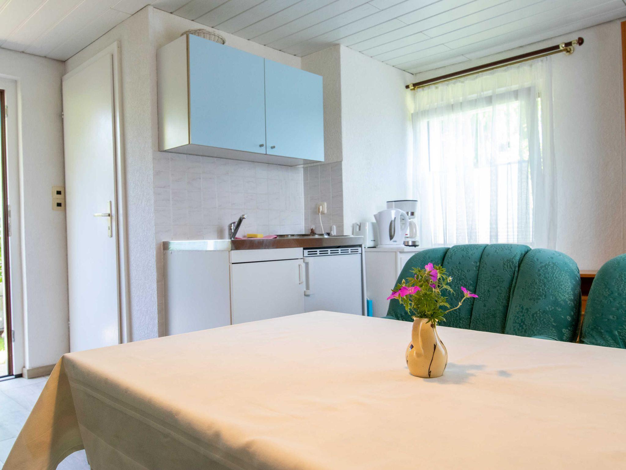 Das ca. 40m² große Haus verfügt im Erdgeschoss über einen Wohnbereich mit Pantryküche und kombinierter Sitz-Essecke mit TV und Radio. Das Bad mit Dusche und WC befindet sich ebenfalls im unteren Bereich.