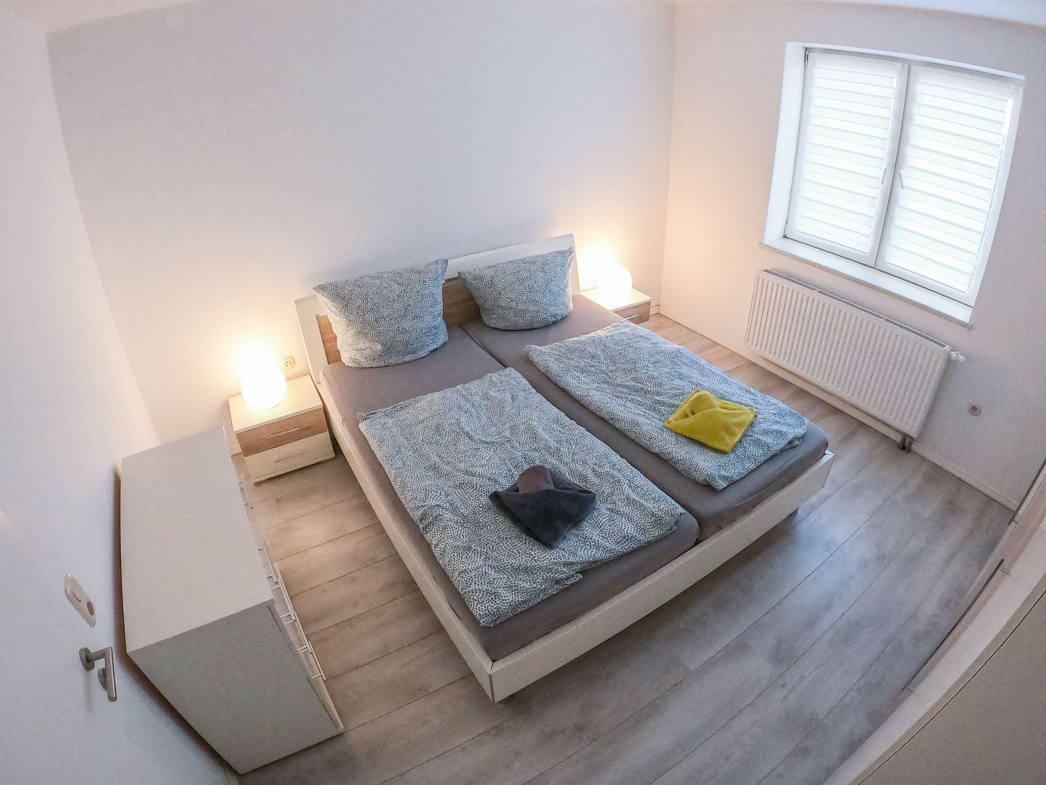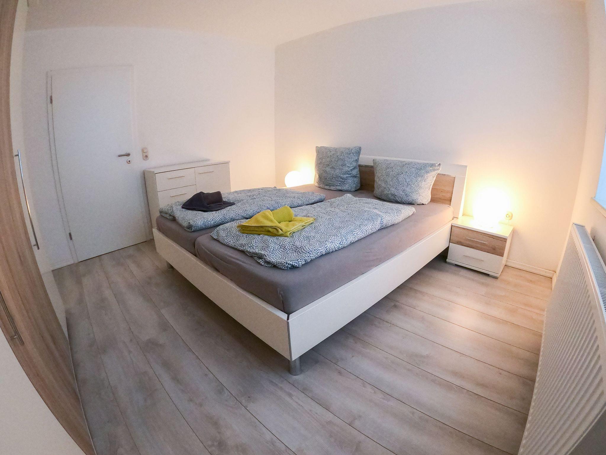ein modern eingerichtetes Schlafzimmer mit Doppelbett (200 × 200 cm, getrennte Matratzen) und Kleiderschrank,