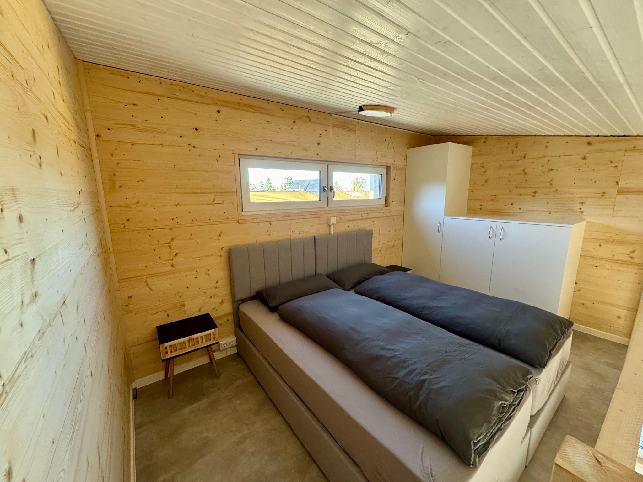 Über eine Treppe mit integriertem Stauraum erreichen Sie das Schlafzimmer im Obergeschoss. Dort erwartet Sie ein komfortables Doppelbett (180 x 200 cm). Dieses besteht aus zwei Einzelbetten (je 100 x 200 cm), die bei Bedarf auseinandergezogen werden können so kann jeder Gast in einem eigenen Bett schlafen.