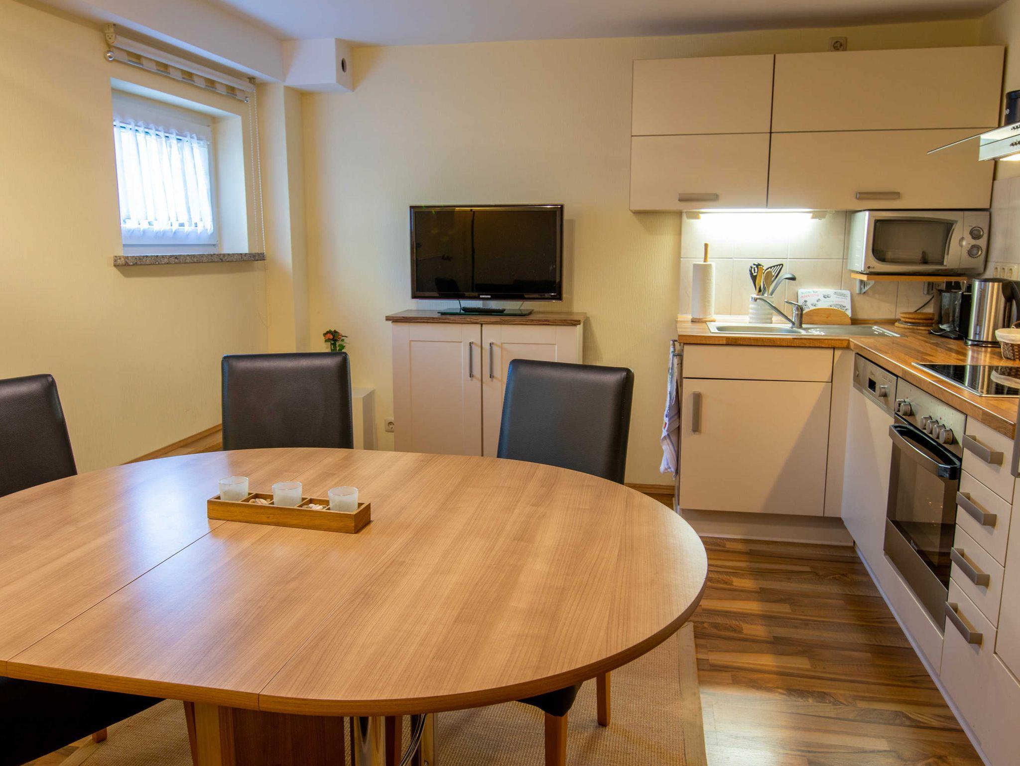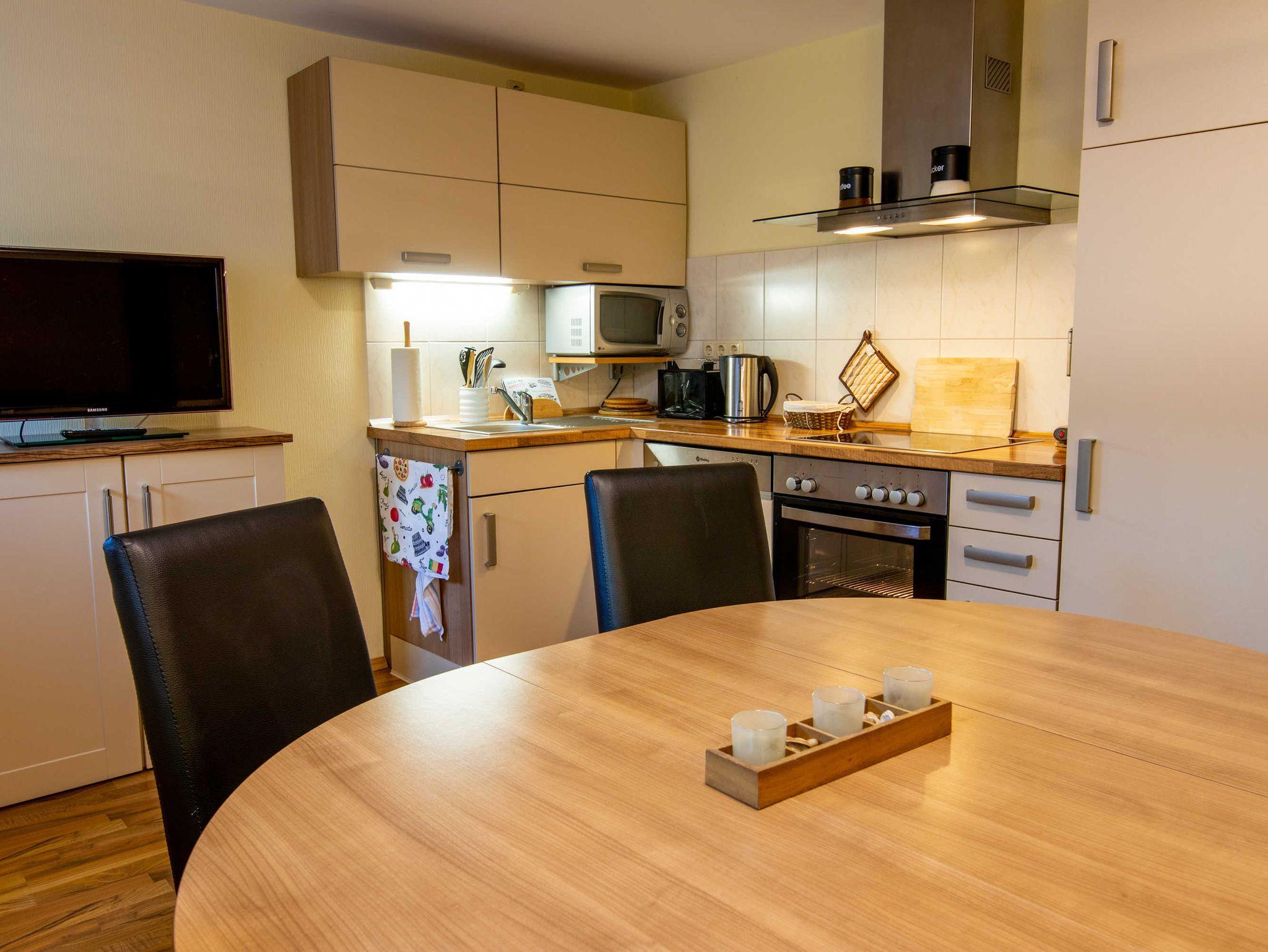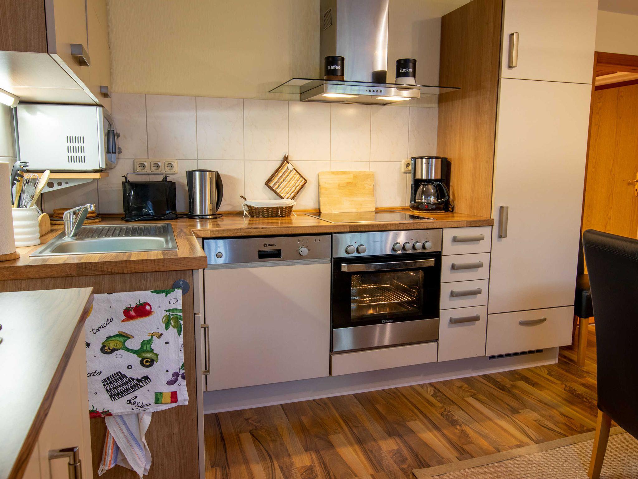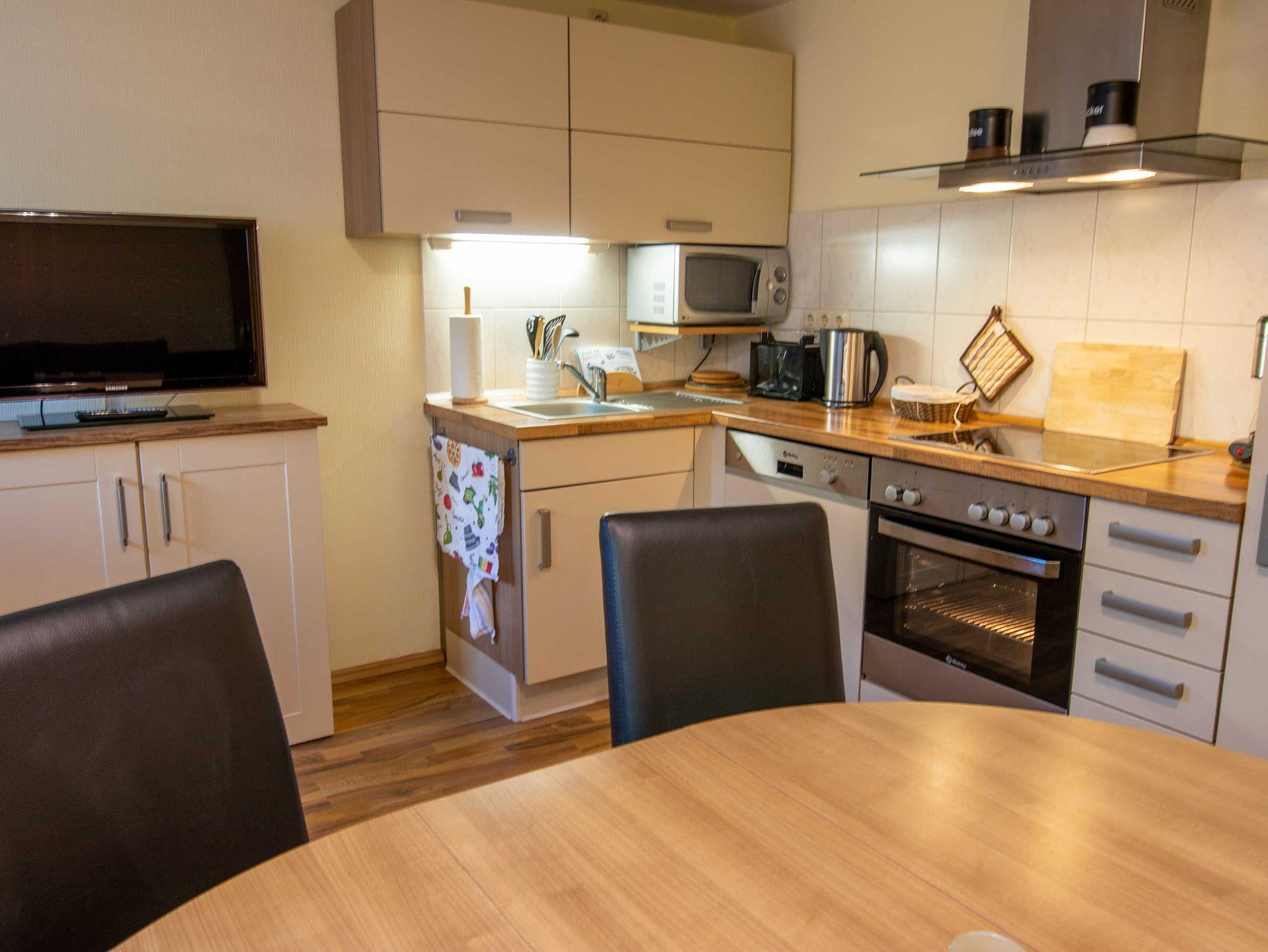 Die Einbauküche ist vollausgestattet mit Ceranfeld, Backofen, Kühlschrank mit Gefriermöglichkeit, Toaster, Kaffeemaschine, Mikrowelle und Wasserkocher.
