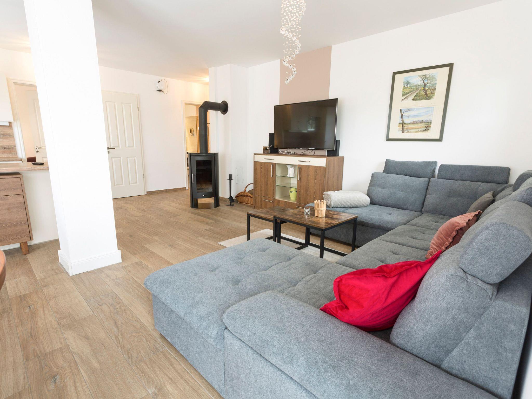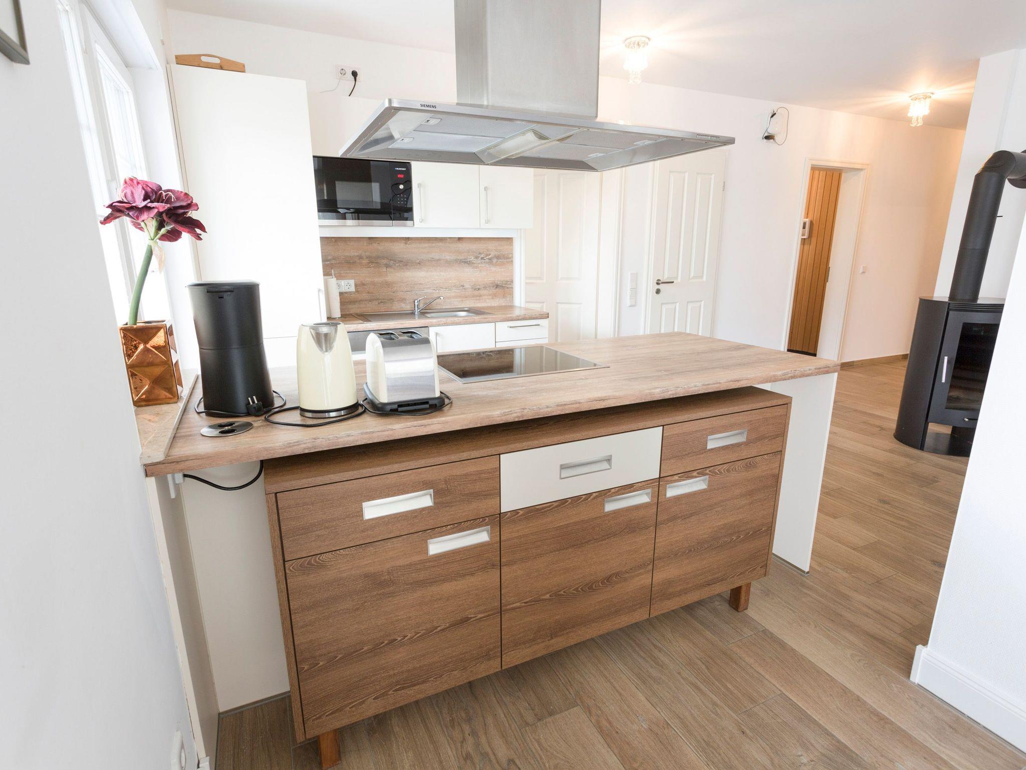 Im großzügigen Wohnbereich erwarten Sie eine gemütliche Wohnlandschaft, Kamin, Smart-TV, eine offen gestaltete Küche sowie ein großer Esstisch. Die Küche ist umfangreich ausgestattet mit Kühlschrank, Gefrierschrank, Ceran-Kochfeld, Backofen, Spülmaschine, Mikrowelle, Kaffeemaschine, Wasserkocher, Toaster und alle den kleinen Dingen des täglichen Bedarfs.
