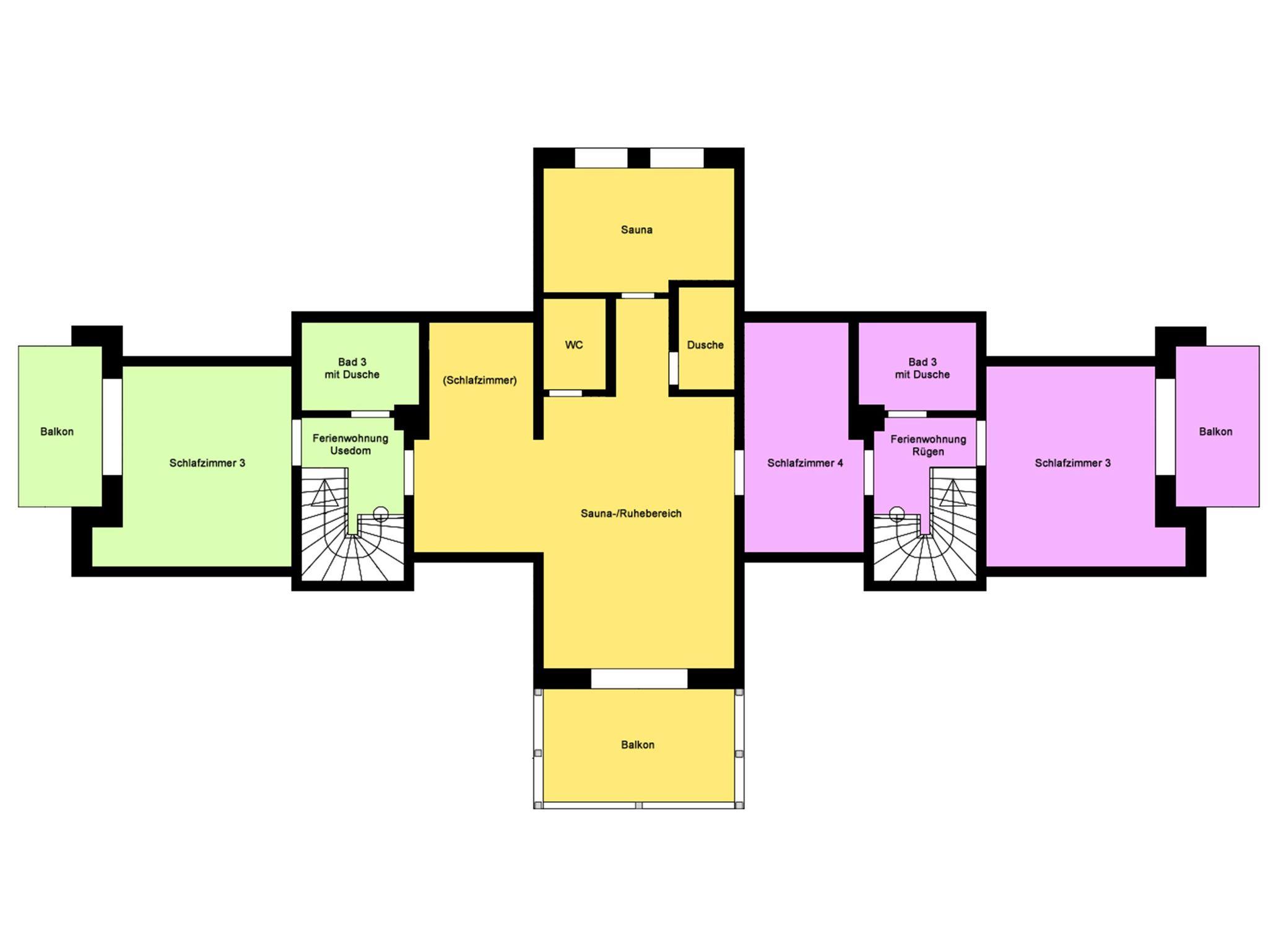 Die zwei Ferienwohnungen im Obergeschoss verfügen jeweils über einen Wohnraum mit integriertem Küchen- und Essbereich und Kaminofen, vier separaten Schlafzimmern mit Balkonen und drei Bädern. Die Ferienwohnung Usedom hat einen 40m² großen Saunabereich mit Dusche, Ruheliegen und Balkon.