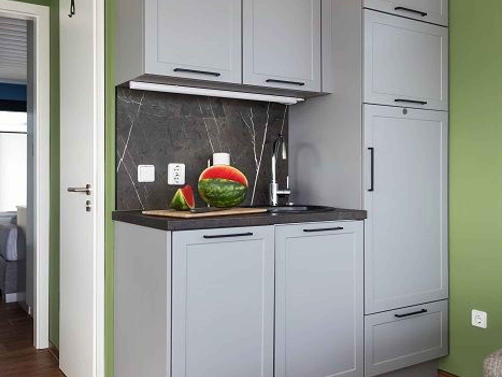 - 1 Wohnraum mit Schlafcouch und offener Küche