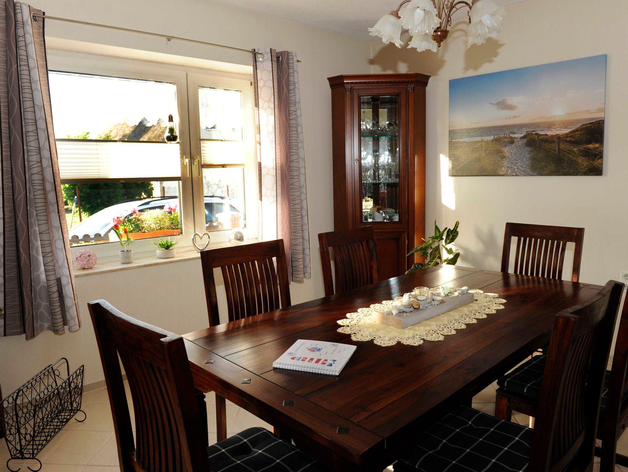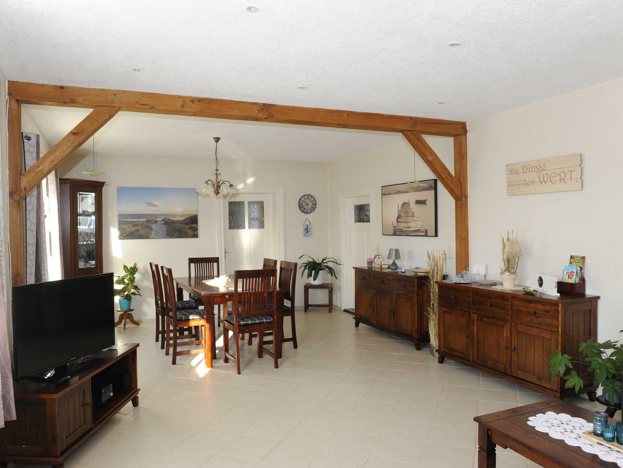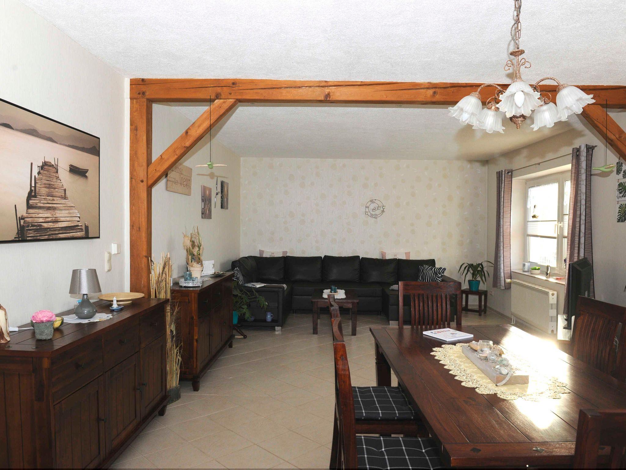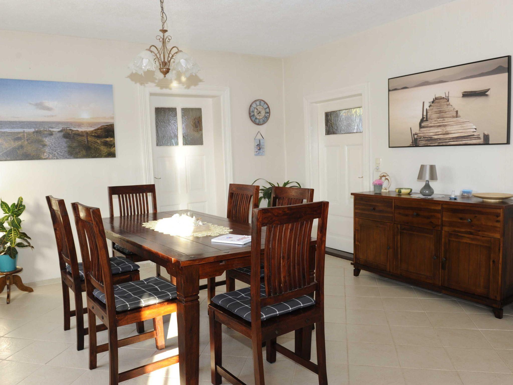 Sie erwartet im Erdgeschoss ein großes Wohnzimmer mit Esstisch und gemütlichem großen Sofa, die Küche, ausgestattet mit Backofen, Herd (Ceranfeld), Geschirrspüler, Toaster, Kaffeemaschine, Wasserkocher und allen Küchenutensilien, sowie Kühl- und Gefrierkombination. Ein Schlafzimmer mit Doppelbett (160x200) und TV, ein weiteres Einzelzimmer mit einem Bett (140x200), sowie ein Bad mit WC, Dusche und Waschmaschine befinden sich ebenfalls im Erdgeschoss. In der oberen Etage sind zwei weitere Räume: Ein großes Schlafzimmer mit Doppelbett (180x200) und Einzelbett (100x200), welches ein Durchgangszimmer ist, durch das man in das etwas kleinere Schlafzimmer mit Doppelbett (160x200) und einem Einzelbett (100x200) gelangt. Desweiteren gibt es im Obergeschoss ein Bad mit Badewanne und WC.
