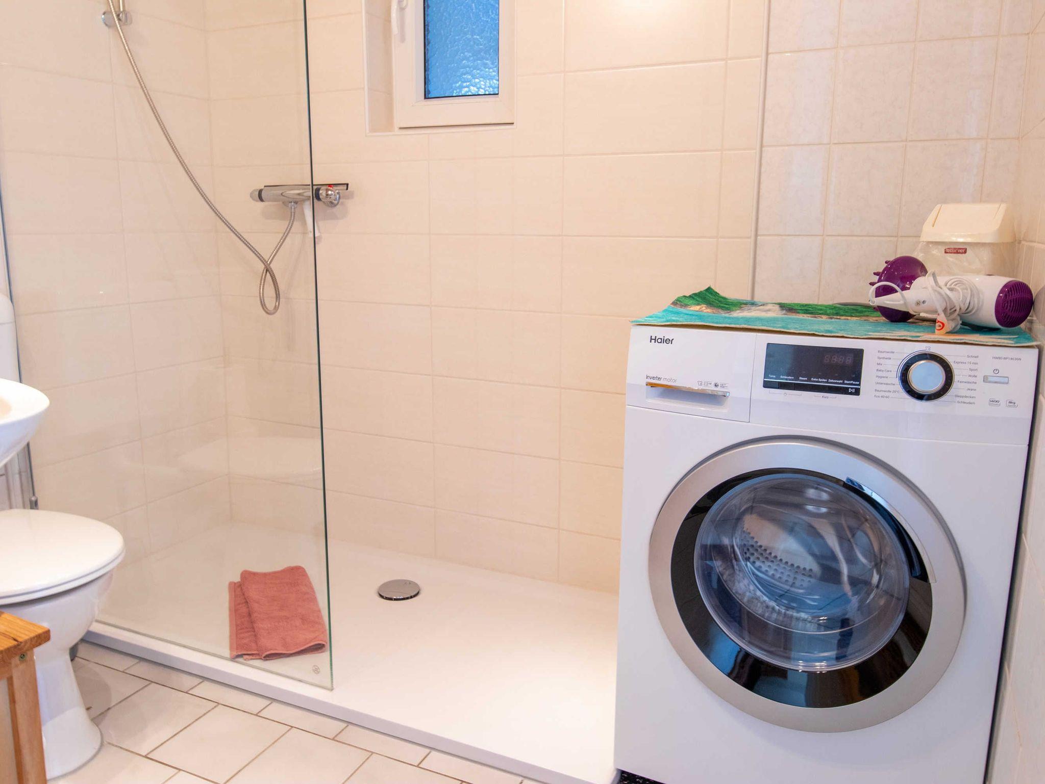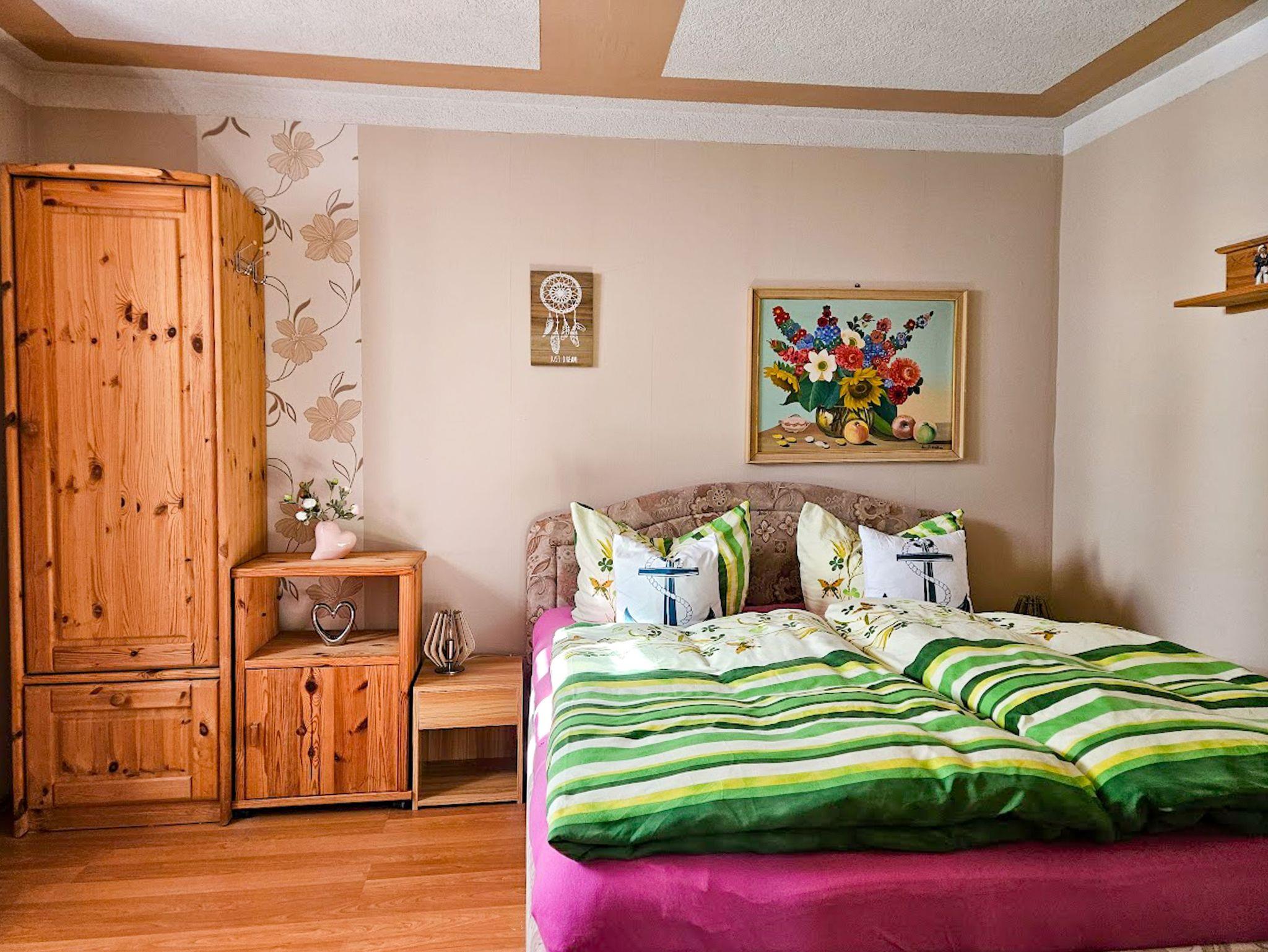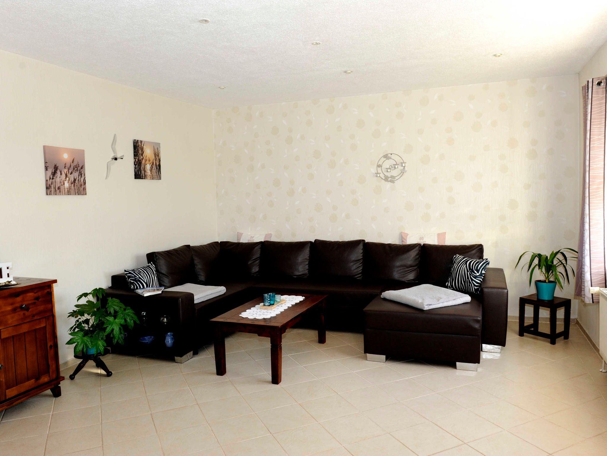Sie erwartet im Erdgeschoss ein großes Wohnzimmer mit Esstisch und gemütlichem großen Sofa, die Küche, ausgestattet mit Backofen, Herd (Ceranfeld), Geschirrspüler, Toaster, Kaffeemaschine, Wasserkocher und allen Küchenutensilien, sowie Kühl- und Gefrierkombination. Ein Schlafzimmer mit Doppelbett (160x200) und TV, ein weiteres Einzelzimmer mit einem Bett (140x200), sowie ein Bad mit WC, Dusche und Waschmaschine befinden sich ebenfalls im Erdgeschoss. In der oberen Etage sind zwei weitere Räume: Ein großes Schlafzimmer mit Doppelbett (180x200) und Einzelbett (100x200), welches ein Durchgangszimmer ist, durch das man in das etwas kleinere Schlafzimmer mit Doppelbett (160x200) und einem Einzelbett (100x200) gelangt. Desweiteren gibt es im Obergeschoss ein Bad mit Badewanne und WC.