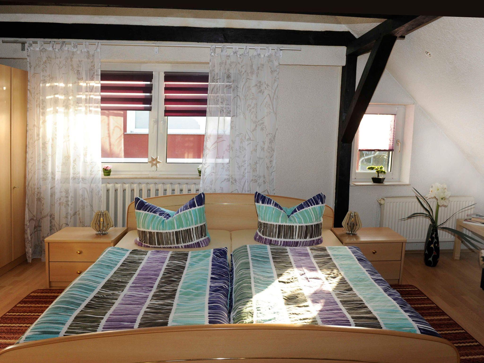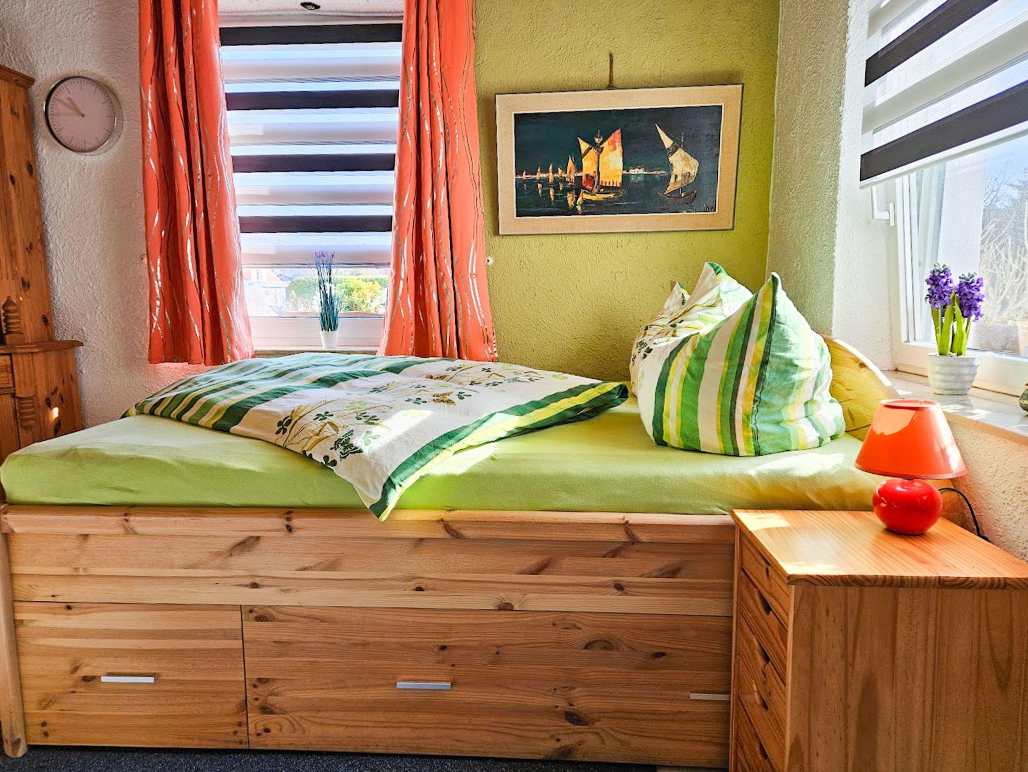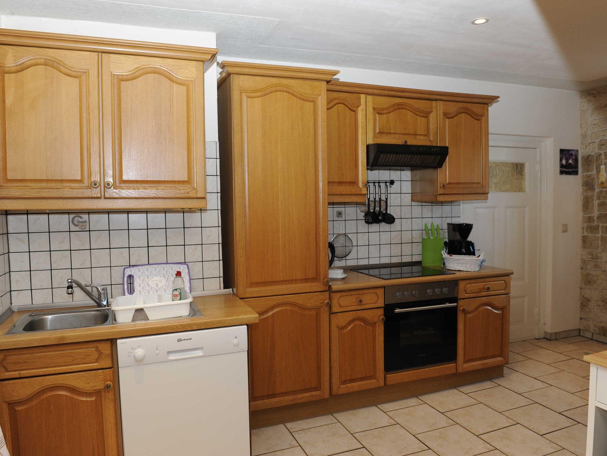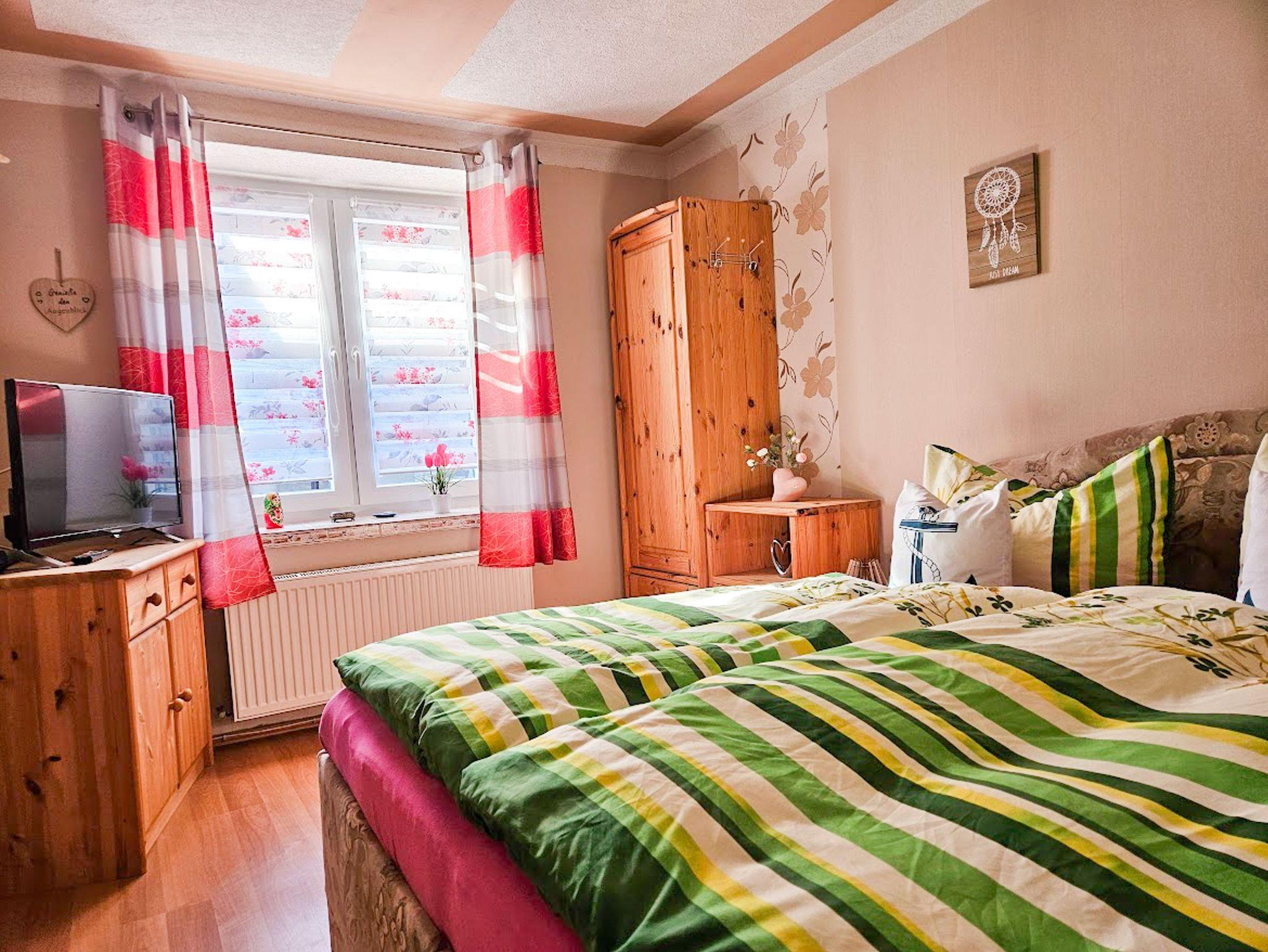 Sie erwartet im Erdgeschoss ein großes Wohnzimmer mit Esstisch und gemütlichem großen Sofa, die Küche, ausgestattet mit Backofen, Herd (Ceranfeld), Geschirrspüler, Toaster, Kaffeemaschine, Wasserkocher und allen Küchenutensilien, sowie Kühl- und Gefrierkombination. Ein Schlafzimmer mit Doppelbett (160x200) und TV, ein weiteres Einzelzimmer mit einem Bett (140x200), sowie ein Bad mit WC, Dusche und Waschmaschine befinden sich ebenfalls im Erdgeschoss. In der oberen Etage sind zwei weitere Räume: Ein großes Schlafzimmer mit Doppelbett (180x200) und Einzelbett (100x200), welches ein Durchgangszimmer ist, durch das man in das etwas kleinere Schlafzimmer mit Doppelbett (160x200) und einem Einzelbett (100x200) gelangt. Desweiteren gibt es im Obergeschoss ein Bad mit Badewanne und WC.
