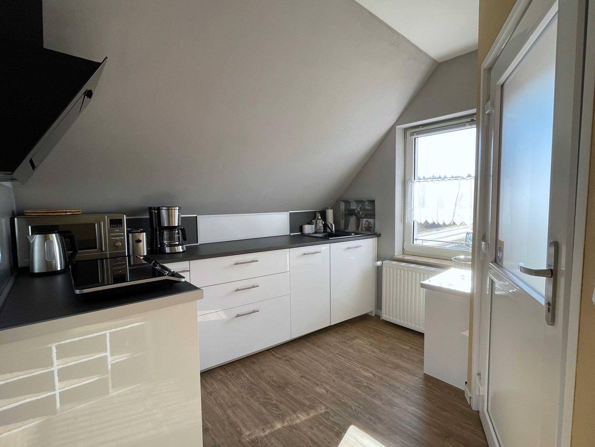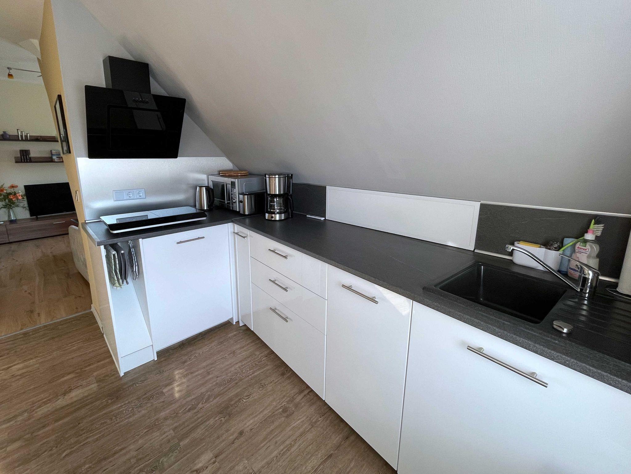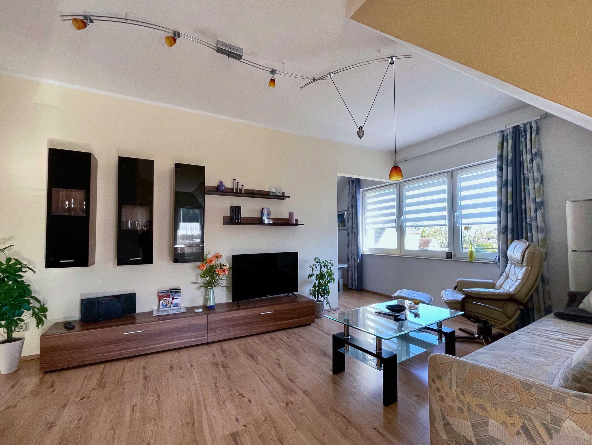 Die modern eingerichtete Ferienwohnung verfügt über ein geräumiges Wohnzimmer mit Schlafcouch (90x200), Flachbild-TV und einen gemütlichen Fernsehsessel, sowie über eine große Essecke für 4 Personen. Im offenen Schlafzimmer befindet sich ein Doppelbett (160x200) sowie ein Rollbett (90x200). Die offene Küche ist mit einem 2-flammigen Ceran-Kochfeld, Kühlschrank mit kleinem Gefrierfach, Mikrowelle, Wasserkocher, Toaster, Kaffeemaschine und Spüle ausgestattet. Das Bad verfügt über Dusche und WC.