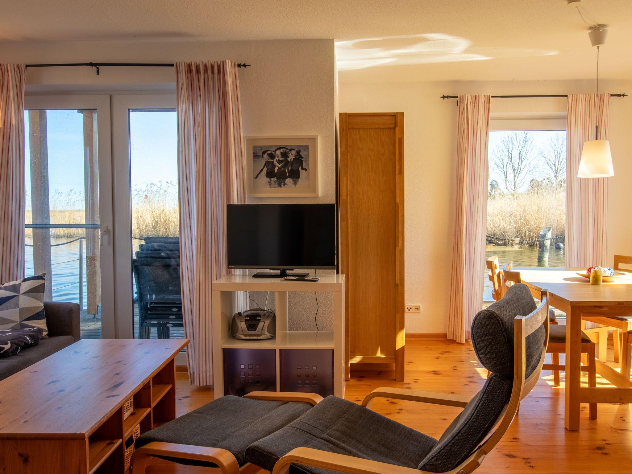 Floating House 7 in Kröslin ist ein echtes Schmuckstück auf dem Wasser ? stilvoll, durchdacht und ideal für alle, die sich im Urlaub etwas mehr Raum, Design und Komfort wünschen. Das Floating House Comfort bietet auf zwei Etagen und ca. 75m² Wohnfläche Platz für 4 Personen und bringt dir das Gefühl von Freiheit und Ruhe direkt ans Ufer des Peenestroms. Im Erdgeschoss begrüßt dich ein großzügiger Wohnbereich mit gemütlichem Sofa, Schwing-Sessel mit Hocker, und einem großen Esstisch. Die offene Küche ist top ausgestattet: Ceranfeld, Backofen mit Grill, Dunstabzugshaube, Mikrowelle, Spülmaschine, Kaffeemaschine, Toaster, Geschirr und Co. ? hier fehlt es an nichts. Praktisch: Ein Gäste-WC befindet sich ebenfalls auf dieser Etage. Von der Terrasse aus bist du dem Wasser ganz nah ? direkt am Steg. Wer mag, bringt sein Sportboot (bis 4,5m) mit und legt direkt am Haus an. Im oberen Stockwerk erwartet dich ein schönes Schlafzimmer mit Doppelbett (180x200) sowie eine offene Galerie mit Schlafcouch (140x200), die sowohl zum Übernachten als auch als Rückzugsort mit Aussicht genutzt werden kann. Das Hauptbad auf dieser Etage ist mit Dusche, WC, Spiegelschrank und Haartrockner ausgestattet. Highlight des Hauses: Der Balkon im Obergeschoss ? von hier aus hast du einen weiten Blick über das Wasser, die Boote und die grüne Boddenlandschaft. Ob Morgensonne oder Abendrot ? schöner kann man kaum in den Tag starten oder ihn ausklingen lassen. Natürlich ist auch für Unterhaltung und Komfort gesorgt: Sat-TV, CD-Radio, WLAN (über den Hafen) und eine moderne Elektro-Heizung in allen Räumen machen deinen Aufenthalt zu jeder Jahreszeit angenehm. Haustiere sind gegen eine kleine Gebühr willkommen. Die gezeigten Fotos können abweichen.