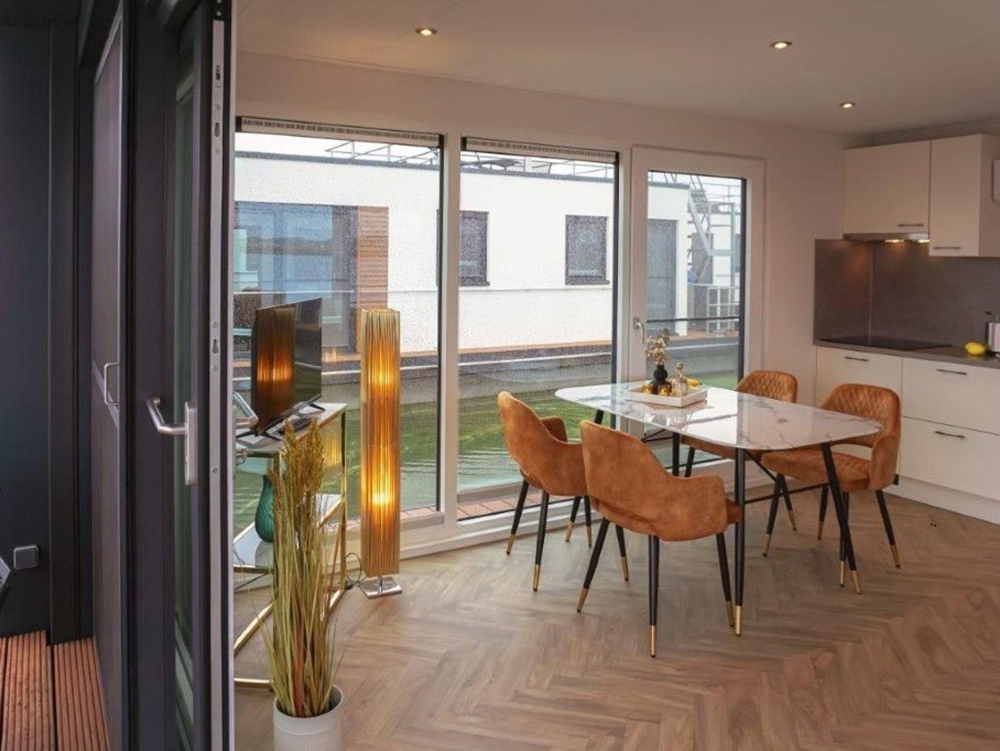 Auf einer Grundfläche von insgesamt etwa 45 m² befinden sich der Wohnraum mit offener Wohnküche, die Terrasse und weitere Lauffläche im Außenbereich des Hausbootes, 2 Schlafzimmer, ein Bad mit Dusche und ein WC mit Waschtisch. Auf der oberen Etage befindet sich die zusätzliche Sonnenterrasse mit Sonnenliege und Loungemöbel. In der Küche finden Sie Kühlschrank mit Gefrierfach, Spülmaschine, Mikrowelle, Kaffeemaschine. Im Wohnzimmer sorgt der Fernseher für Unterhaltung.