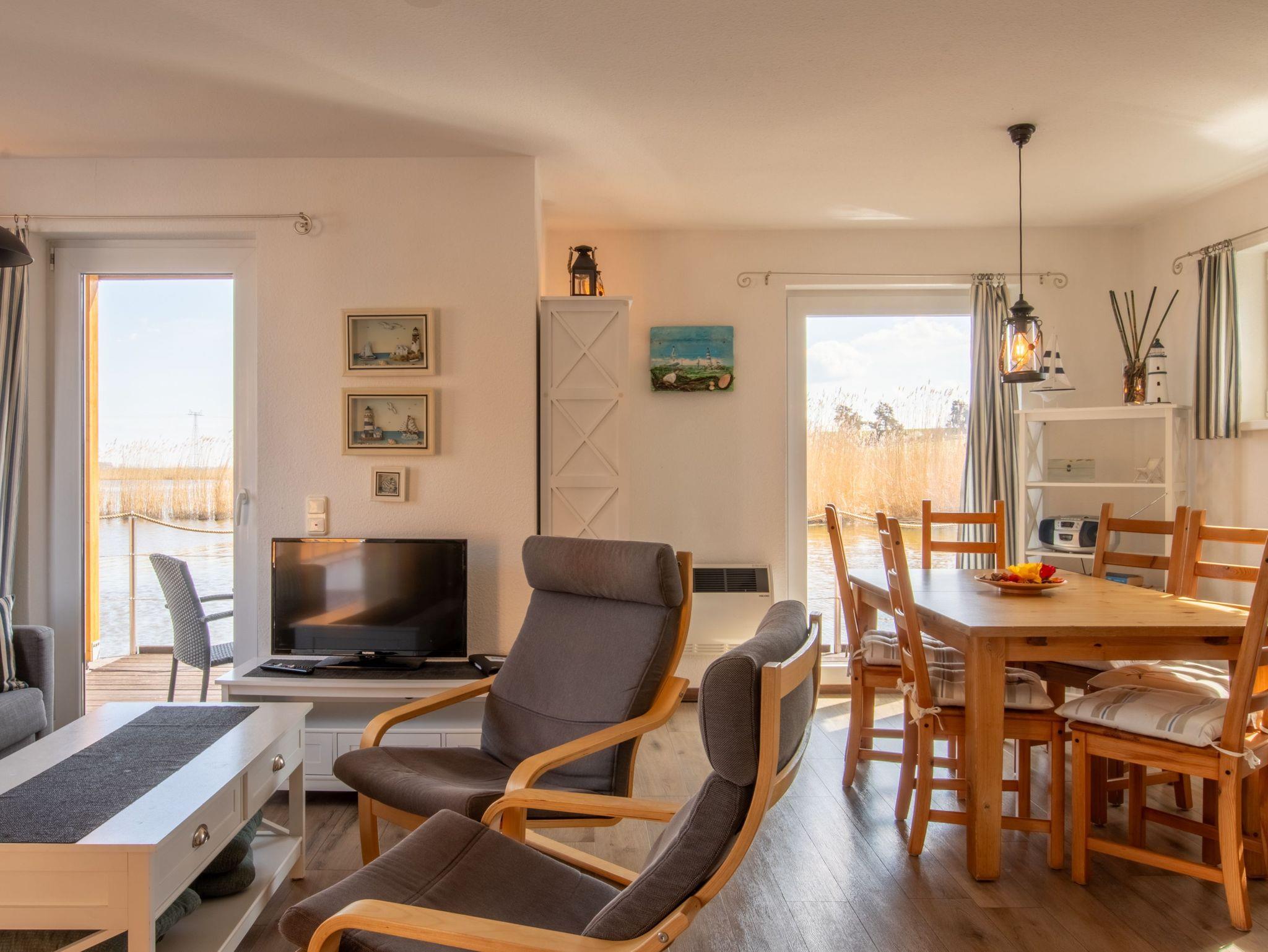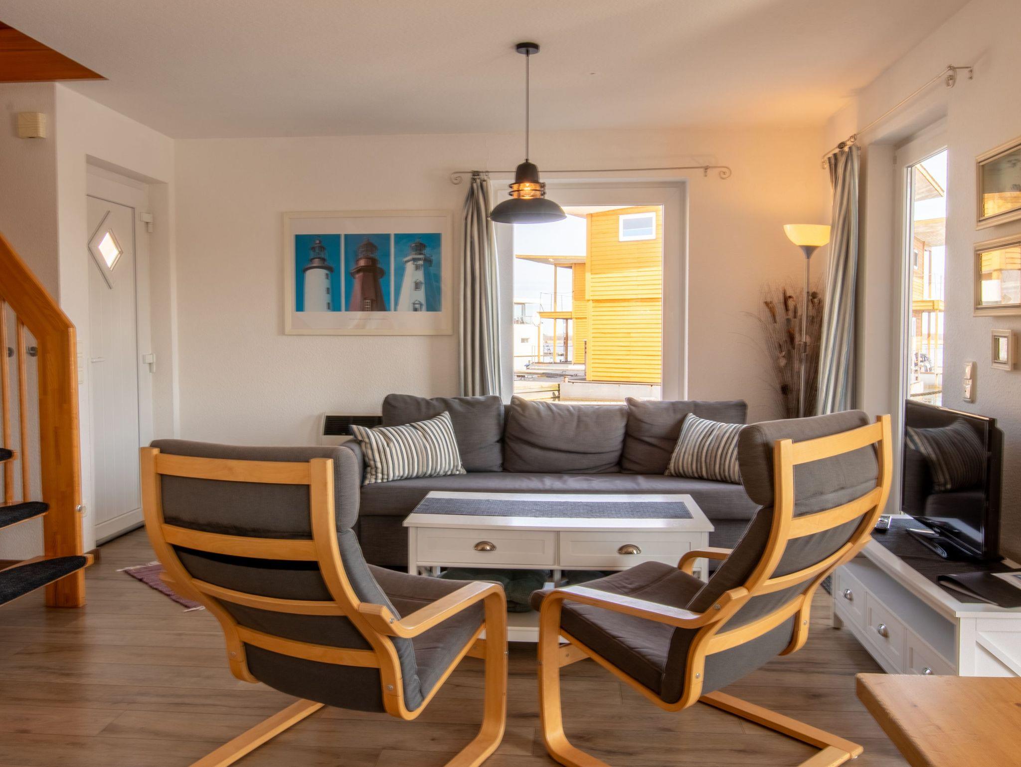 Floating House 5 in Kröslin ist der perfekte Ort für alle, die das Wasser lieben ? und es gern direkt vor der Tür haben. Mit 75 m² Wohnfläche auf zwei Etagen, Platz für bis zu 6 Personen und einem gut erzogenen Hund an deiner Seite, erlebst du hier echten Hausbooturlaub zwischen Natur, Hafenflair und maritimer Freiheit. Im Erdgeschoss empfängt dich ein offener, lichtdurchfluteter Wohnbereich, ausgestattet mit Sofa, Schwing-Sessel und Esstisch für sechs Personen. Große Fenster holen den Hafenblick direkt ins Wohnzimmer ? und machen das Ankommen ganz leicht. Die praktische Küche ist integriert und lässt keine Wünsche offen: Ceranfeld, Backofen mit Grill, Mikrowelle, Geschirrspüler, Kühlschrank, Kaffeemaschine, Toaster und mehr stehen bereit für kulinarische Urlaubsmomente. Oben geht?s gemütlich weiter: Zwei Schlafzimmer mit Doppelbett (180x200) bieten Privatsphäre, das dritte Zimmer mit Schlafcouch (140x200) eignet sich ideal für Kinder oder als kleiner Rückzugsort zum Spielen, Lesen oder Träumen. Von zwei Zimmern gelangst du direkt auf den Balkon, der mit Relax-Liegen zum Sonnen und Durchatmen einlädt. Das Badezimmer bietet Dusche, WC, Spiegelschrank und Kosmetikspiegel. Für Unterhaltung sorgen Sat-TV, CD-Radio und WLAN über das Hafennetz. Beheizt wird das Hausboot über Elektro-Heizkörper in jedem Raum ? ideal für kühlere Tage. Im Außenbereich laden dich zwei Highlights ein: die möblierte Terrasse am Bug, nur wenige Zentimeter über dem Wasser und der Balkon mit Weitblick über die Landschaft rund um den Peenestrom. Wer ein kleines Sportboot (bis 4,5m Länge) mitbringt, kann direkt am Haus anlegen. Die Marina Kröslin bietet dir alles, was das Urlaubsherz begehrt: Gastronomie, Sauna, Spa, Fahrrad- und Bootsverleih, Einkaufsmöglichkeiten und sogar eine kleine Fähre zur Insel Usedom ? perfekt für Tagesausflüge mit dem Rad.