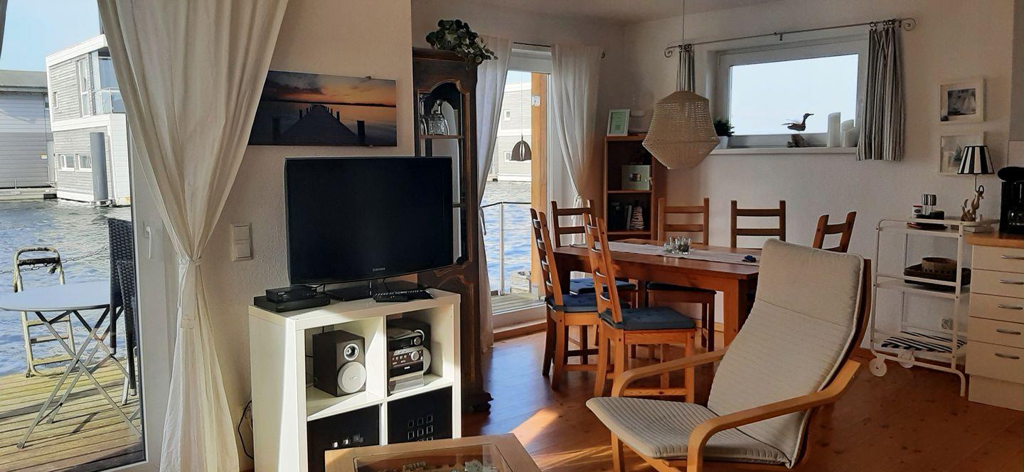 Im 1. Deck befindet sich das geräumige Wohnzimmer mit Essecke und Küchenzeile. Das Wohnzimmer ist modern-maritim eingerichtet mit einem Sofa und Schwing-Sessel mit Hocker-Kombination. Der Esstisch bietet Sitzgelegenheiten für bis zu 6 Personen, ein Kinderhochstuhl steht Ihnen kostenlos zur Verfügung.An das Wohnzimmer schließt sich eine Terrasse an, hier stehen 4 Gartenstühle und ein Tisch für Sie bereit.