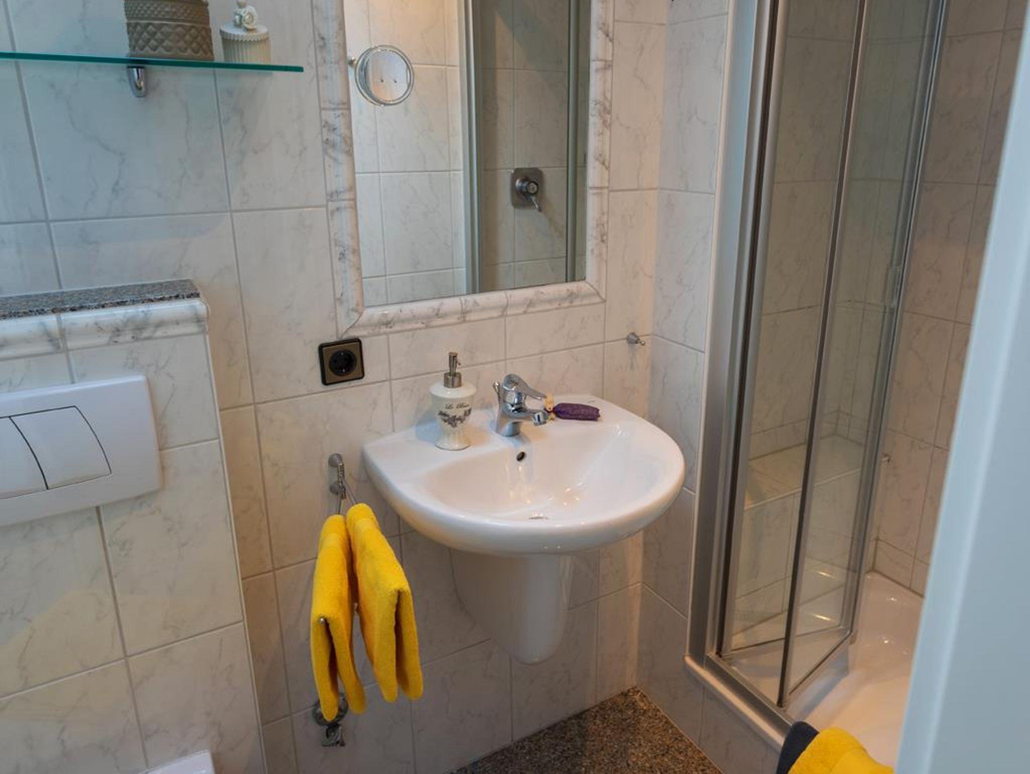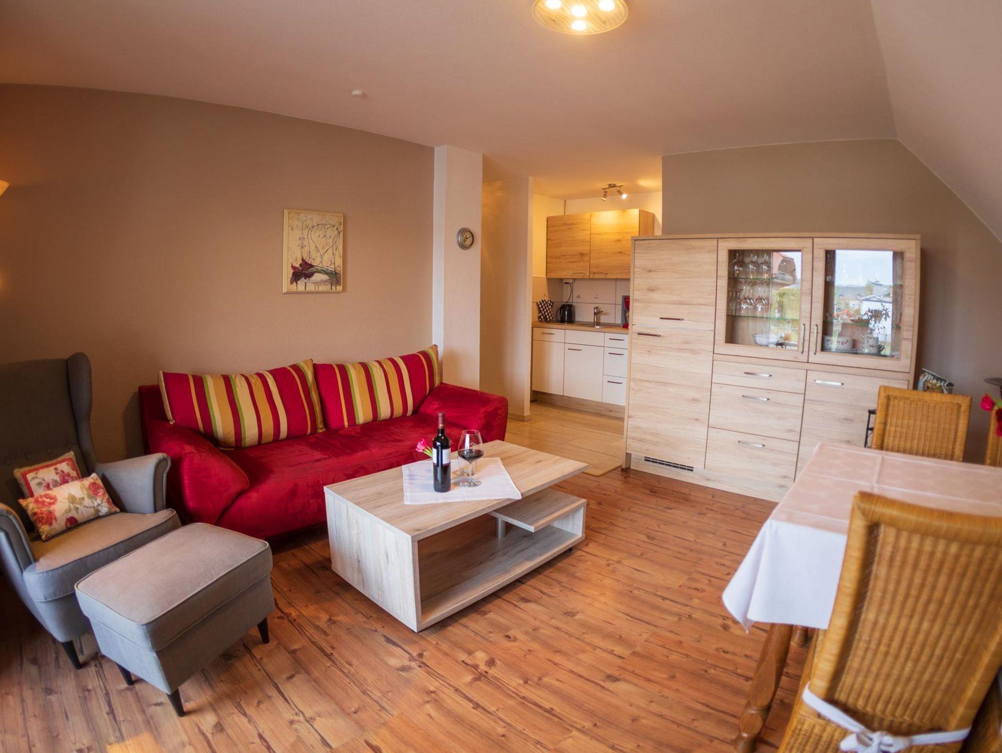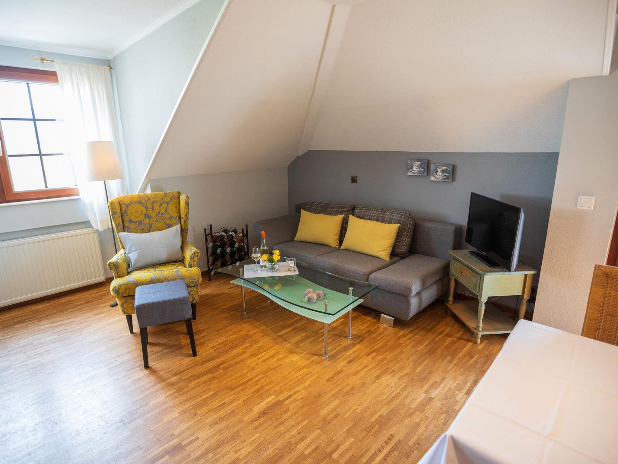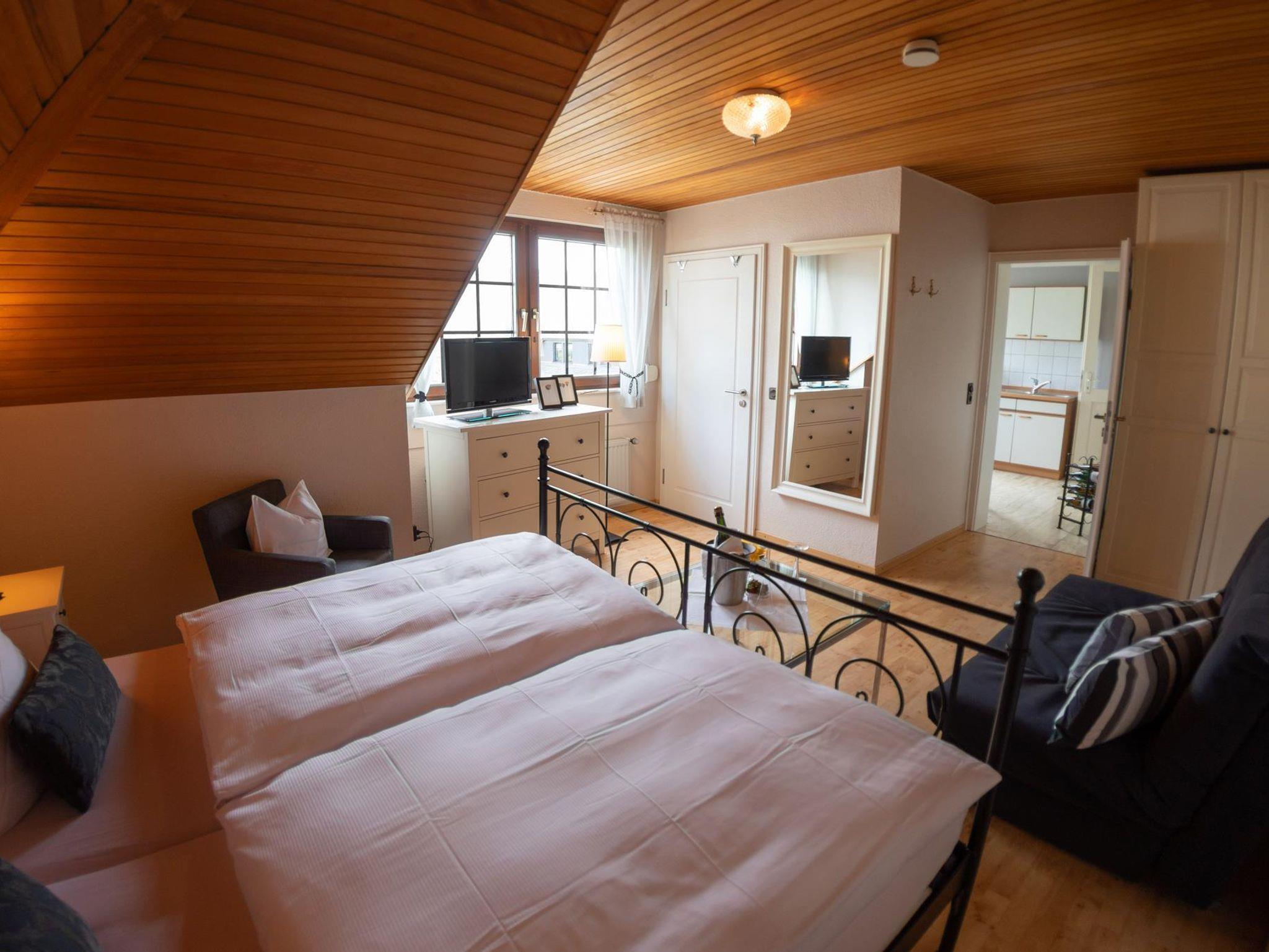 2 Personen. 1 Doppelschlafzimmer mit Zugang zum überdachten Südbalkon.Wohnraum, SAT-TV mit Schlafcouch für dritte Person. Dusche/WC, Föhn und Kosmetikspiegel. Balkon nach Südseite. WLAN kostenlos, abschließbare Fahrradgarage, Parkplatz. 2 Aufladestationen für E-Autos.