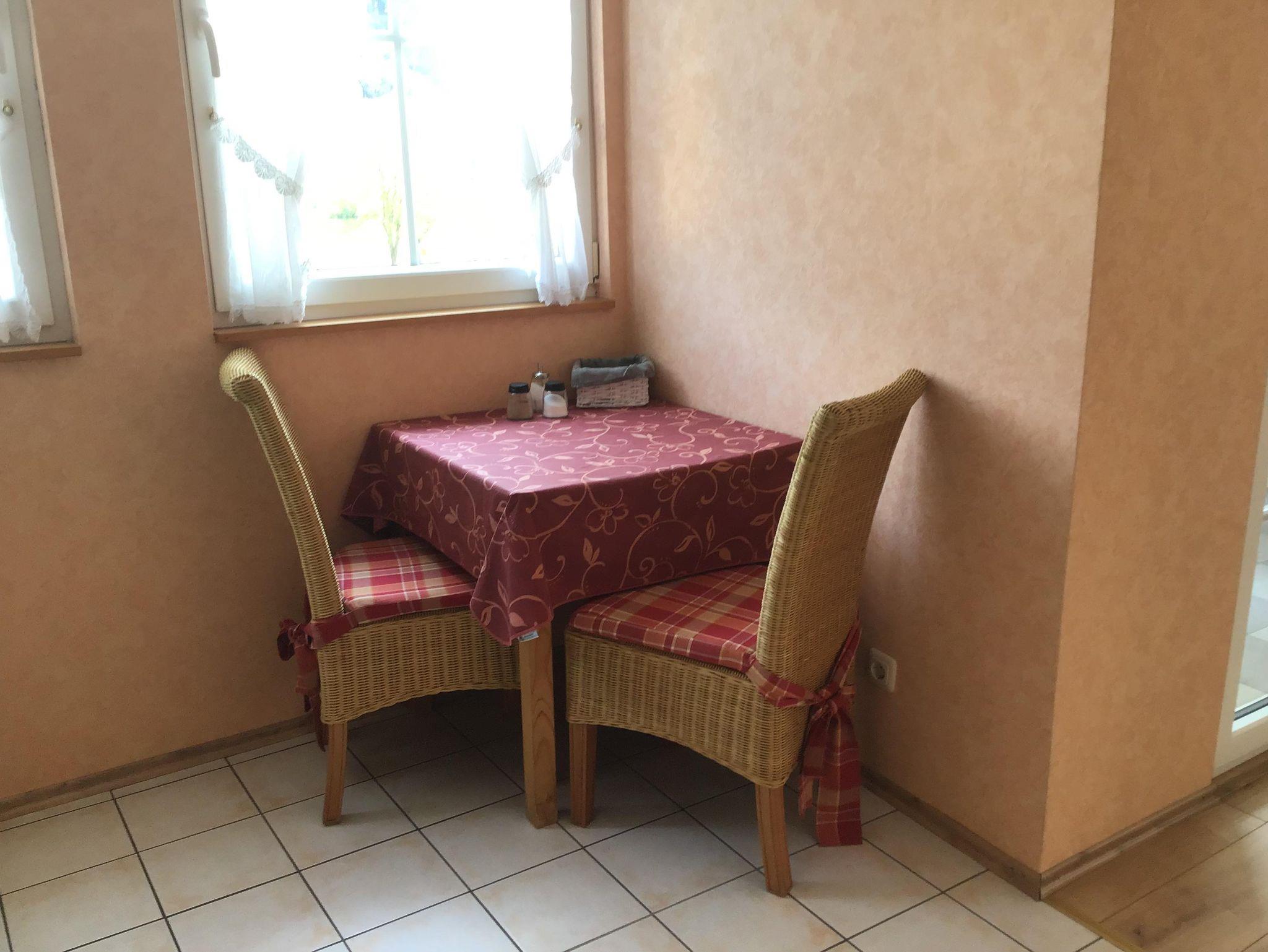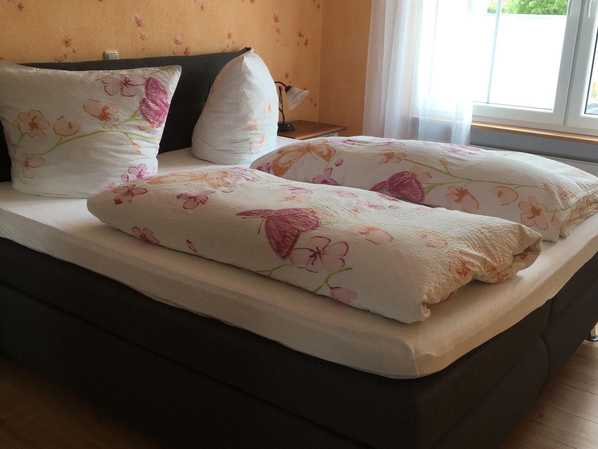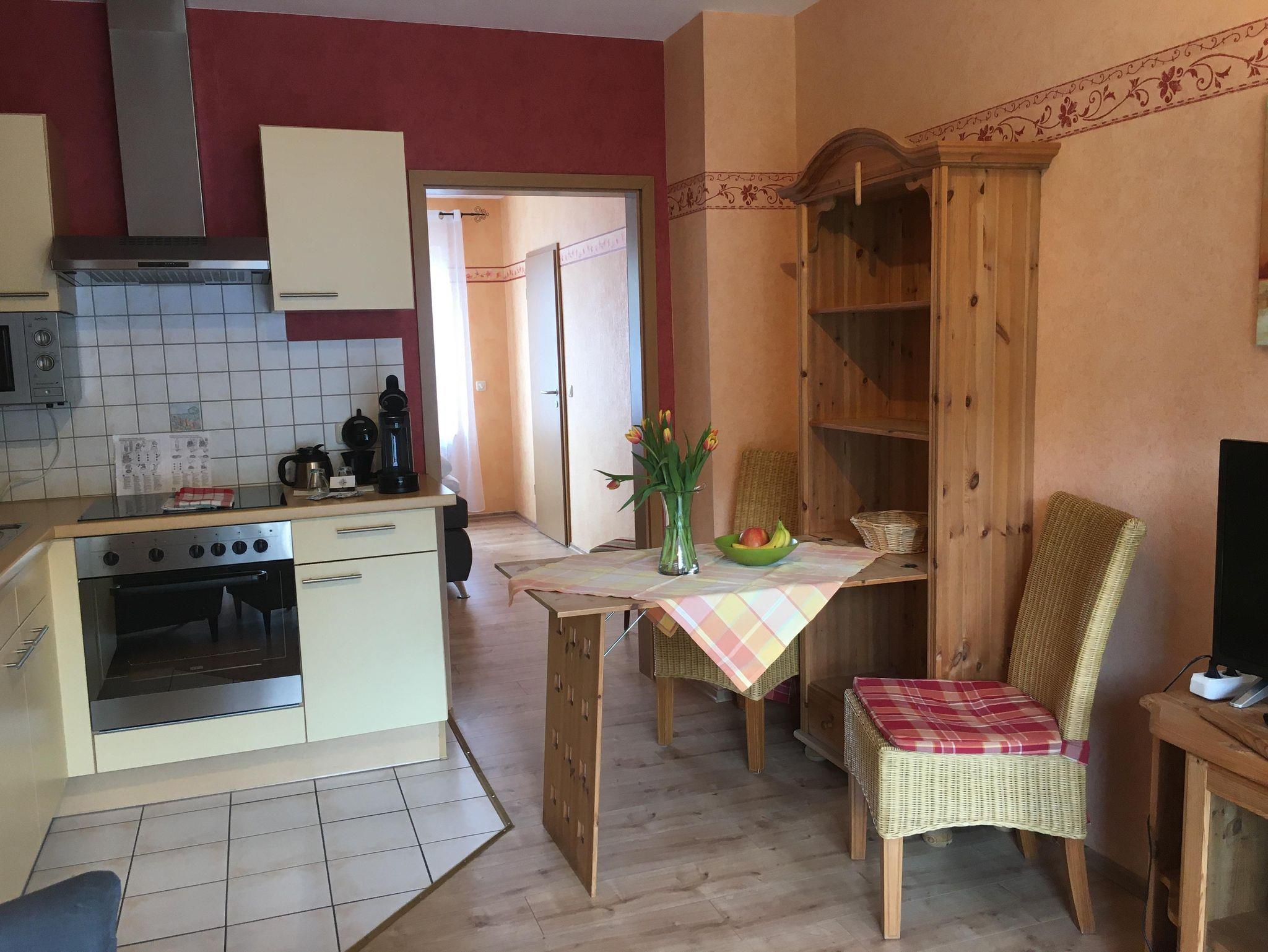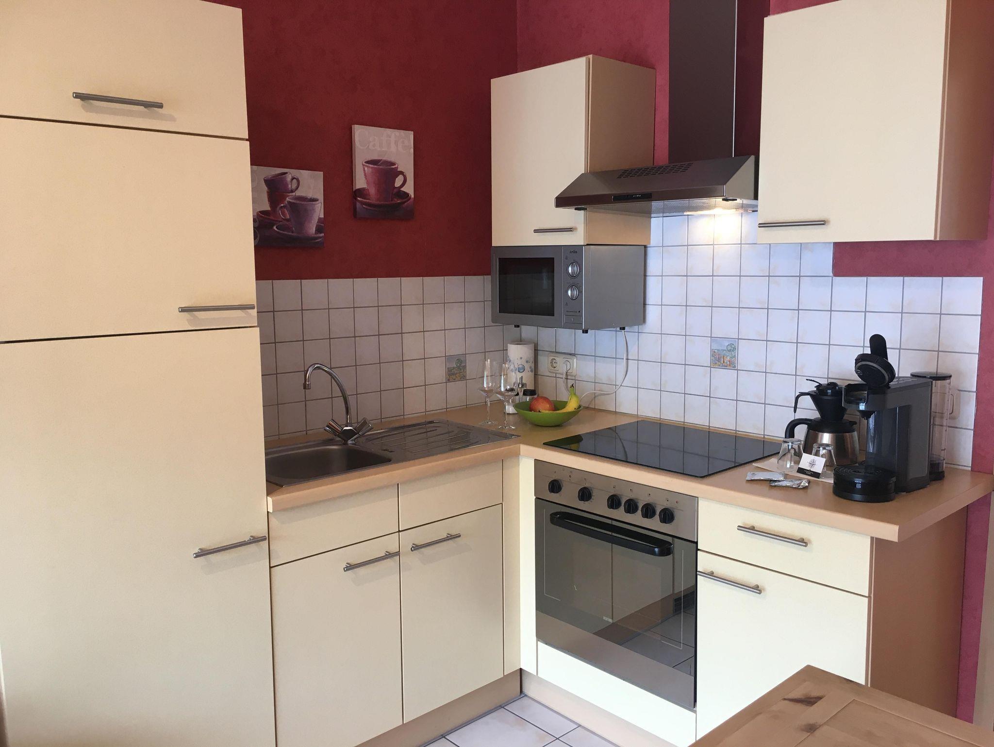 Schöne Ferienwohnung 35qm groß auf der 1 Etage gelegen. Ausgestattet mit 2 gemütlichen Sesseln zum Entspannen. Im Schlafzimmer erwartet sie ein bequemes Boxspringbett. Die komplett eingerichtete Küche verfügt über ein Ceranfeld, Backofen, Mikrowelle, Kühlschrank mit kleinem Gerierschrank.