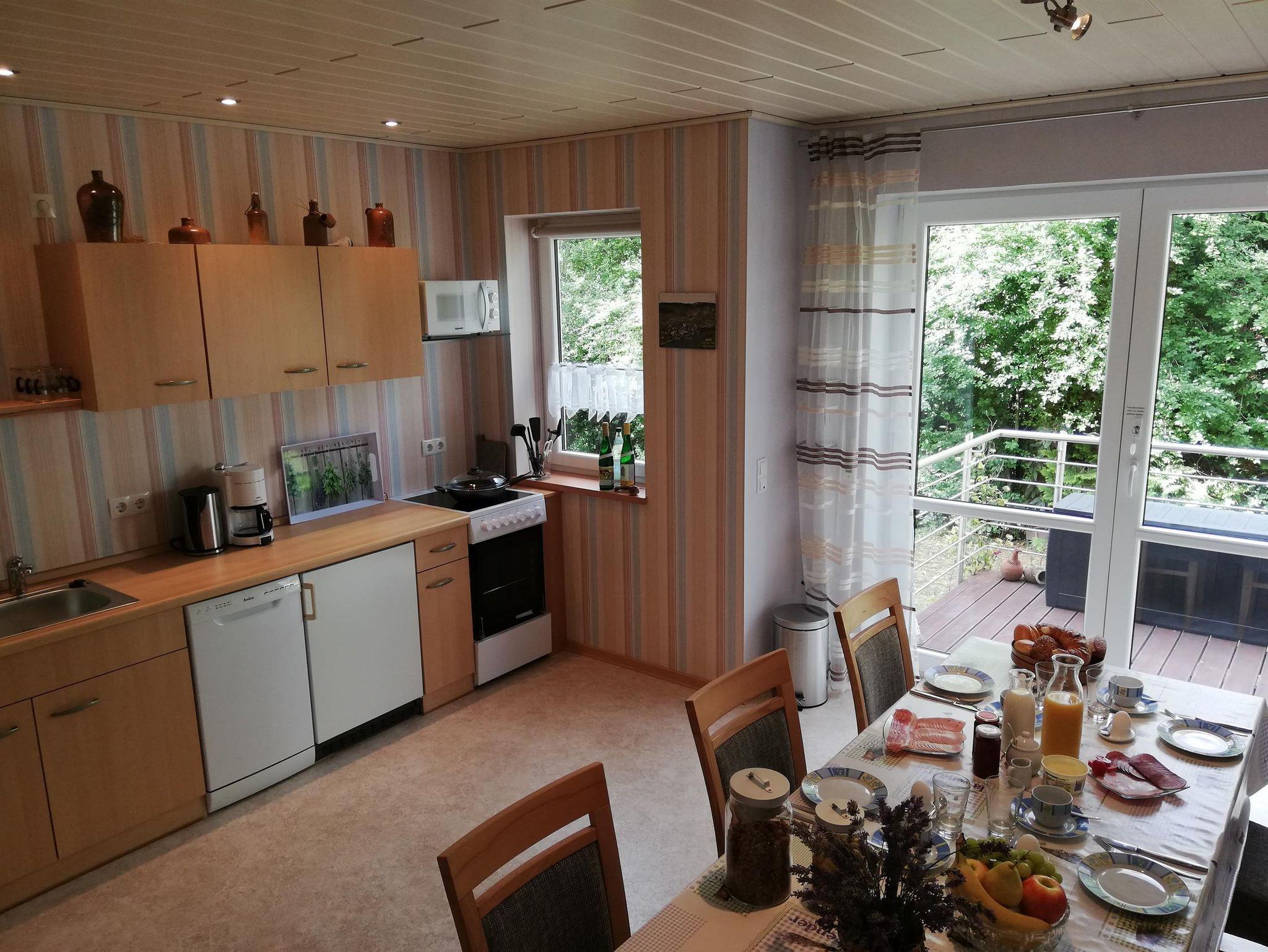 Die Wohnung befindet sich im 1. Stock unseres Gästehauses. Der Küchen-/Essbereich ist mit Ceran-Kochfeld, Backofen, Kühlschrank, Geschirrspülmaschine, Mikrowelle, Toaster, Wasser- & Eierkocher, Kaffeemaschine und ausreichend Geschirr komplett eingerichtet. Zu dieser Wohnung gehört ein Schlafzimmer mit Wohnbereich. Ein zusätzliches Schlafzimmer kann bei 3er oder 4er Belegung dazu gebucht werden. Beide Schlafzimmer sind ausgestattet mit je einem Doppelbett, Kleiderschrank, Sat-TV und Radiowecker. Jedes Schlafzimmer besitzt ein eigenes Bad mit Dusche, Toilette, Föhn, Kosmetikspiegel und Handtücher. Die Wohnung hat einen eigenen Gartenbereich mit Sitzecke und direkten Zugang aus der Küche. Entspannung finden Sie in unserem großzügigen Garten mit Blick in die Weinberge.