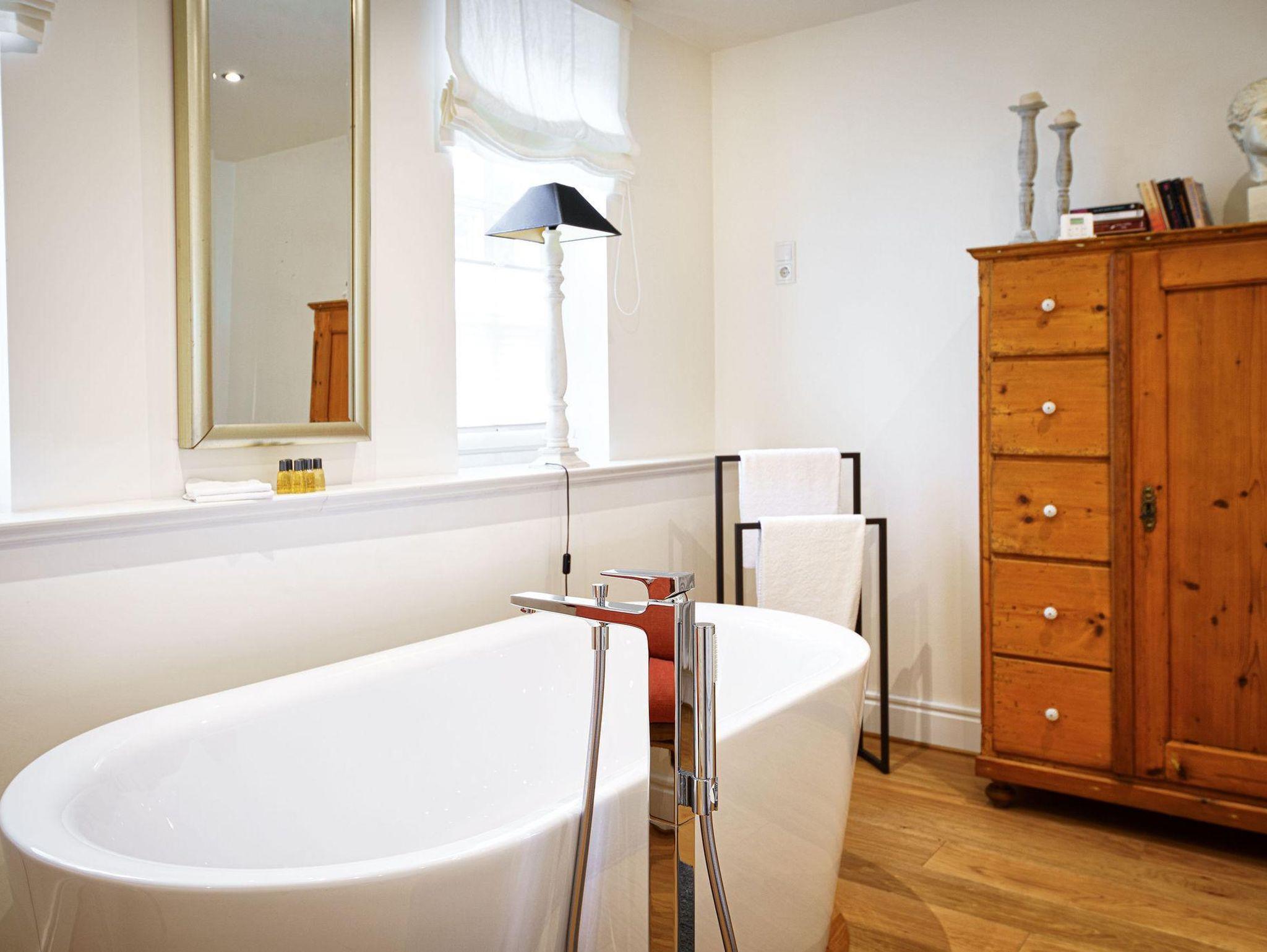 modern eingerichtete Suite mit Balkon und Moselblick, 1 Bad mit Badewanne DU/WC, Haartrockner, Kosmetikspiegel, Pflegeprodukte, 1 Schlafzimmer mit Boxspringbett und Flachbild- TV, 1 Wohnraum mit gemütlicher Sitzecke und Flachbild-TV, Minibar,kostenfreies W-LAN, Verwöhn Frühstück vom Buffet.