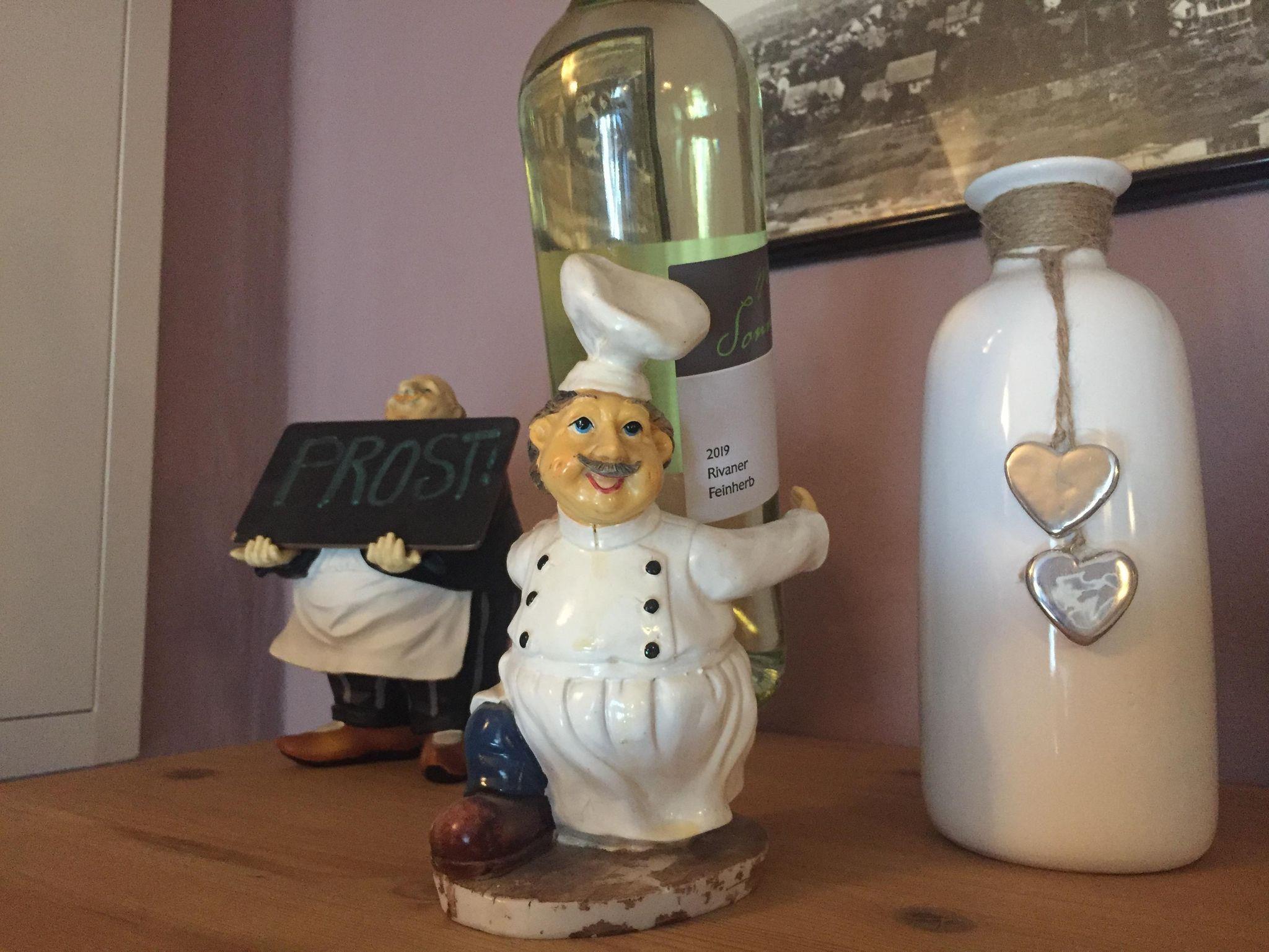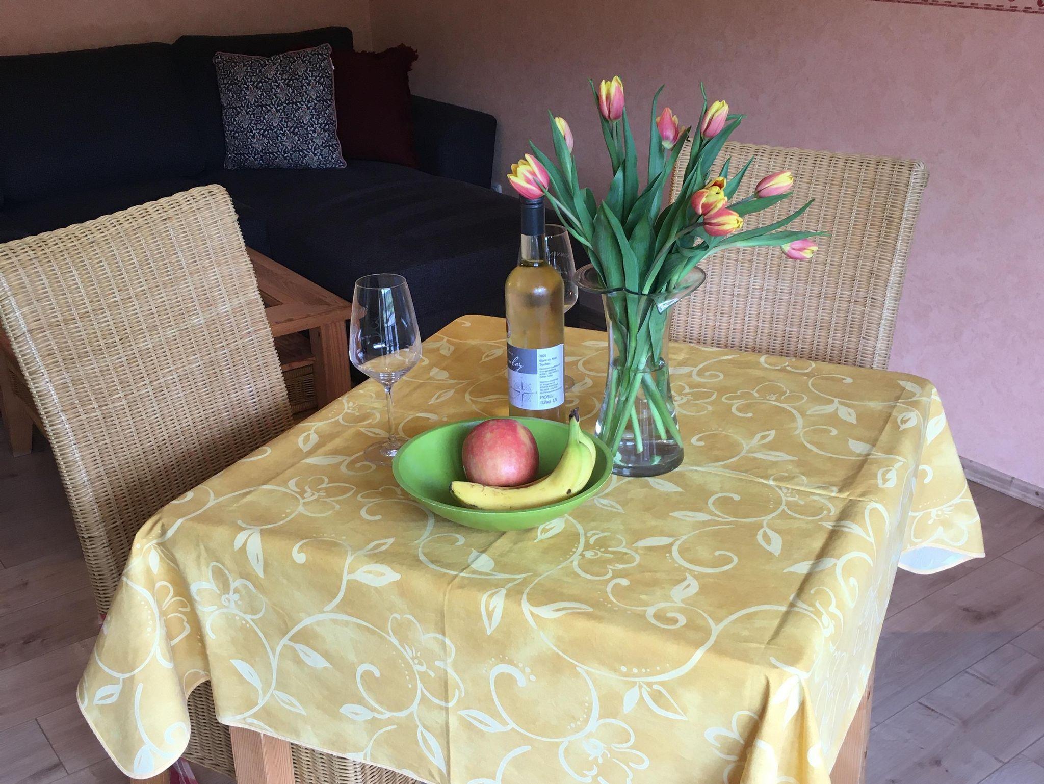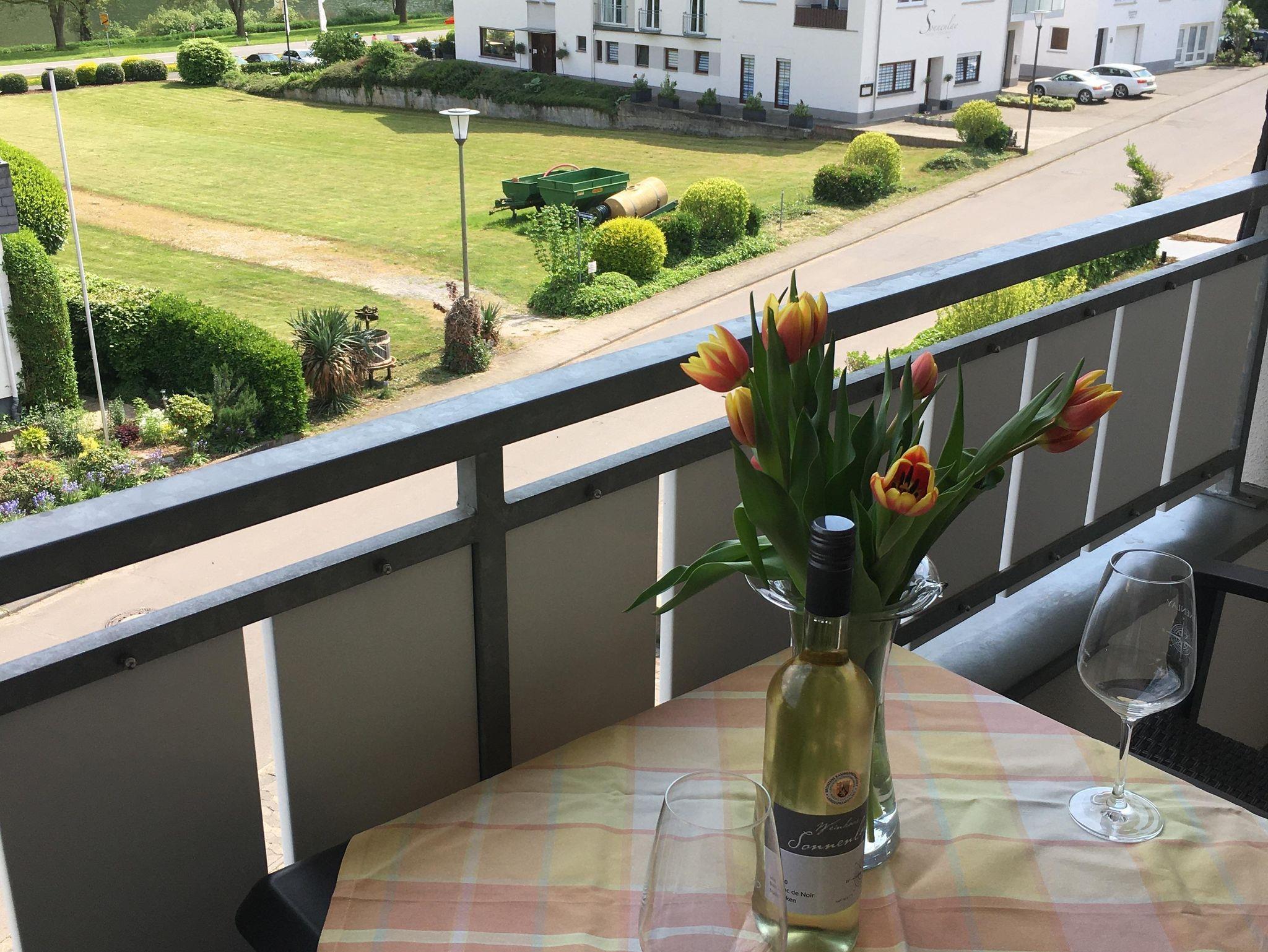Die 40qm große Feriewohnung auf der 2 Etage hat eine eigene überdachte Terasse auf der sie bei Wind und Wetter die Moselduft genießen können. Im hellen Schlafzimmer befindet sich ein bequemes Boxspringbett. In der vollausgestatteten Küche mit Ceranfeld und Backofen, Mikrowelle und Kühlschrank mit Gefrierfach.
