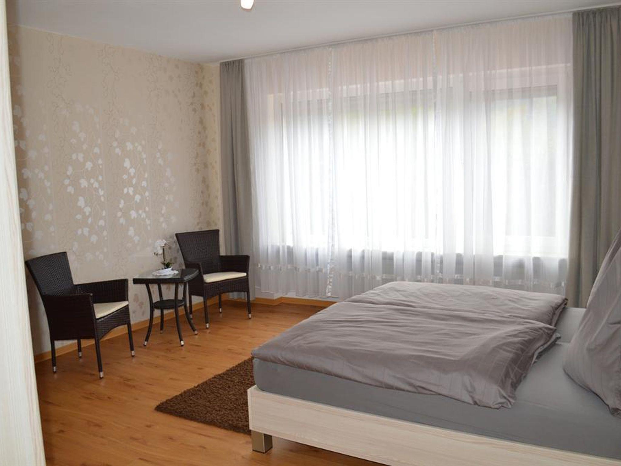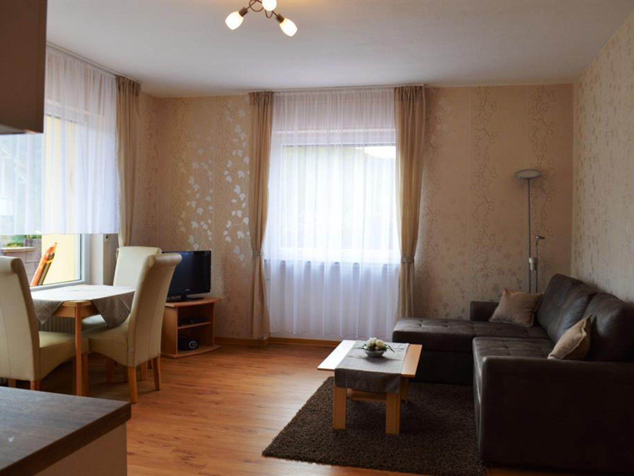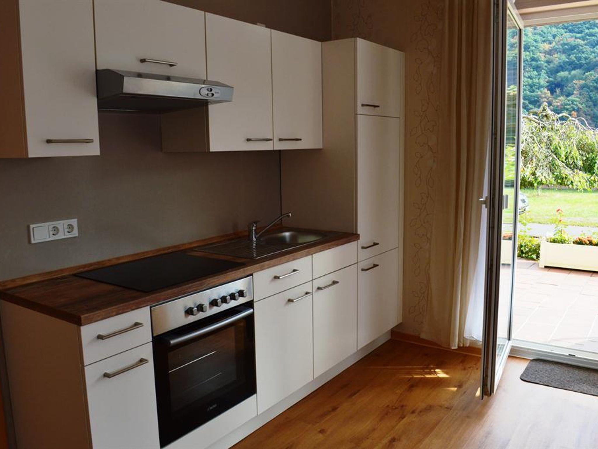 Neue Ferienwohnung - Parterre (für 2-3 Personen) mit Terrasse und tollem Blick zum Wolfer Kloster und zum Felssturz, großer Wohnbereich mit ausziehbarer Schlafcouch für eine weitere Person, Essecke, SAT-TV, Radio mit CD-Player, gut ausgestattete Küche mit Backofen und Ceranfeld, großes Badezimmer mit ebenerdiger Dusche und WC, Fön, 1 getrenntes Schlafzimmer (Bett mit verstellbaren Lattenrosten). Vermietung ganzjährig. Bettwäsche und Handtücher inklusive.