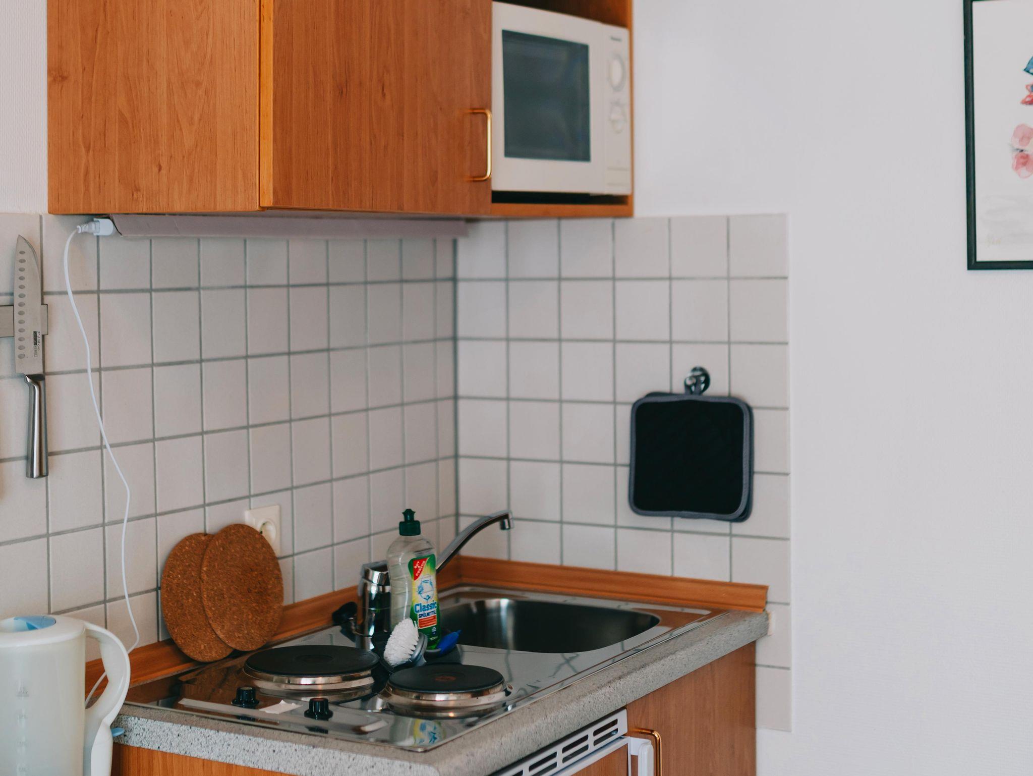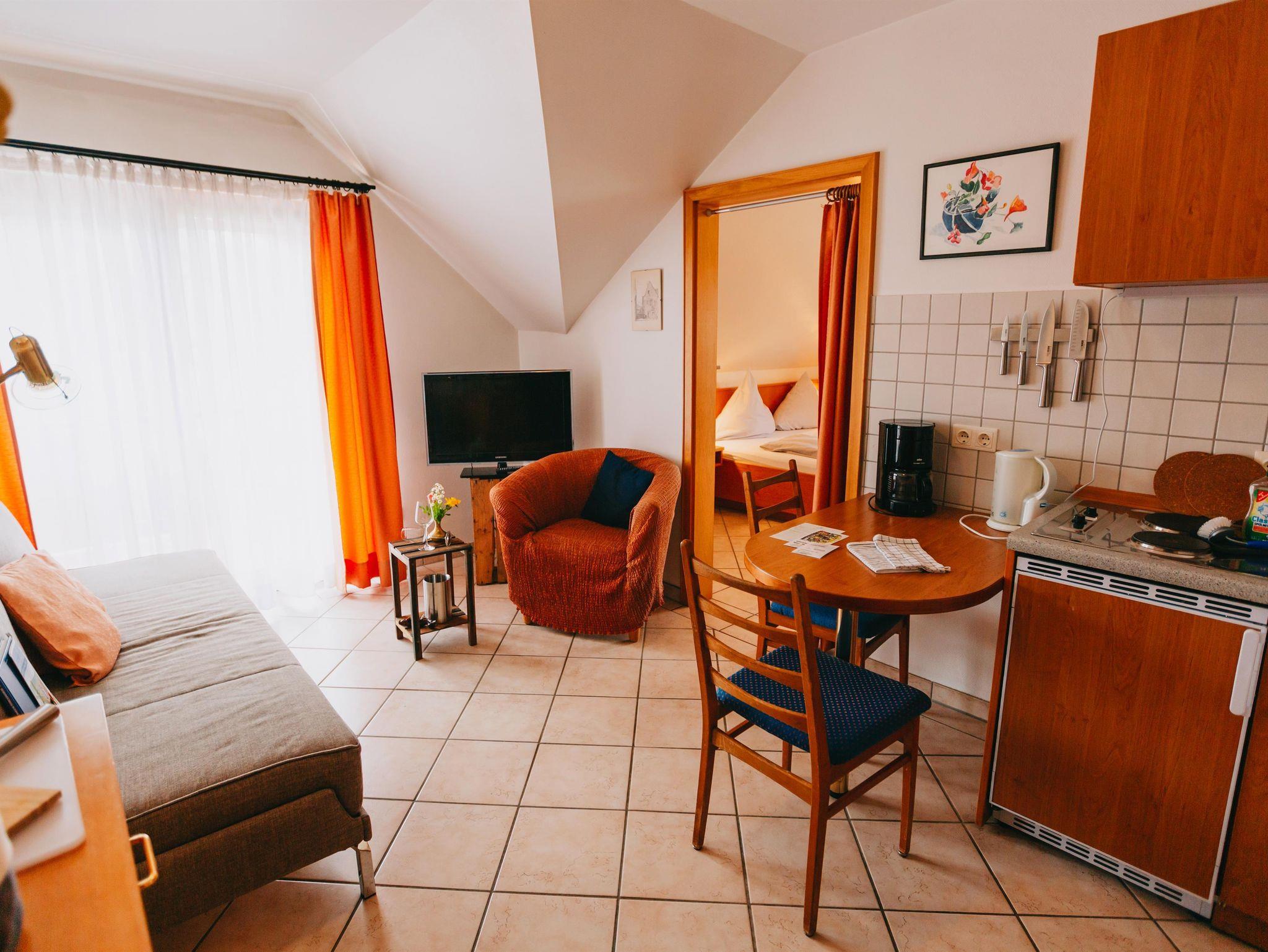 Gemütliches, modernes Appartment auf ca. 35m². Schlafzimmer mit Doppelbett, Schlafcouch für eine weitere Person im Wohnbereich, Badezimmer mit Du/WC, Küchenzeile.