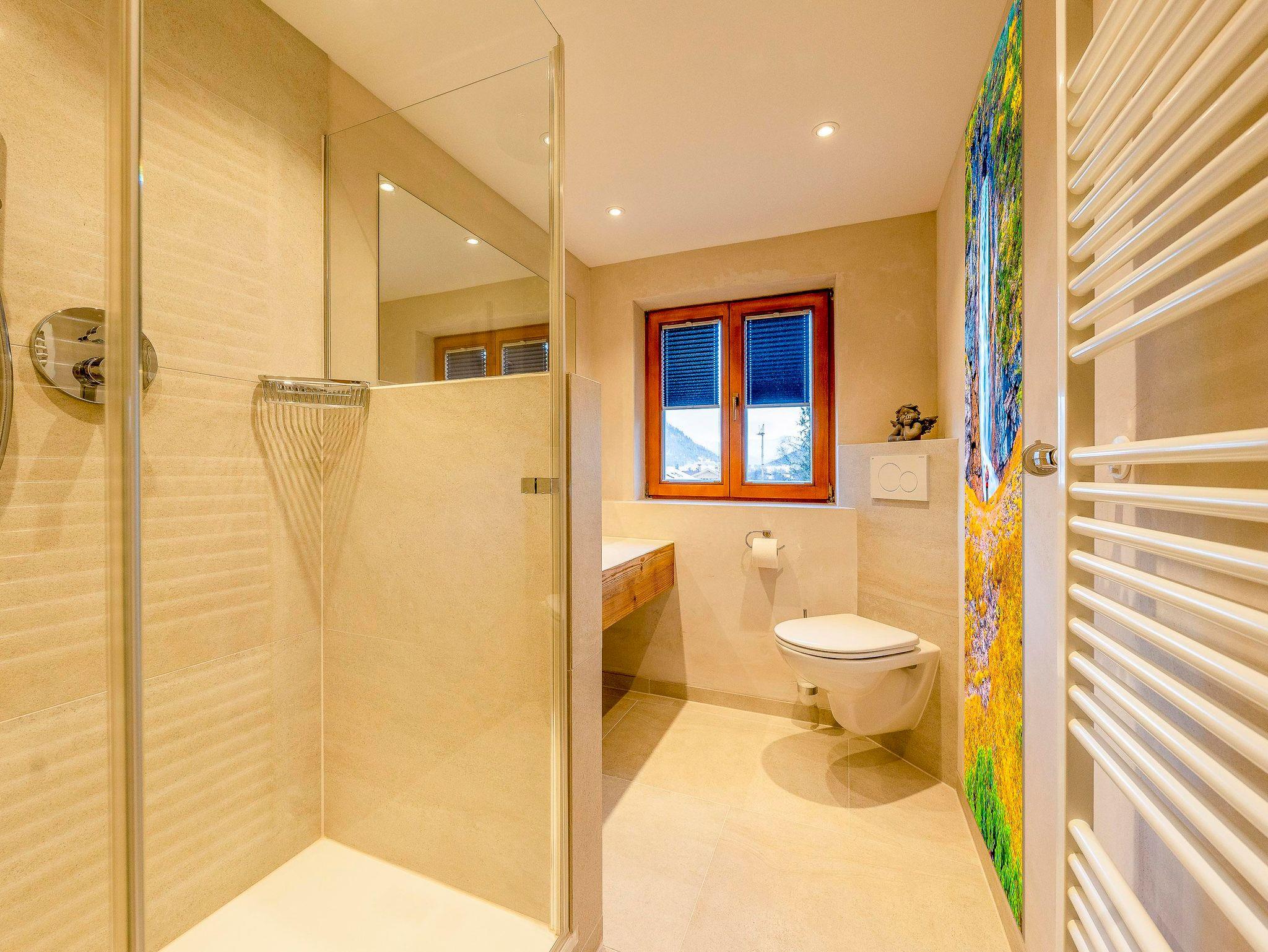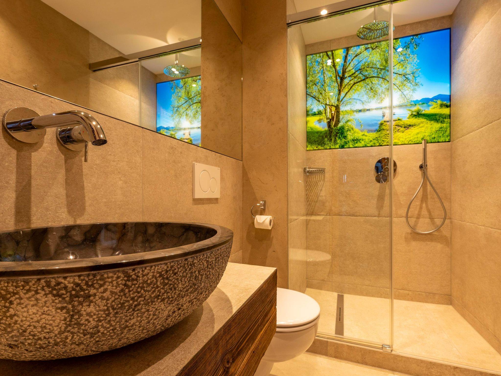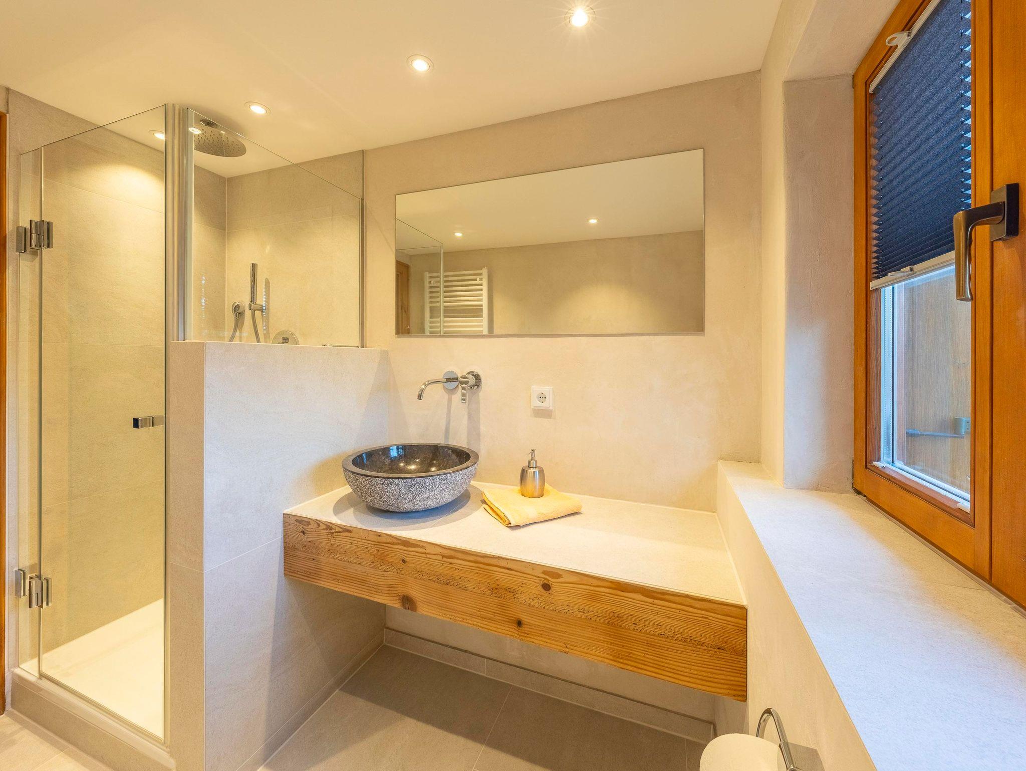 Im stilvollen Badezimmer erwarten Sie ein exklusives Naturstein-Waschbecken und eine großzügige Regendusche – ideal, um nach einer genussvollen Wanderung frische Energie zu tanken.