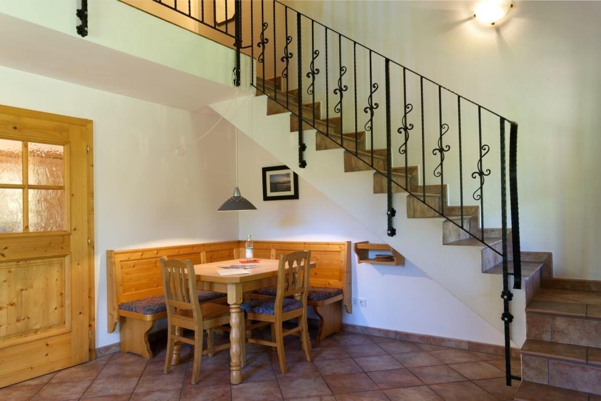 Die Wohnung im 1. Stock hat einen eigenen Eingang über eine private Außentreppe.Sie gelangen direkt in die Küche mit Küchenzeile mit 4 Kochplatten und Spülmaschine, hier ist auch das Gäste-WC. Durch eine Tür gelangen Sie in den großzügigen Ess- und Wohnbereich, der sich zur Galerie nach oben öffnet. Das gemütliche Schlafzimmer mit Doppelbett, und Ensuite-Bad mit DU/WC liegt auf der Galerie und ist über diese begehbar. Der große Balkon mit gemütlichem Mobiliar lässt ab mittags die Sonne mit Blick ins Grüne genießen. Sie nutzen einen Stellplatz im Carport. Die Wohnung kann zusammen mit dem Ferienhaus "Hirschwiesn" gebucht werden und bildet dann ein großzügiges Urlaubsrefugium für insgesamt 8 Personen.
