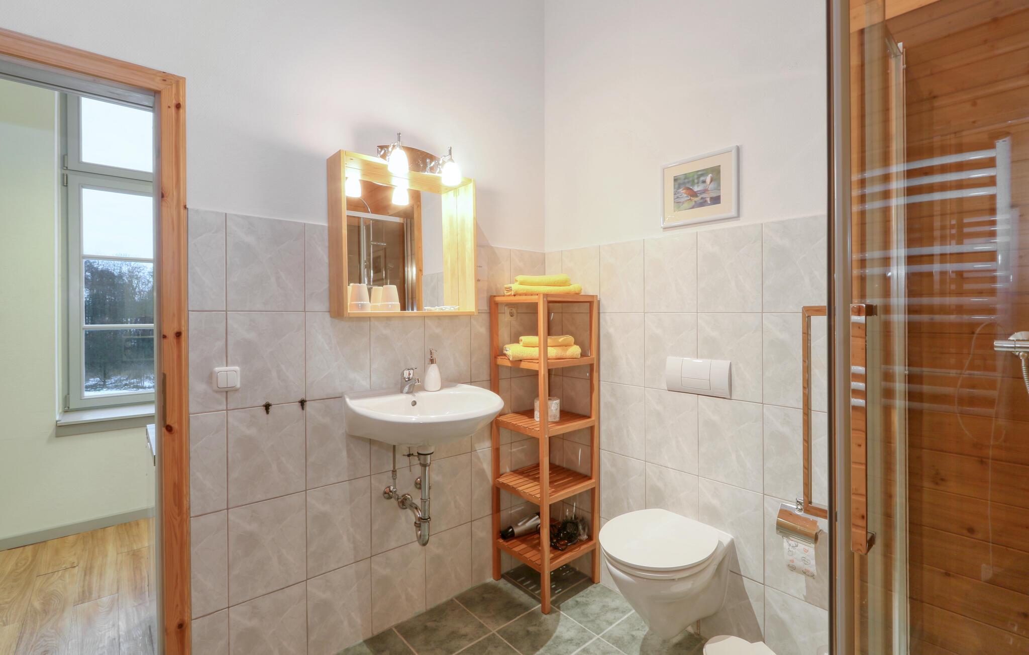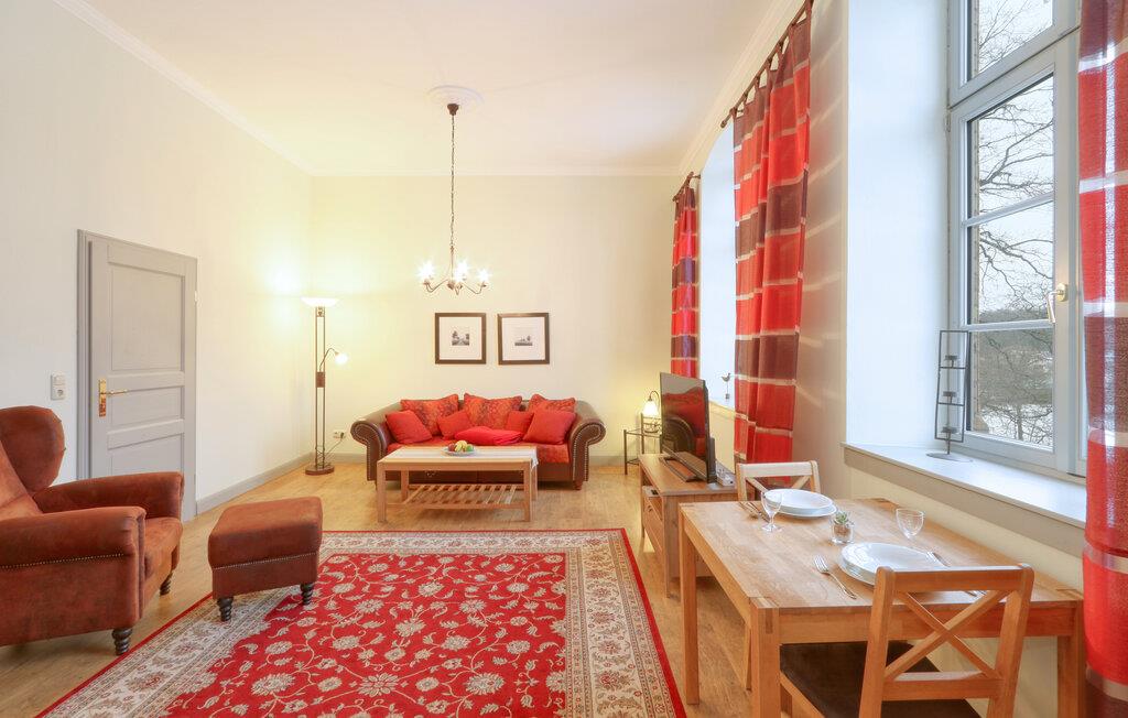Slottet ligger i hjertet af Mecklenburgs søområde, der grænser op til naturparkerne Nossentiner og Schwinzer-heden med den imponerende flora og fauna. Lejligheden er indrettet med soveværelse, køkken, stue og badeværelse.