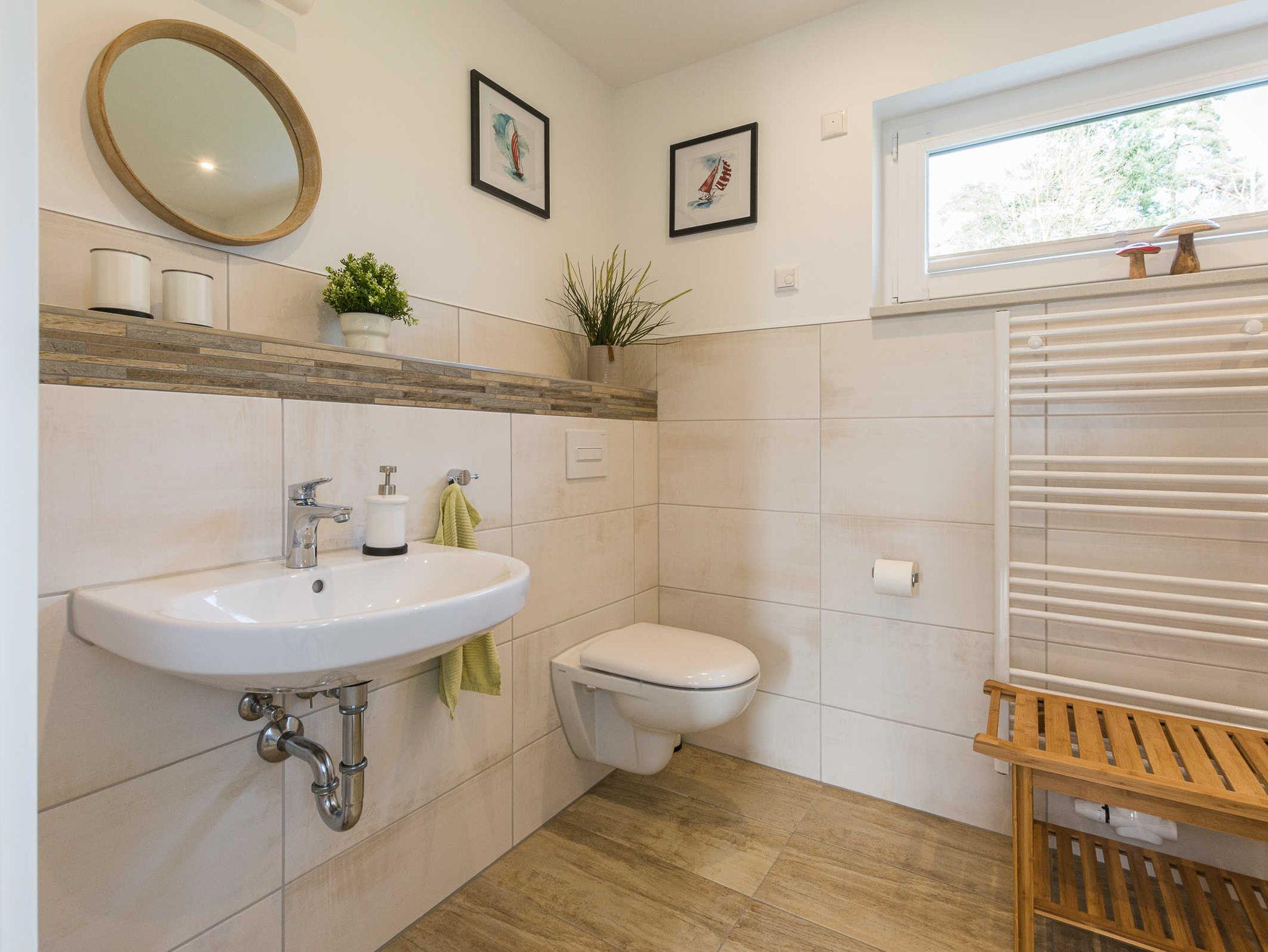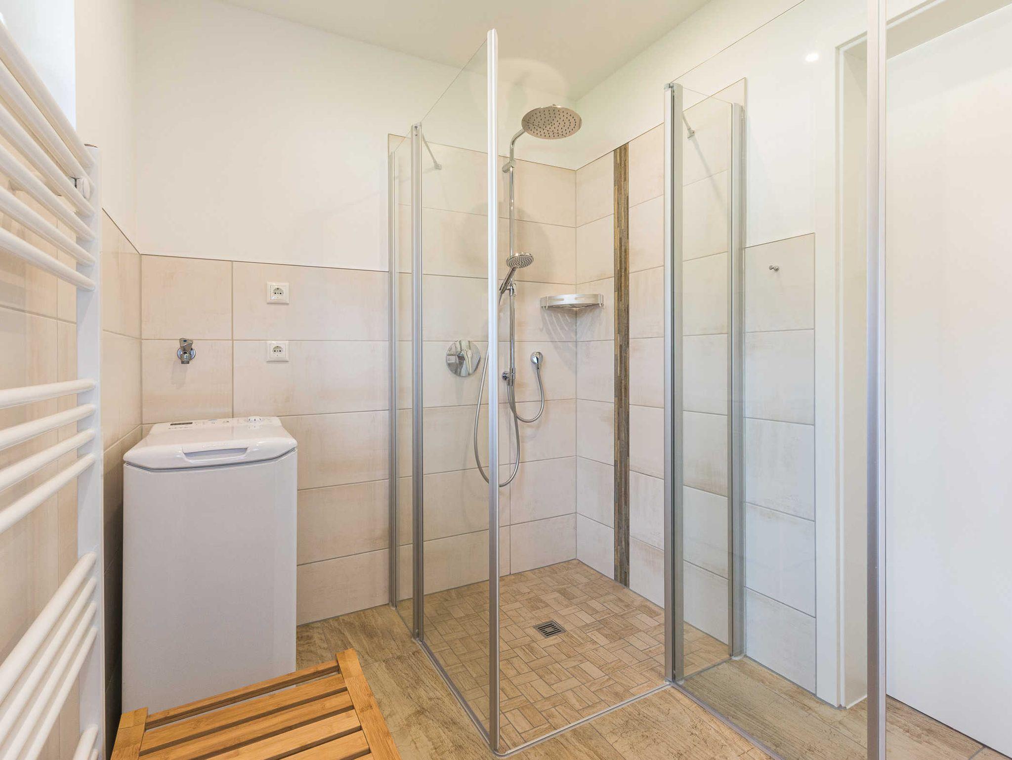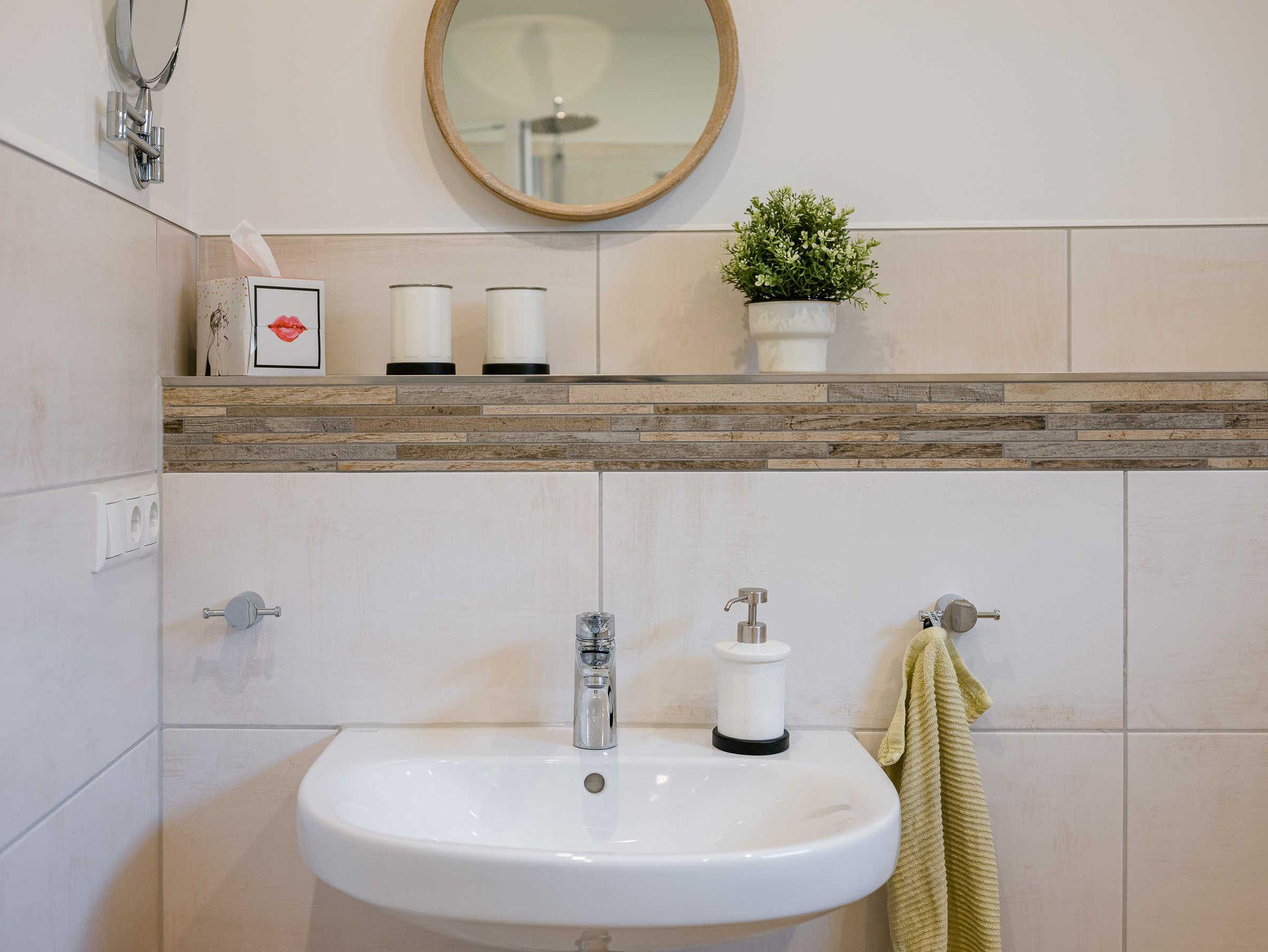 ebenerdige Dusche, WC, Waschtisch, Handtuchtrockner, Föhn, Waschmaschine