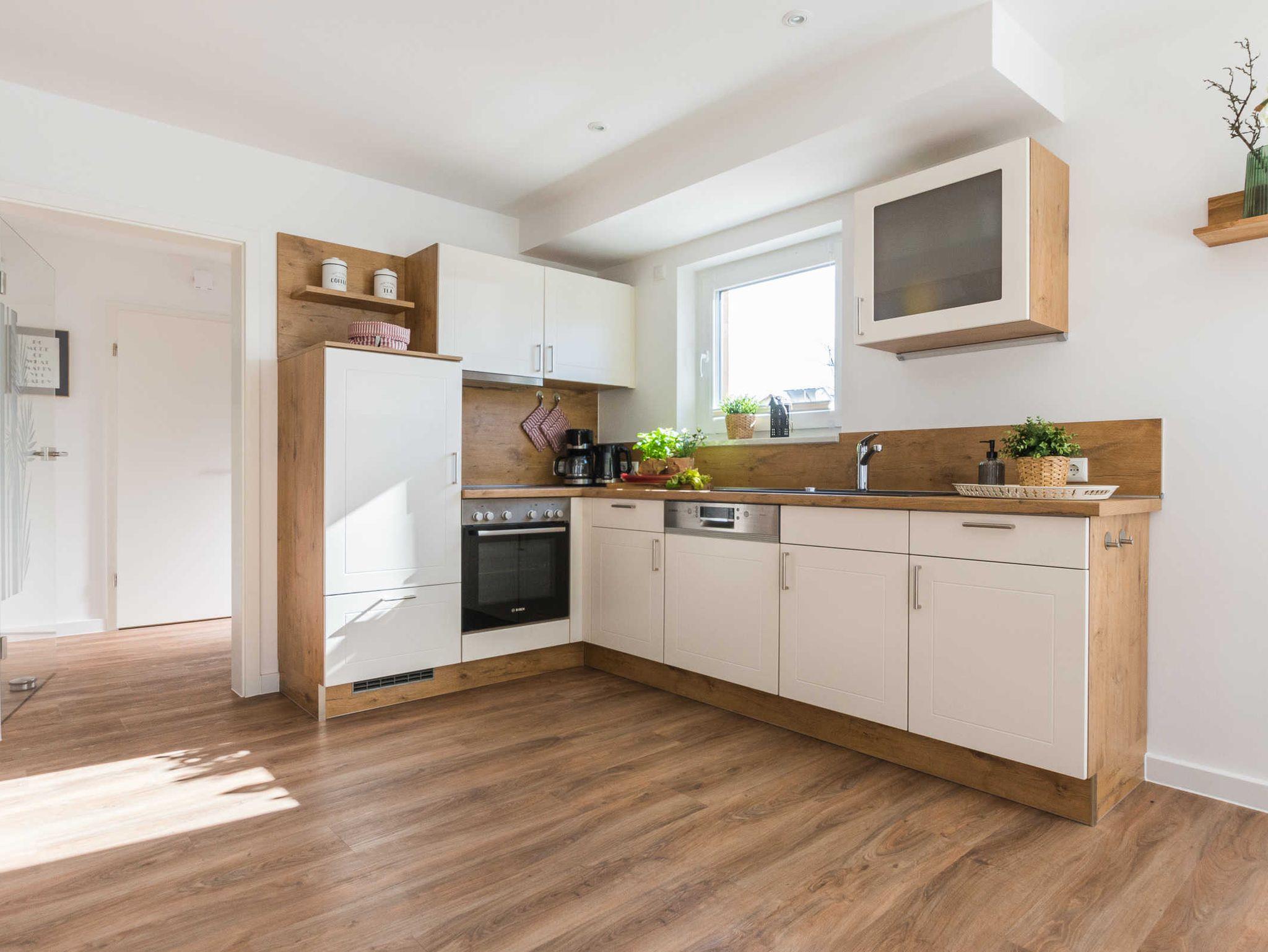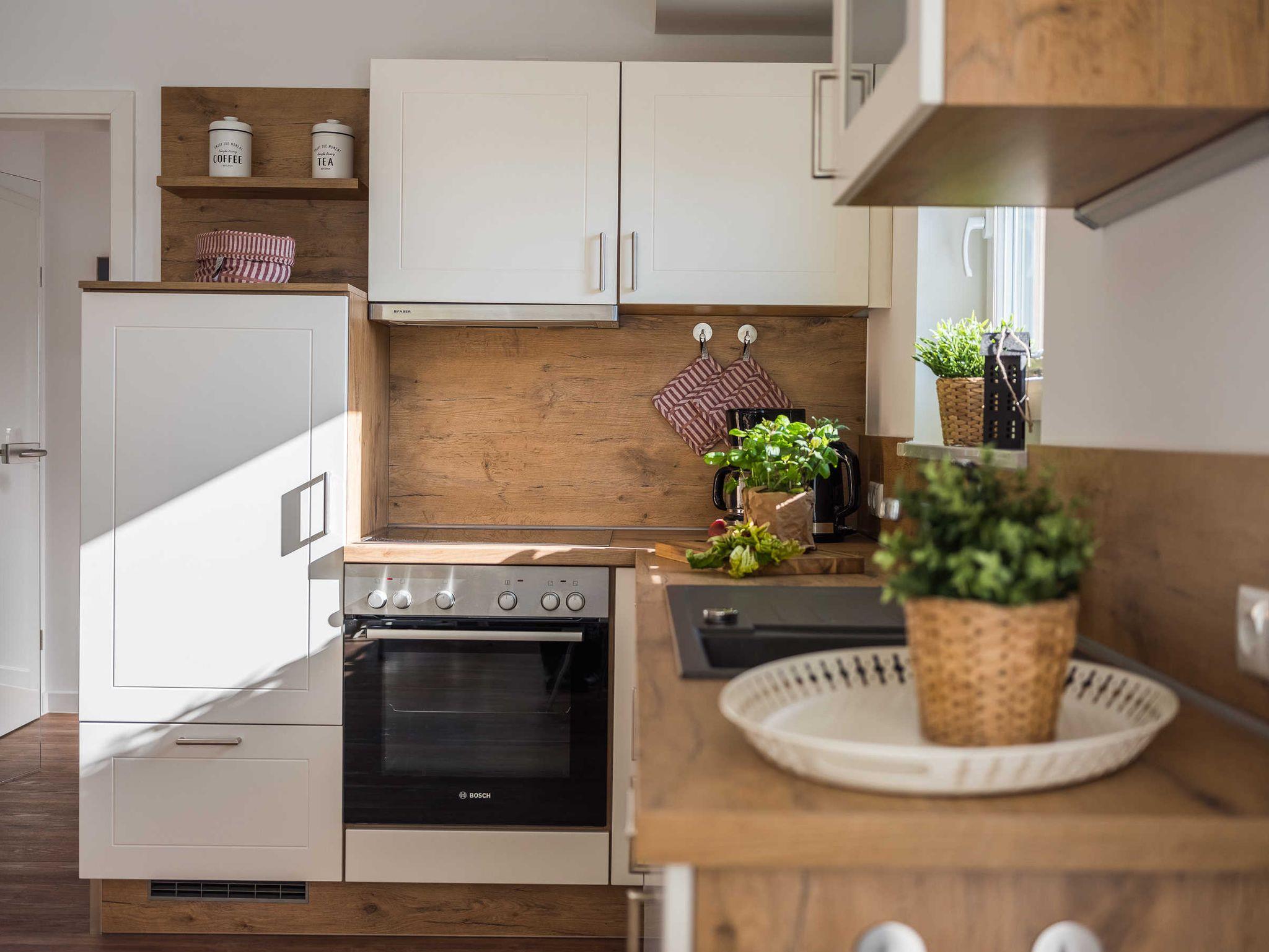 moderne, offene Küche mit Kaffeemaschine, Wasserkocher, Toaster, Kühlschrank, Gefriereinheit, Dunstabzugzhaube, Cerankochfeld mit Backofen, Geschirrspüler, Uhr, Radio