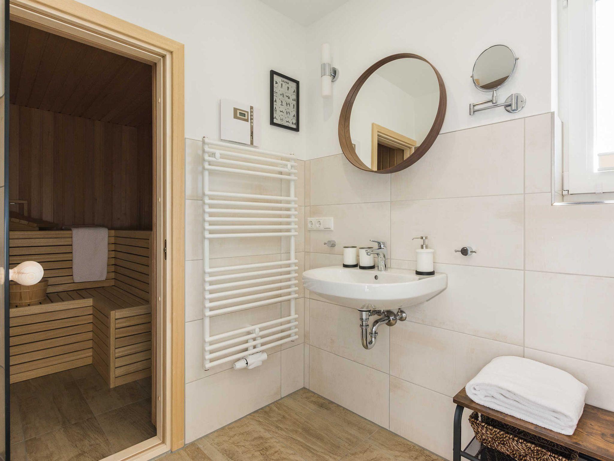 Dusche, WC, Waschtisch, Handtuchtrockner, Föhn, Sauna für 4 Personen