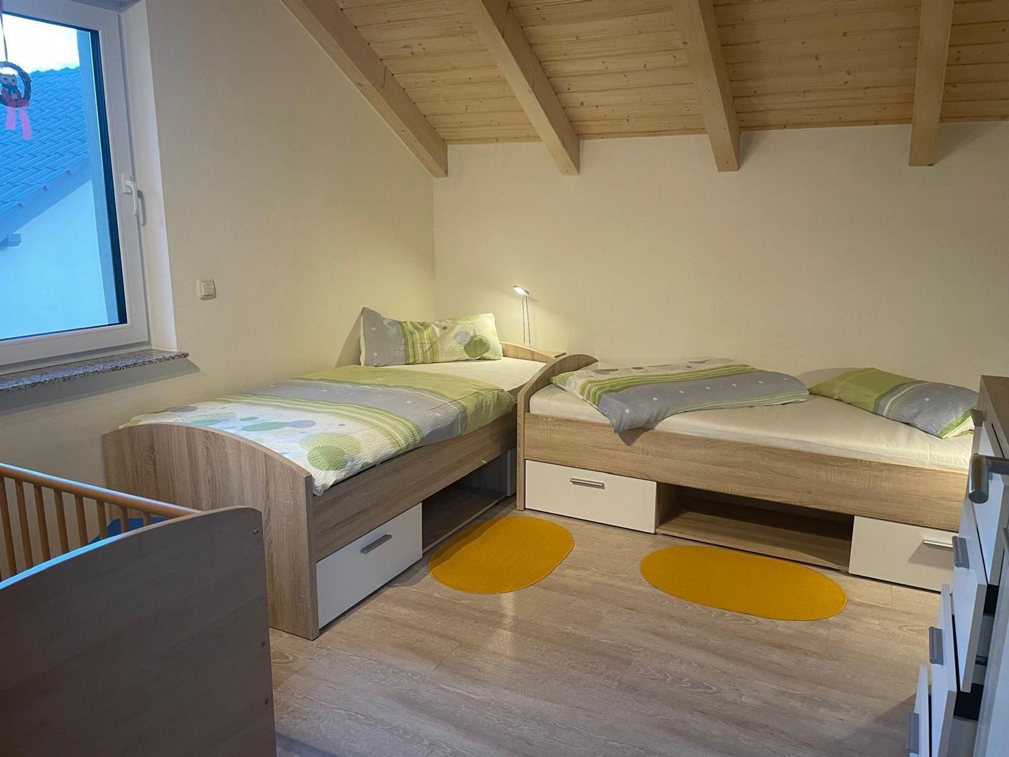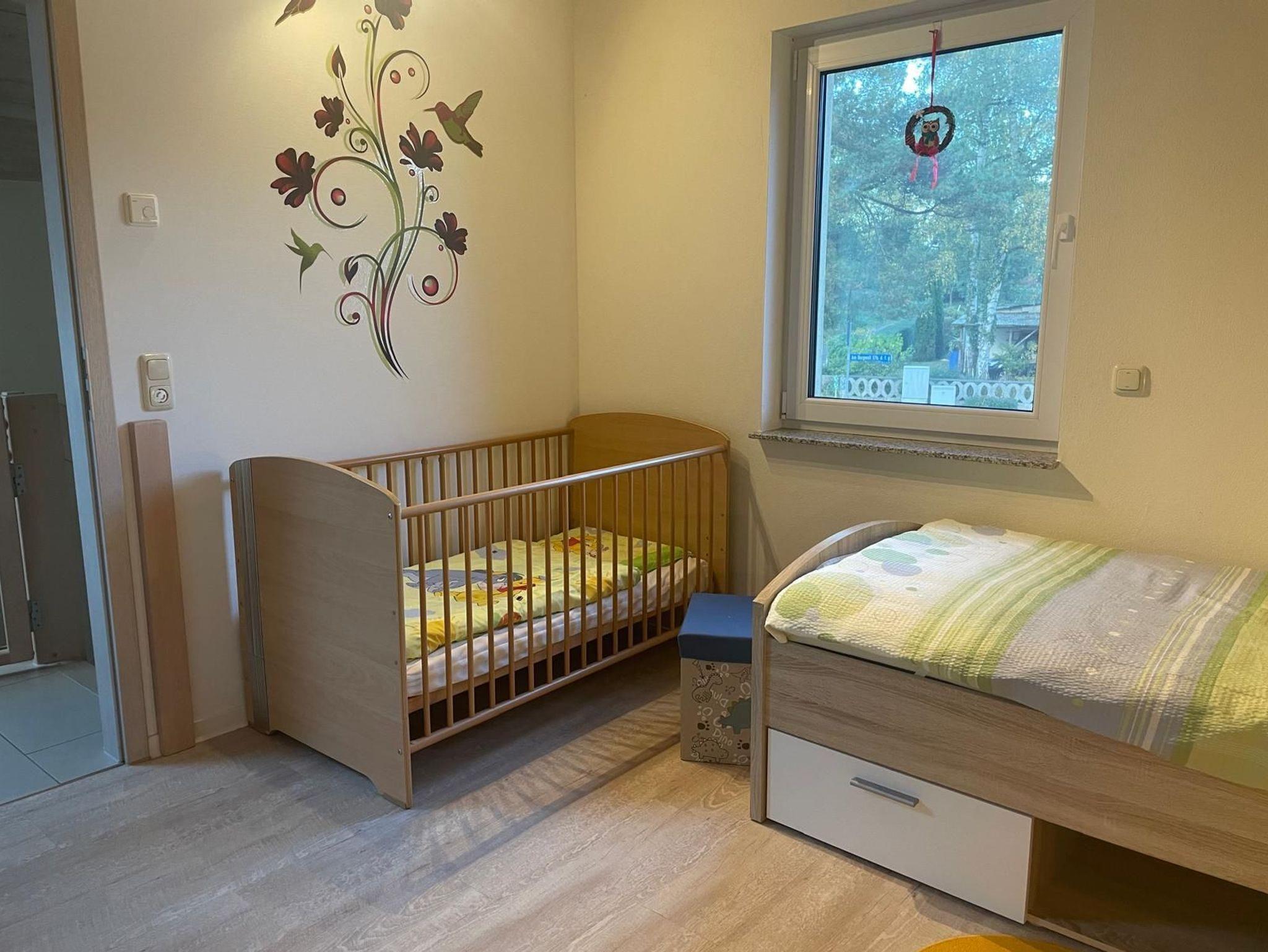 Hier befinden sich die beiden Schlafräume, ausgestattet mit einem Doppelbett und Kleiderschrank zwei auseinanderstehenden Betten, Sideboard und Leselampen am Bett - ein Kinderbett sowie ein Hochstuhl - Rauchmelder sind installiert und ein Treppenschutzgitter sorgt für Sicherheit im Obergeschoss.