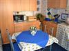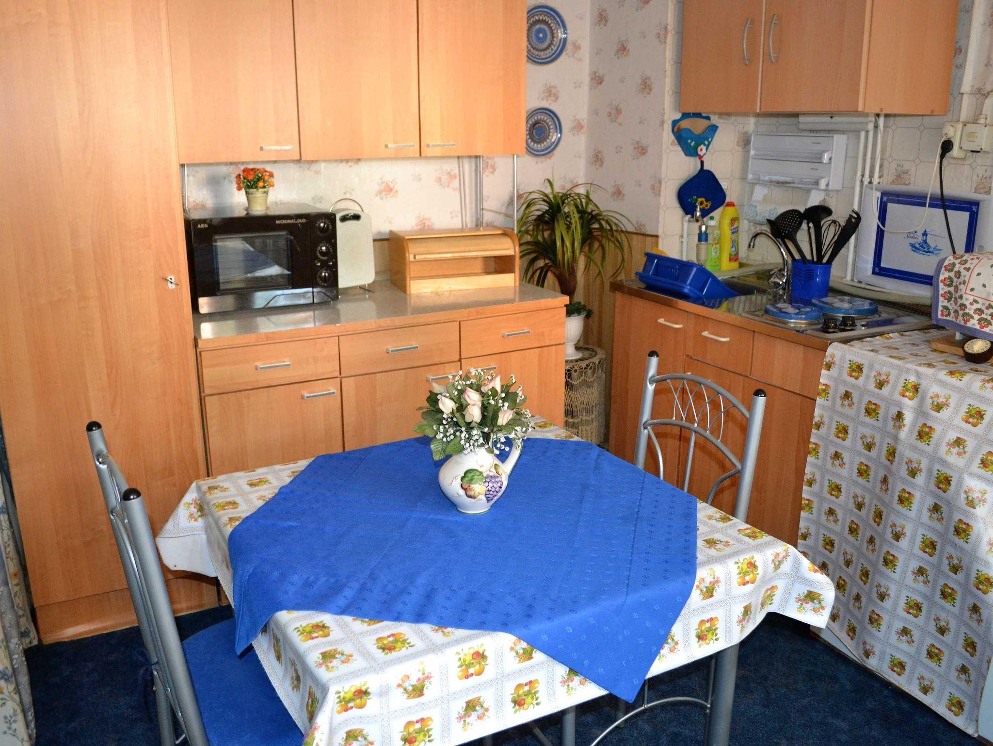 Die Küche mit Esstisch ist durch einen Vorhang vom Wirtschaftsraum abgetrennt.