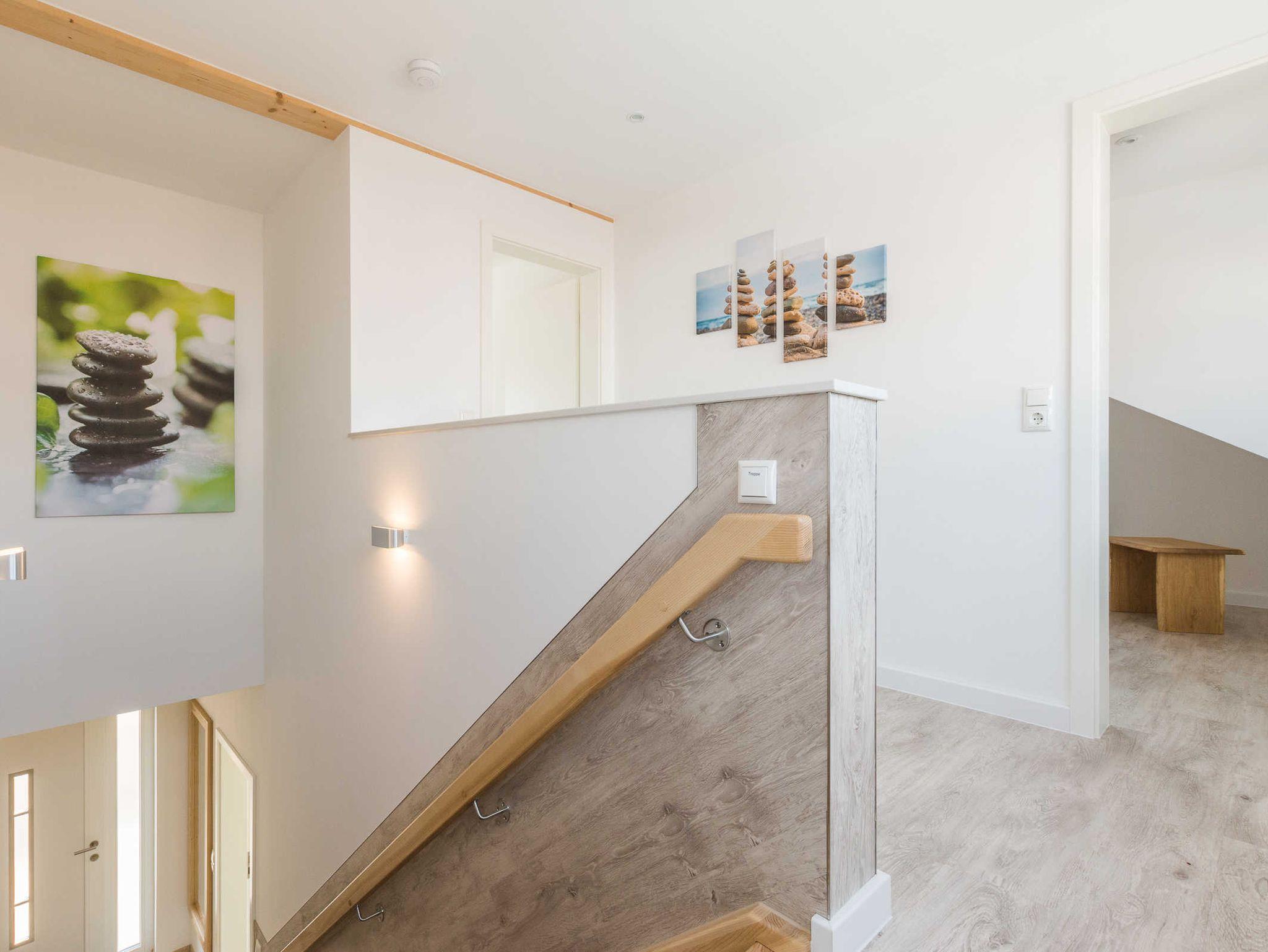 Eine Holztreppe führt in das geräumige Obergeschoss. Hier befinden sich zwei Schlafzimmer und ein modernes Badezimmer mit ebenerdiger Dusche.