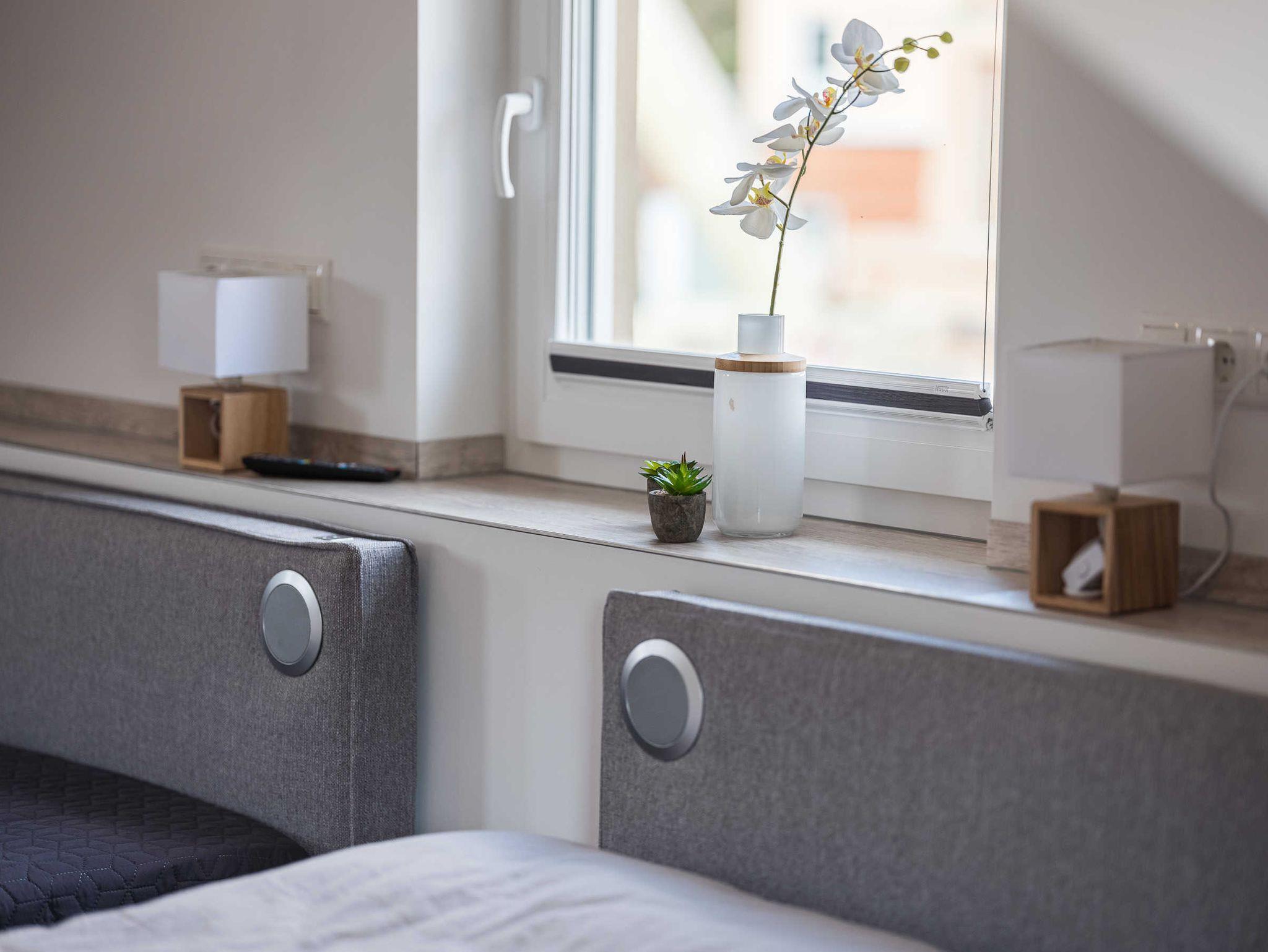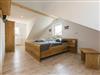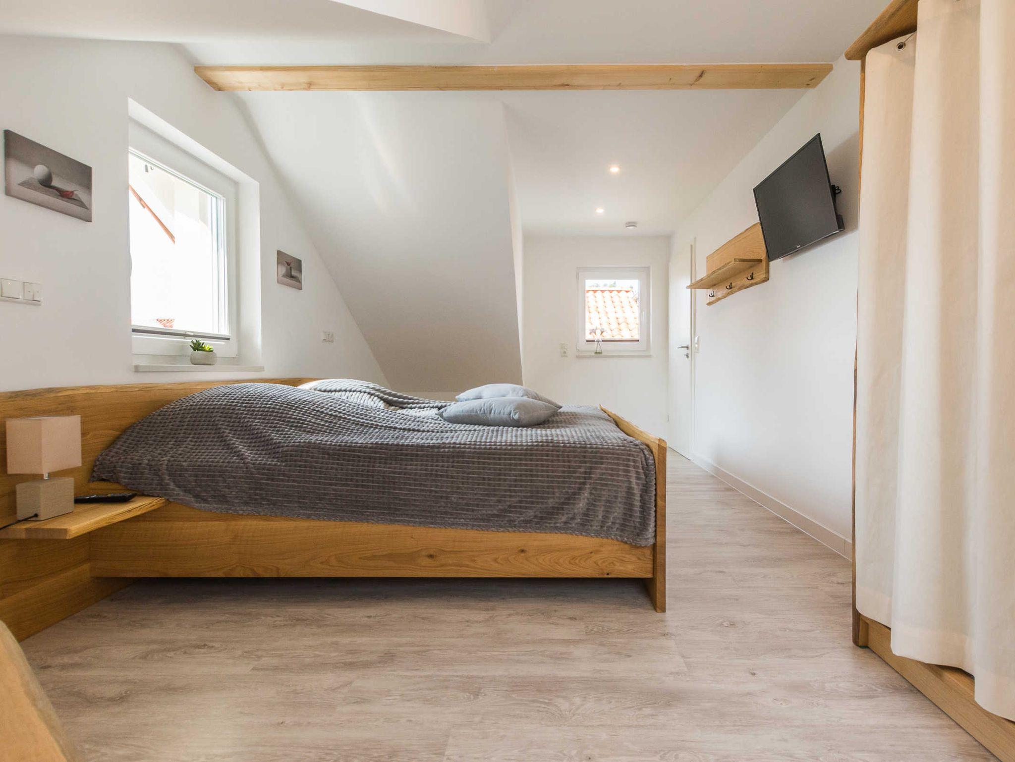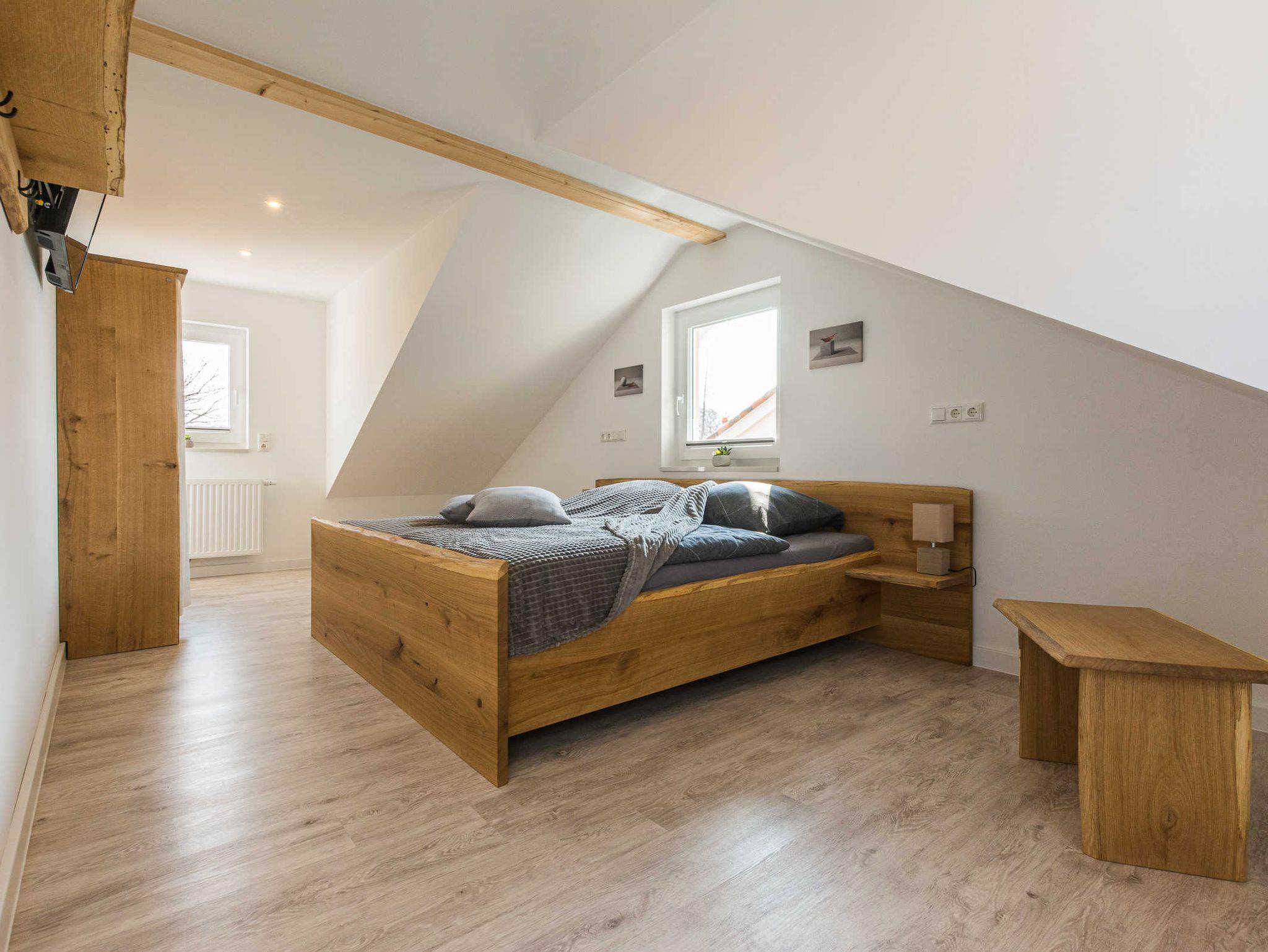 Dachschrägen und Möbel aus massivem Eichenholz sind ein echter Blickfang und werden von abgestimmten Accessoires harmonisch ergänzt. Beide Schlafzimmer sind mit einem Fernseher ausgestattet. Elektrische Rollläden helfen dabei, seligen Schlaf zu finden.