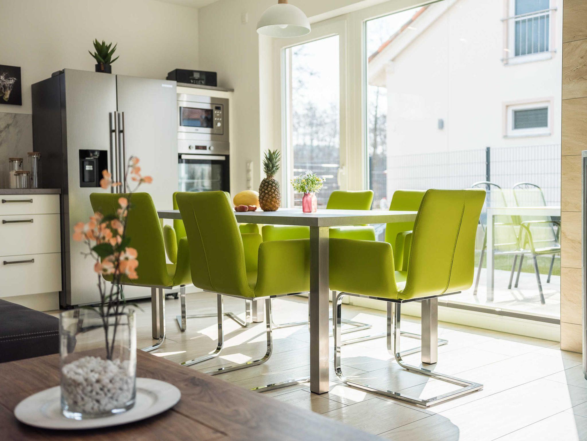 Der lichtdurchflutete Wohn- Essbereich mit offener, vollausgestatteter Küche lädt zum Kochen, Essen und gemeinsamen Miteinander ein. Für regelmäßig kühle Drinks und frische Eiswürfel steht Ihnen ein exklusiver Side-by-Side Kühlschrank mit Eiswürfelspender zur Verfügung.