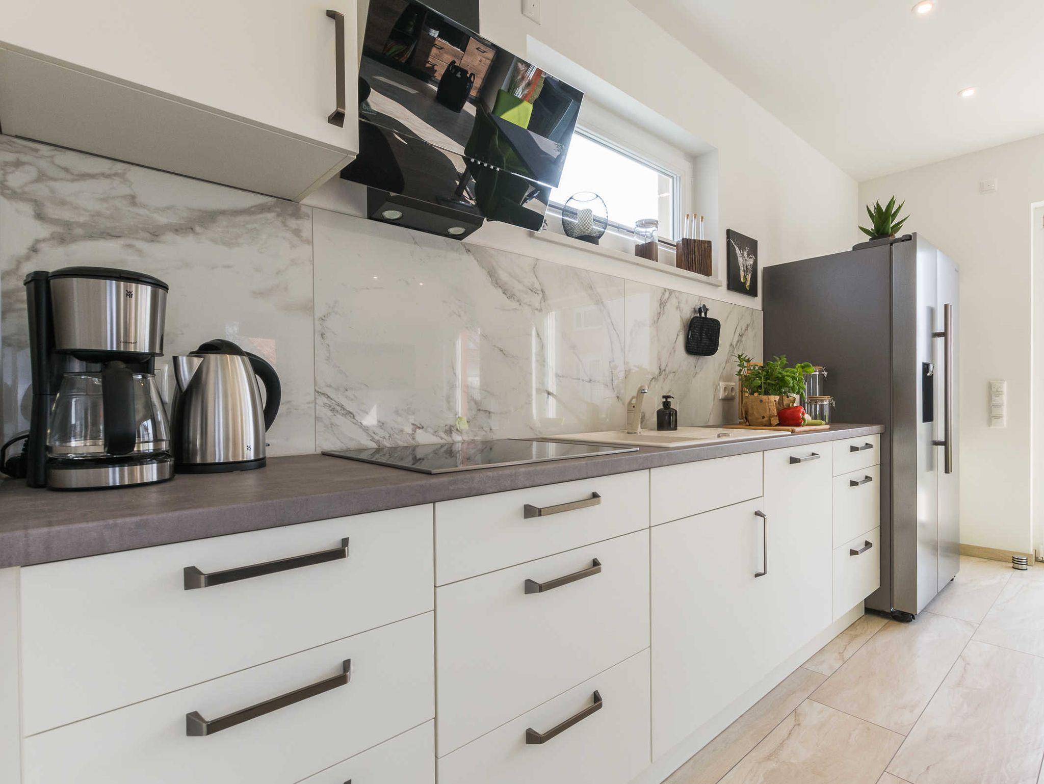 moderne, offene Küche mit Side-by-Side Kühl- und Gefrierschrank, Cerankochfeld, Dunstabzugshaube, Backofen, Geschirrspülmaschine, Mikrowelle, Kaffeemaschine, Toaster, Wasserkocher