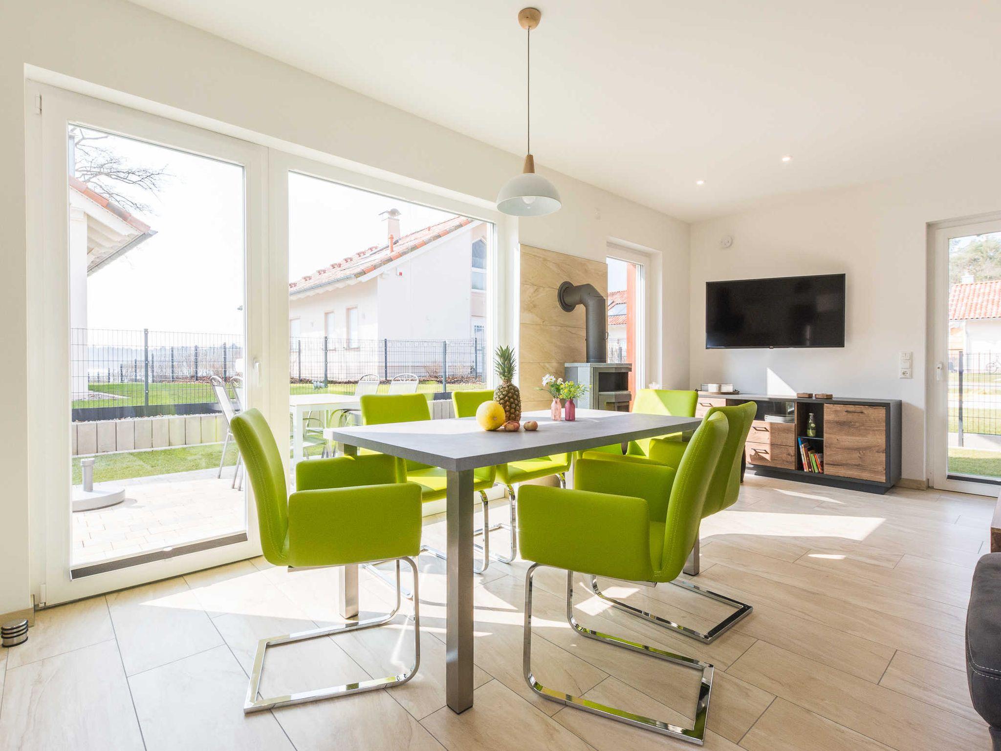 Esstisch mit 6 Stühlen, Couchecke, Sessel, Couchtisch, Kaminofen, TV-Flachbild, Radio/CD Player, Spielesammlung