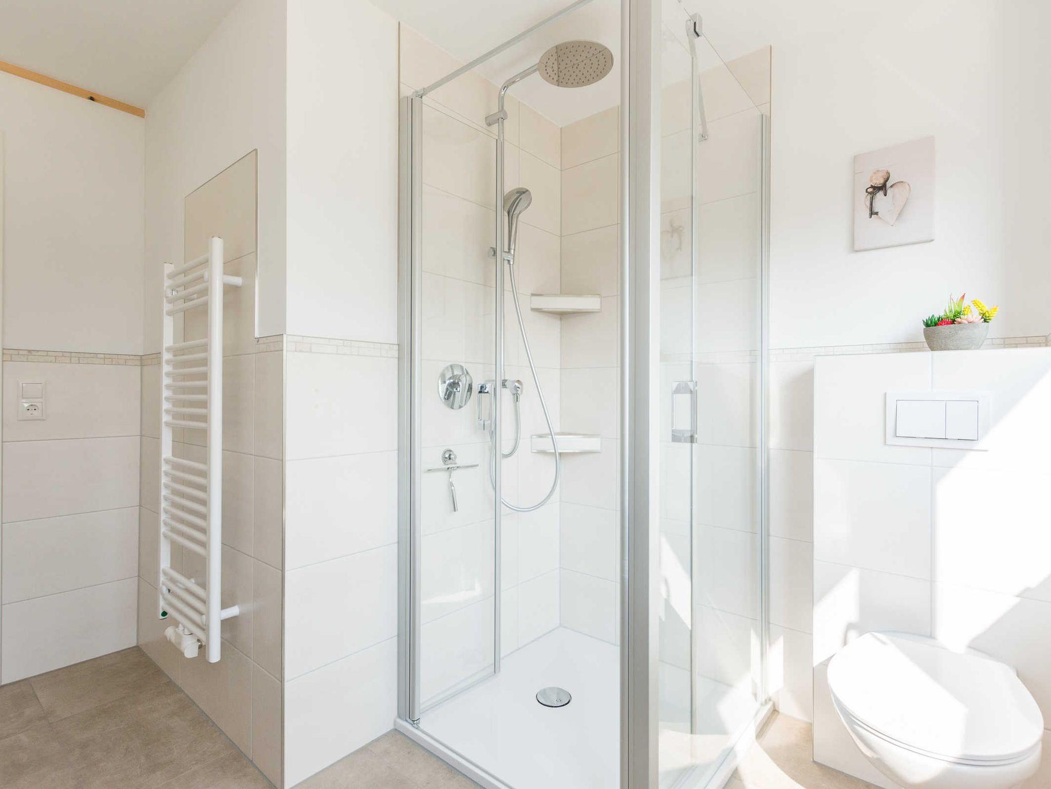 begehbare Dusche, Handtuchtrockner, WC, Waschtisch