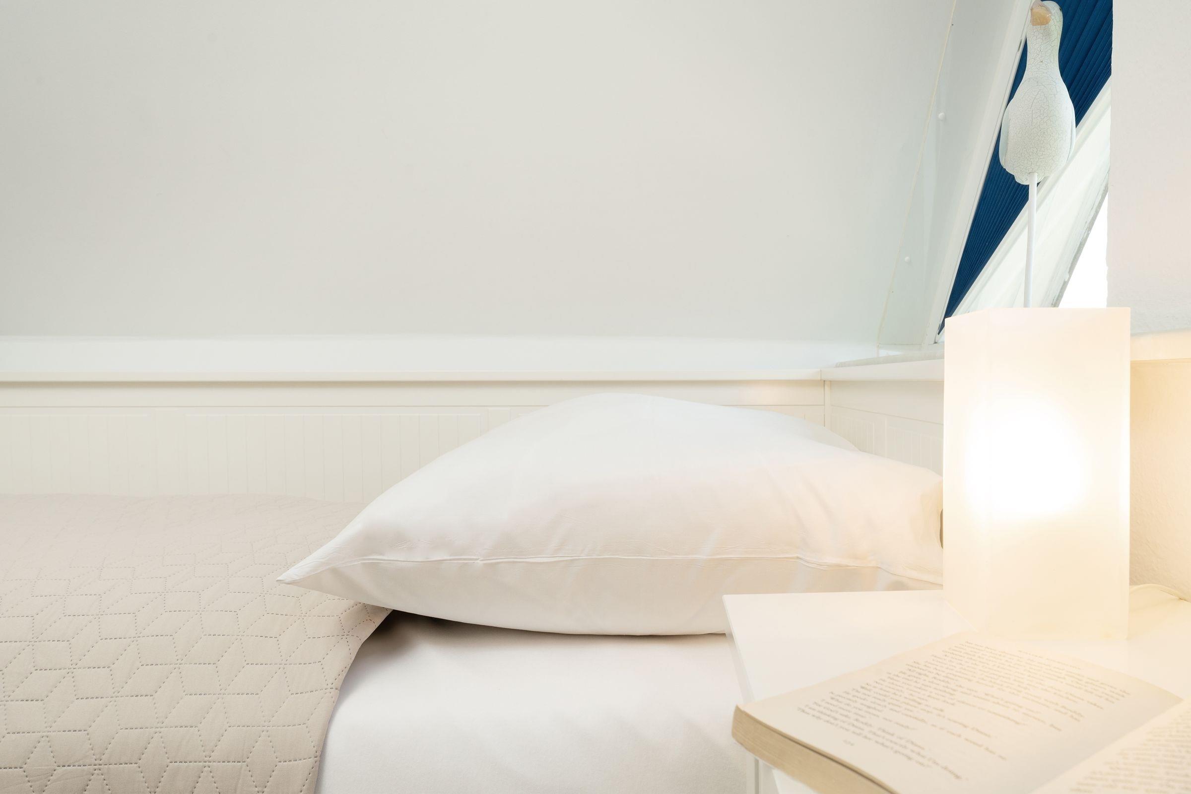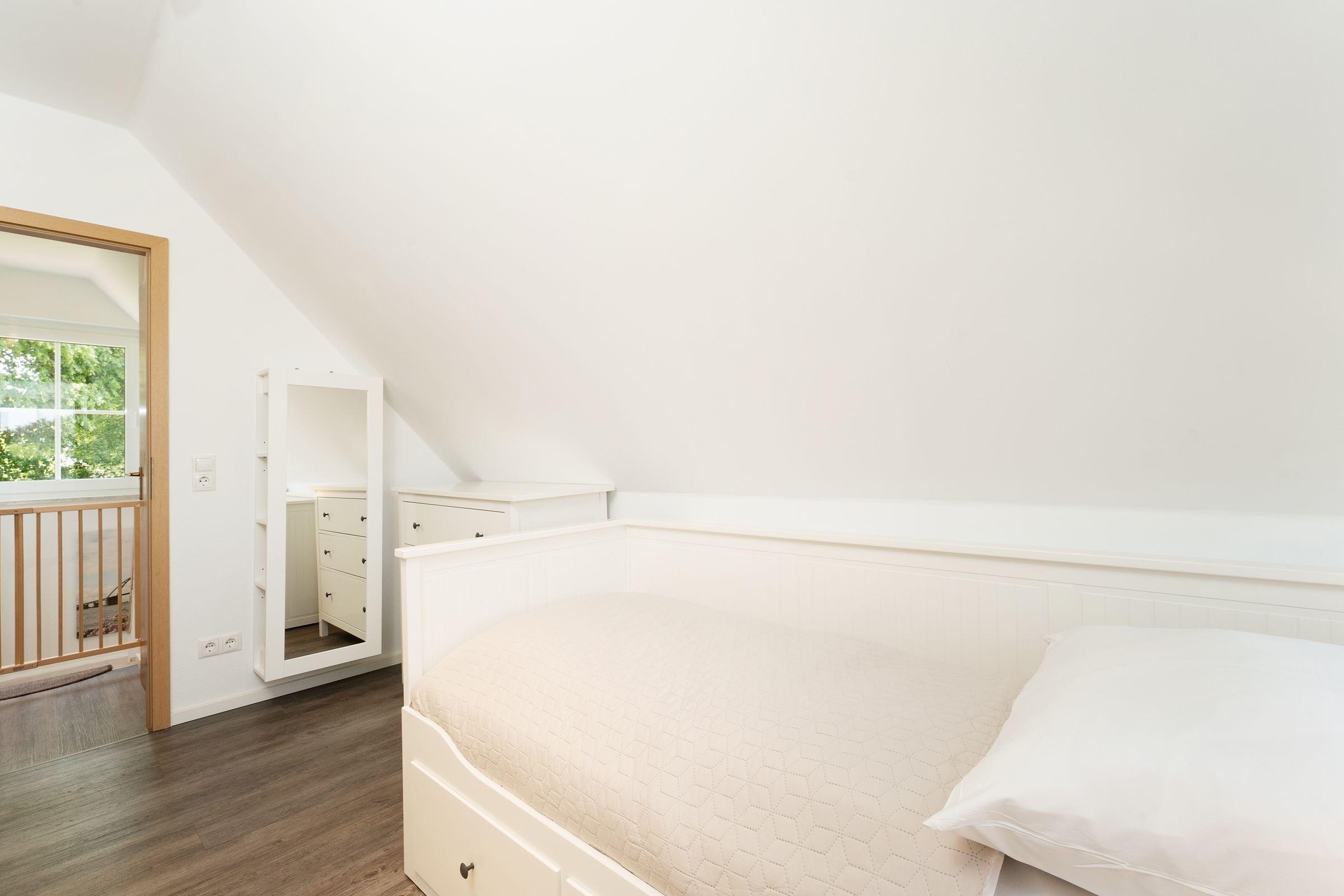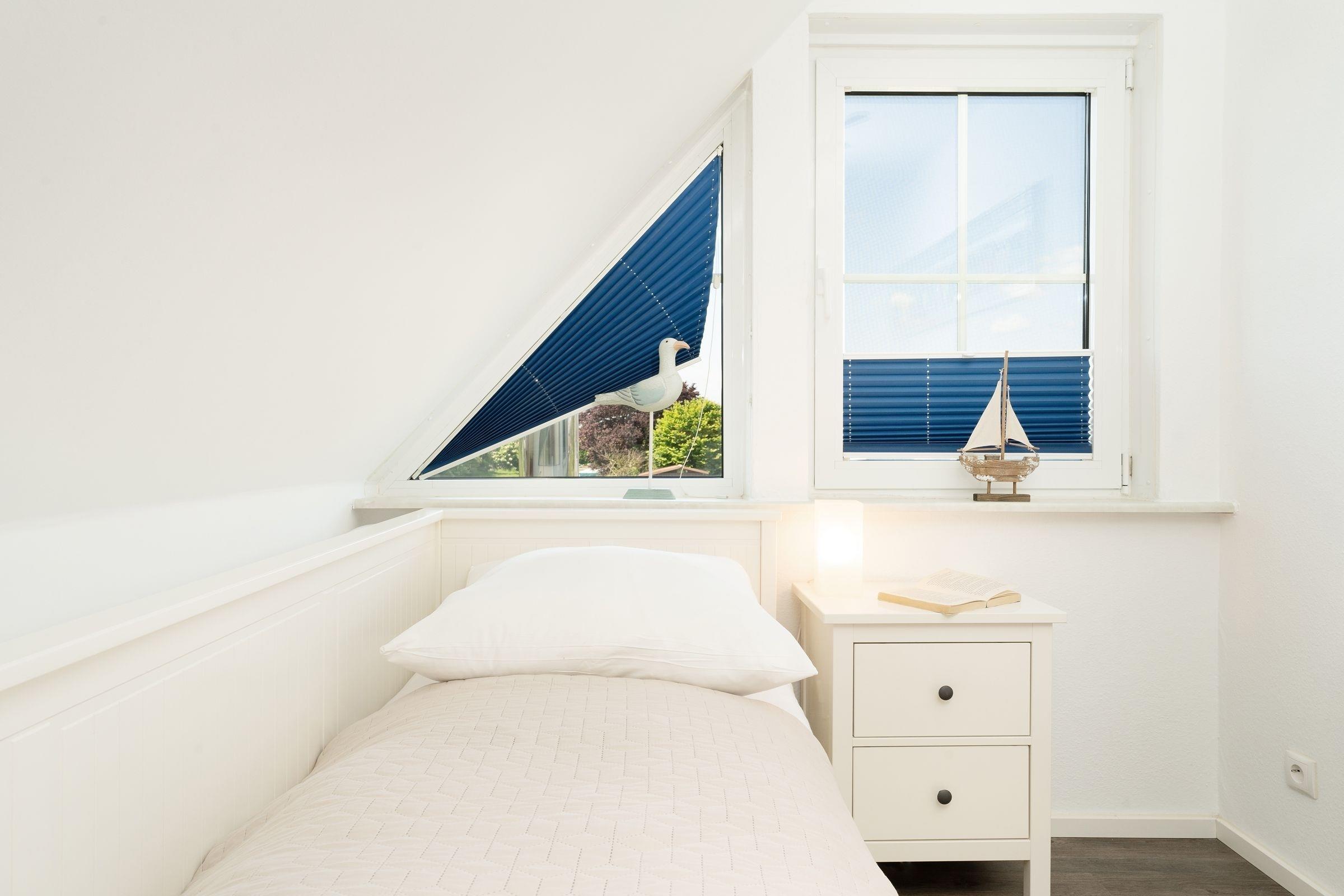 Schlafzimmer 3 (OG): 1 Einzelbett (80x200 cm), Plissees zur Verdunkelung, kein Platz für Babybett vorhanden