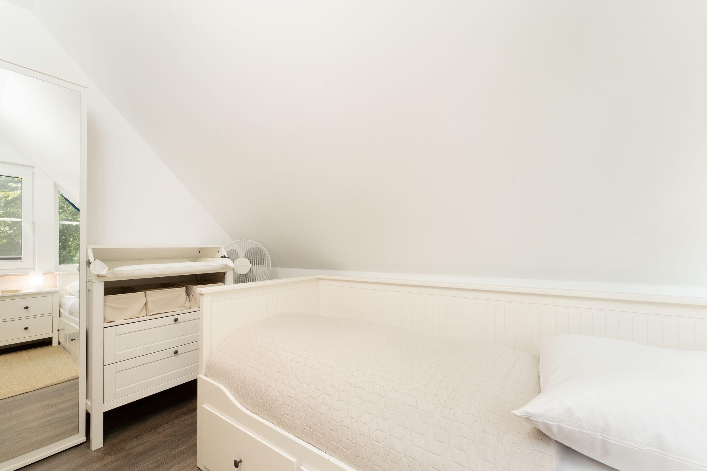 Schlafzimmer 2 (OG): 1 Kojenbett (2x 80x200 cm), Kommode, Plissees zur Verdunkelung, Platz für Babybett vorhanden