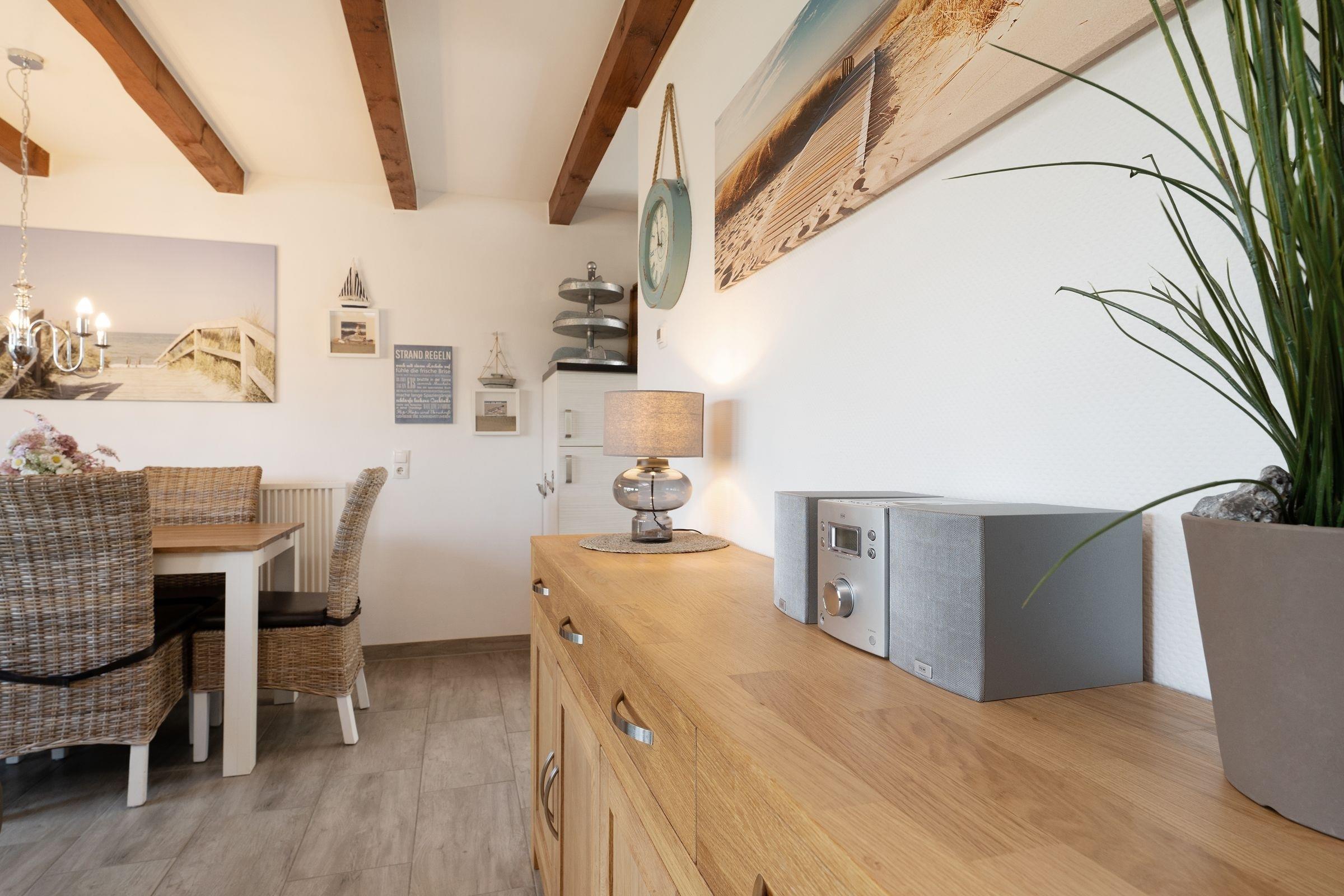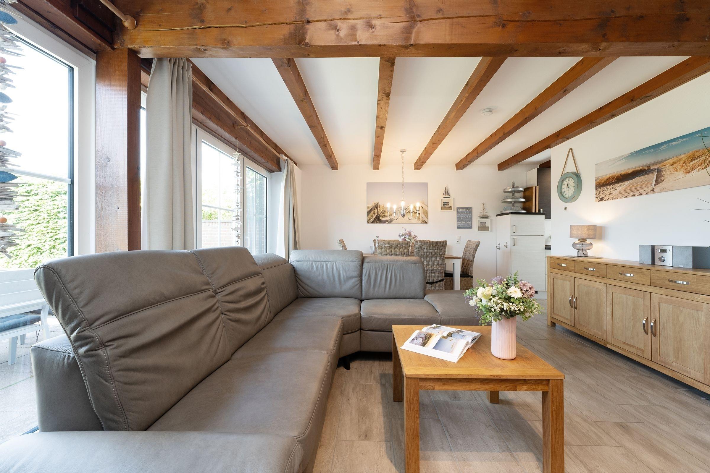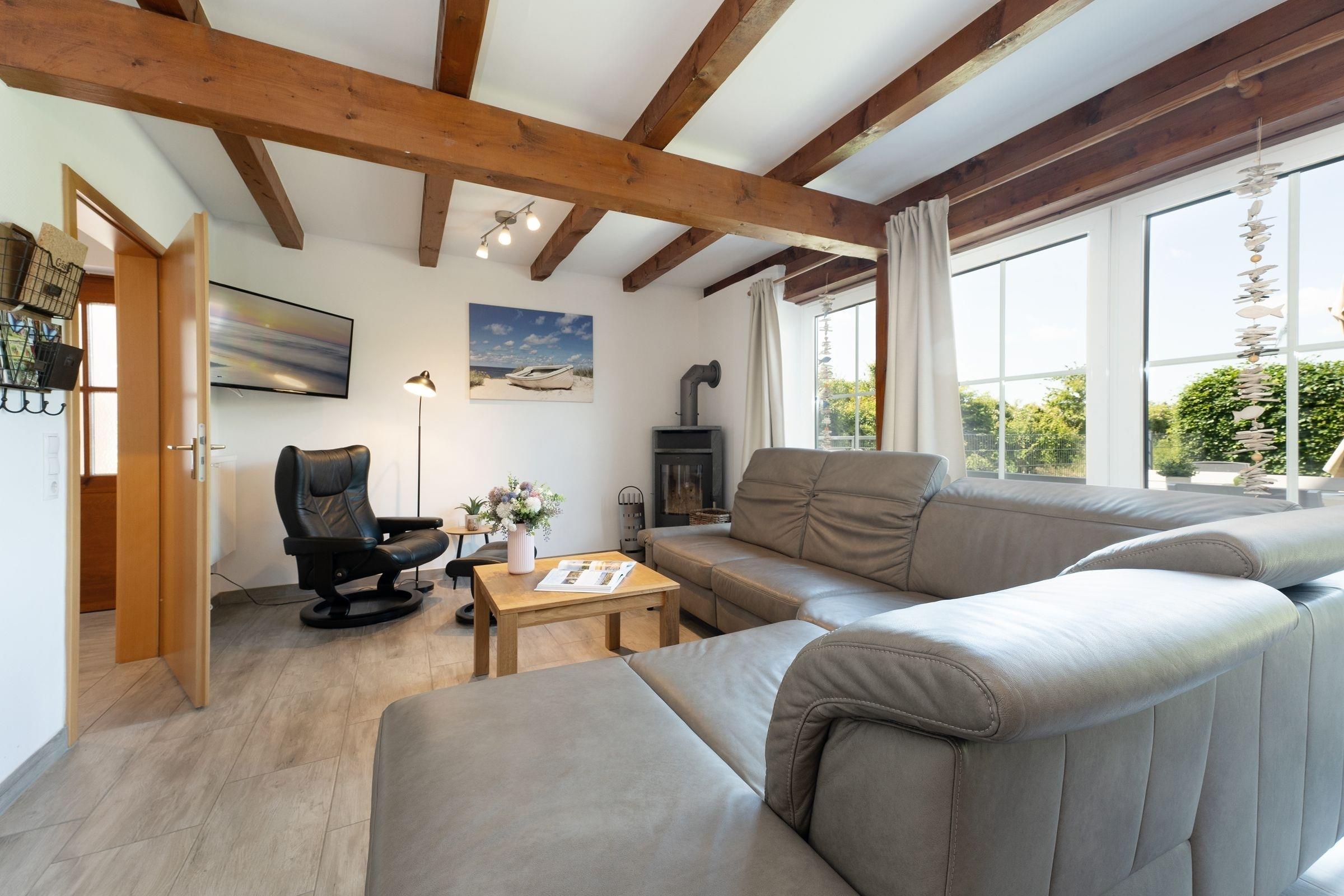Lust auf gute Seeluft? "Dat Ostseehus" ist nur rund 290 Meter vom Strand entfernt und punktet durch seine geschmackvolle Einrichtung. Im schicken Wohn-/Essbereich sorgen ein Ofen sowie offene Balken für eine gemütliche Atmosphäre. Komfort bietet zudem eine Fußbodenheizung, die auch in der modernen Küche zu finden ist. Zaubern Sie hier Ihre Lieblingsmenüs und genießen Sie diese auf eine der möblierten Terrassen. Mehrere Sonnenliegen und ein Strandkorb laden im Garten zum Verweilen ein. Wie wäre es mit einem Tischtennis-Turnier? Oder einem Grillabend? Nach einem tollen Urlaubstag stehen Ihnen im OG ein Schlafzimmer mit einem Doppelbett (2x 90x200 cm), eins mit einem Kojenbett (2x 80x200 cm) sowie eins mit einem Einzelbett (80x200 cm) zur Verfügung. Ebenso ein Gäste-WC. Das tageslichthelle Duschbad im UG bietet den Komfort, den man sich wünscht.
