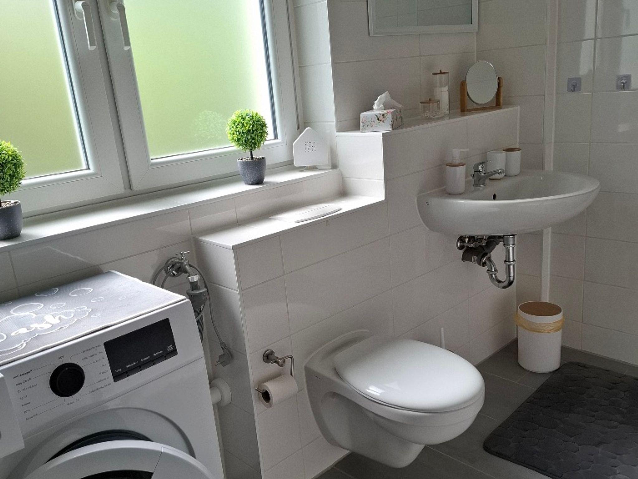 Im Badezimmer findet ihr neben Waschbecken eine ebenerdige Dusche, Toilette vor, zudem könnt ihr eure Wäsche waschen (WM). Grundstock an Seife, Toilettenpapier und Handtuch-Sets halten wir für Euch bereit. Nutzung der Waschmaschine ist im Preis inbegriffen, ein Waschmitteltabs erhaltet ihr kostenlos.