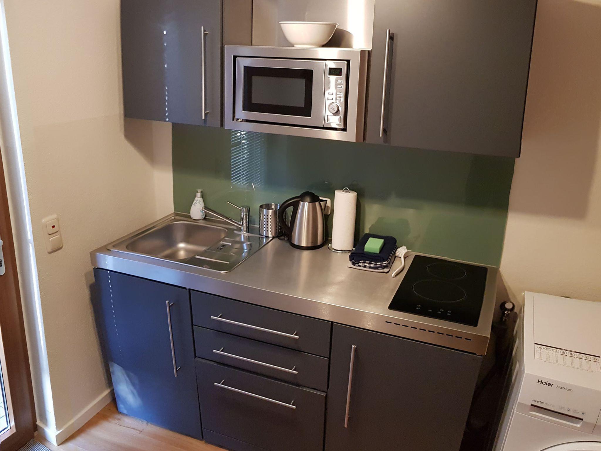 Die Wohnung wurde mit viel Liebe zum Detail eingerichtet. Die kleine, voll ausgestattete Küche bietet alles, was Sie für die Zubereitung Ihrer Mahlzeiten benötigen - incl. Mikrowelle mit Grillfunktion, Kaffeemaschiene und Spülmaschine. Zum Reinigen Ihrer Kleidung steht ein Waschtrockner zur Verfügung. In dem modernen, geschmackvoll eingerichteten Bad fühlt man sich auf Anhieb wohl. Ein Fernseher im Schlafzimmer, Wlan und einen Parkplatz auf dem Grundstück gehören ebefalls dazu.