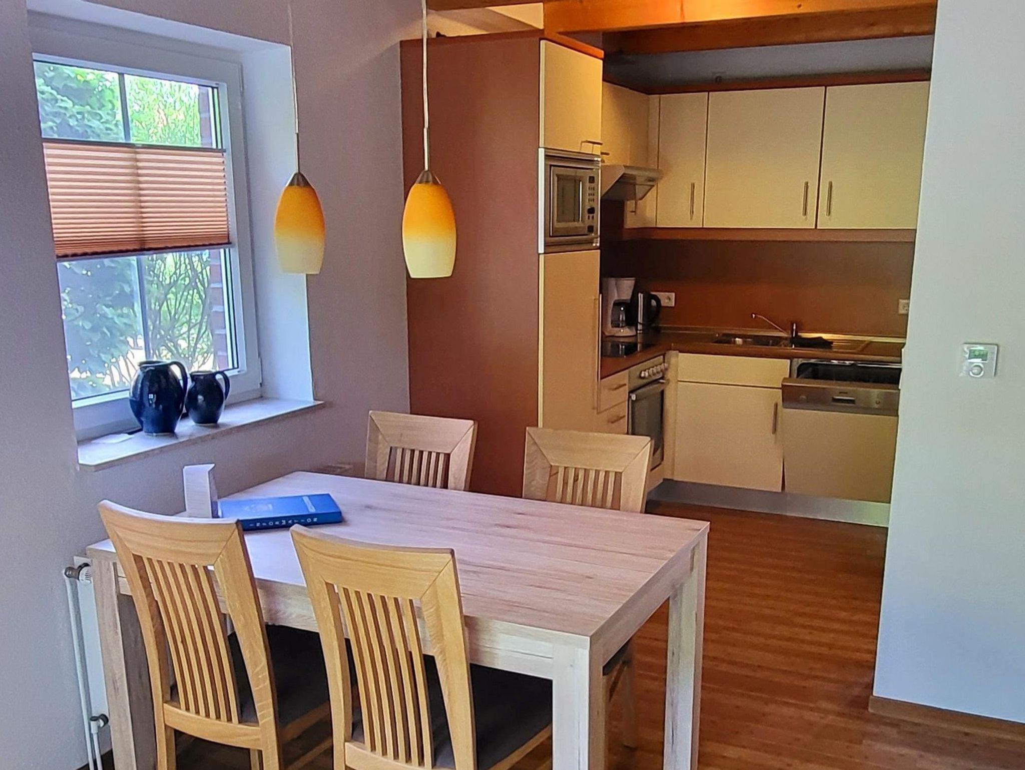 Die voll ausgestattete Küche mit Geschirrspüler und Mikrowelle bietet alles, was Sie für die unkomplizierte Selbstversorgung benötigen. Am separaten Essplatz genießen Sie gemeinsame Mahlzeiten in entspannter Atmosphäre.