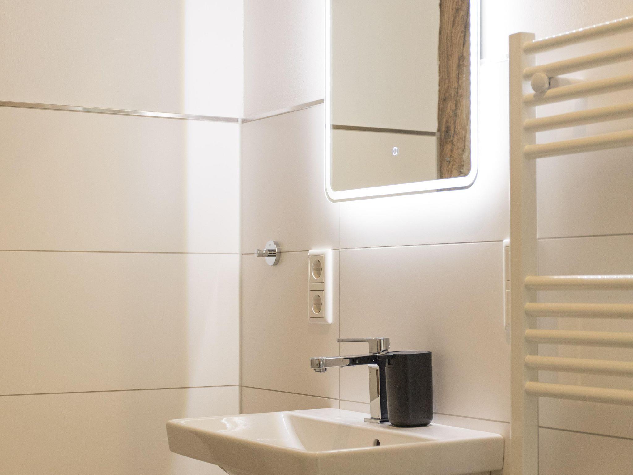 Alle Wohnungen sind Maisonette und zeichnen sich durch moderne, Grundrisse aus. Durch die Einbeziehung des historischen Ständerfachwerks in die Wohnraumgestaltung erhalten die Einheiten zudem eine besondere, unverwechselbare Note. Fußbodenheizung, Echtholz-Parkettböden sowie Armaturen und Keramik namhafter Hersteller versprechen einen hohen Wohnkomfort. Zu jeder Wohnung gehört eine großzügige Terrasse sowie ein PKW-Stellplatz mit Abstellschuppen. Die Außenanlagen des rund 4000 qm großen Grundstücks zeichnen sich besonders an der Südseite und Ostseite durch großzügige Grünflächen aus, die mit Sträuchern und Hecken geschmackvoll angelegt wurden. Ein alter Baumbestand rundet das Gesamtbild ab.