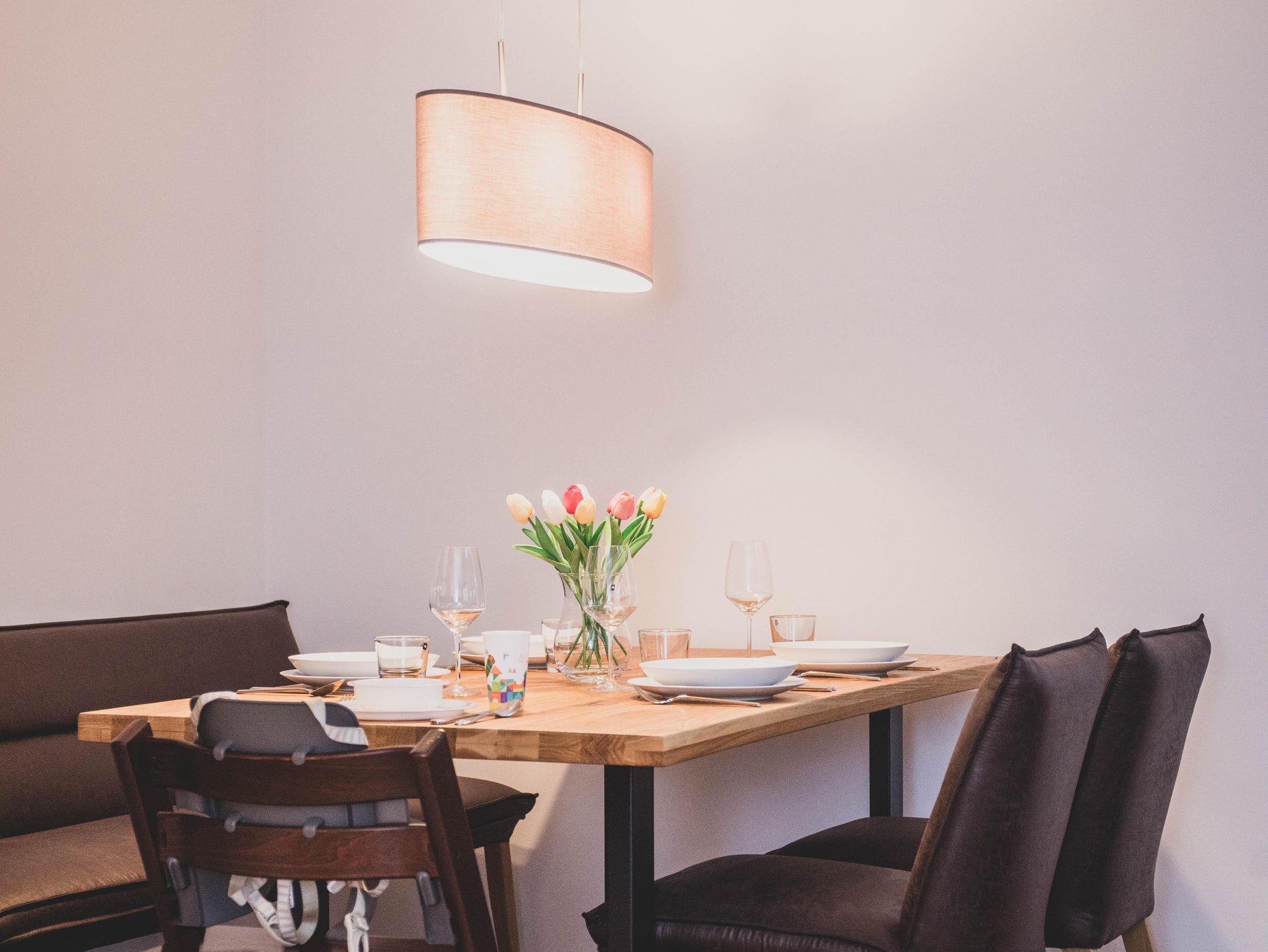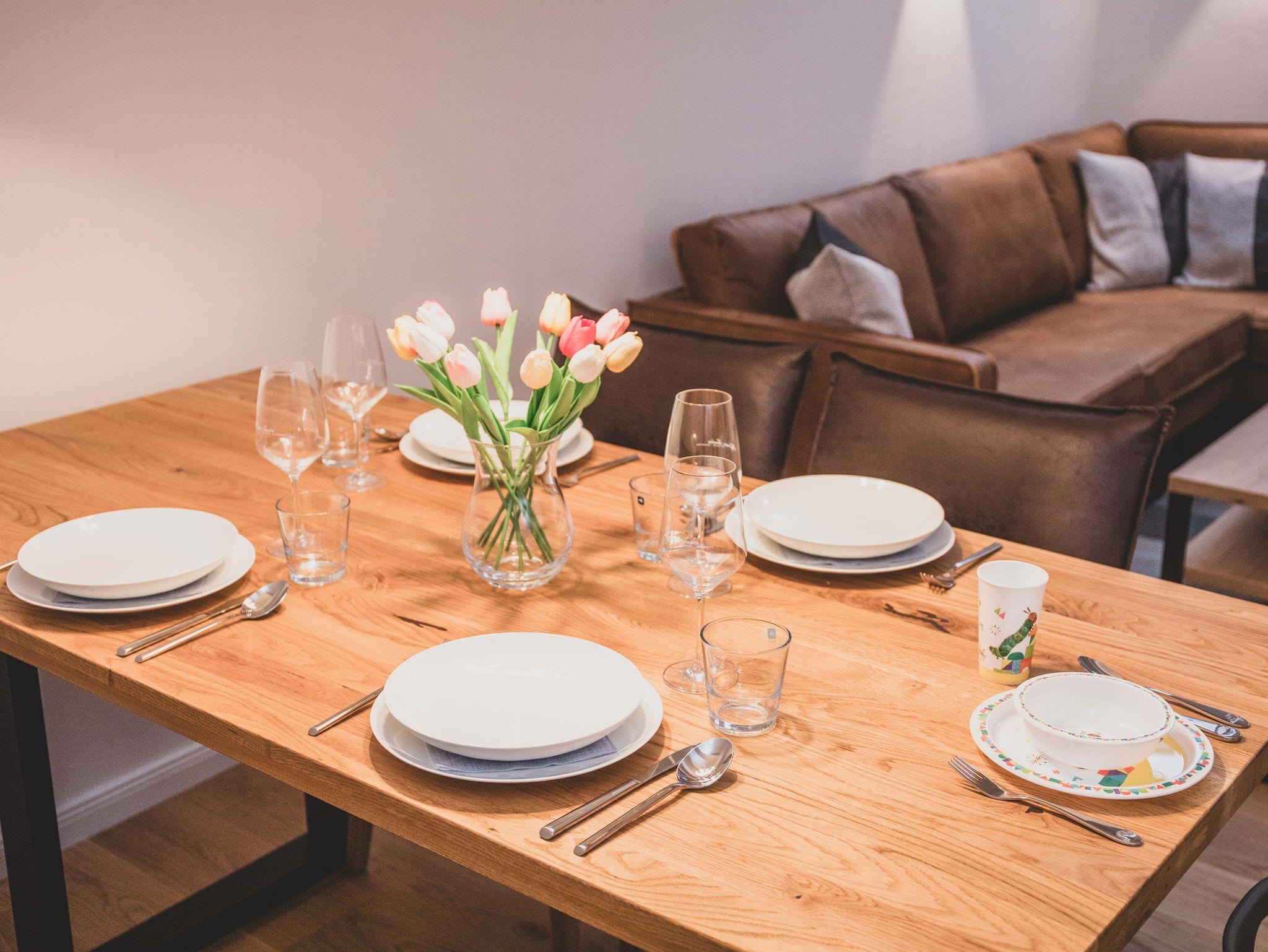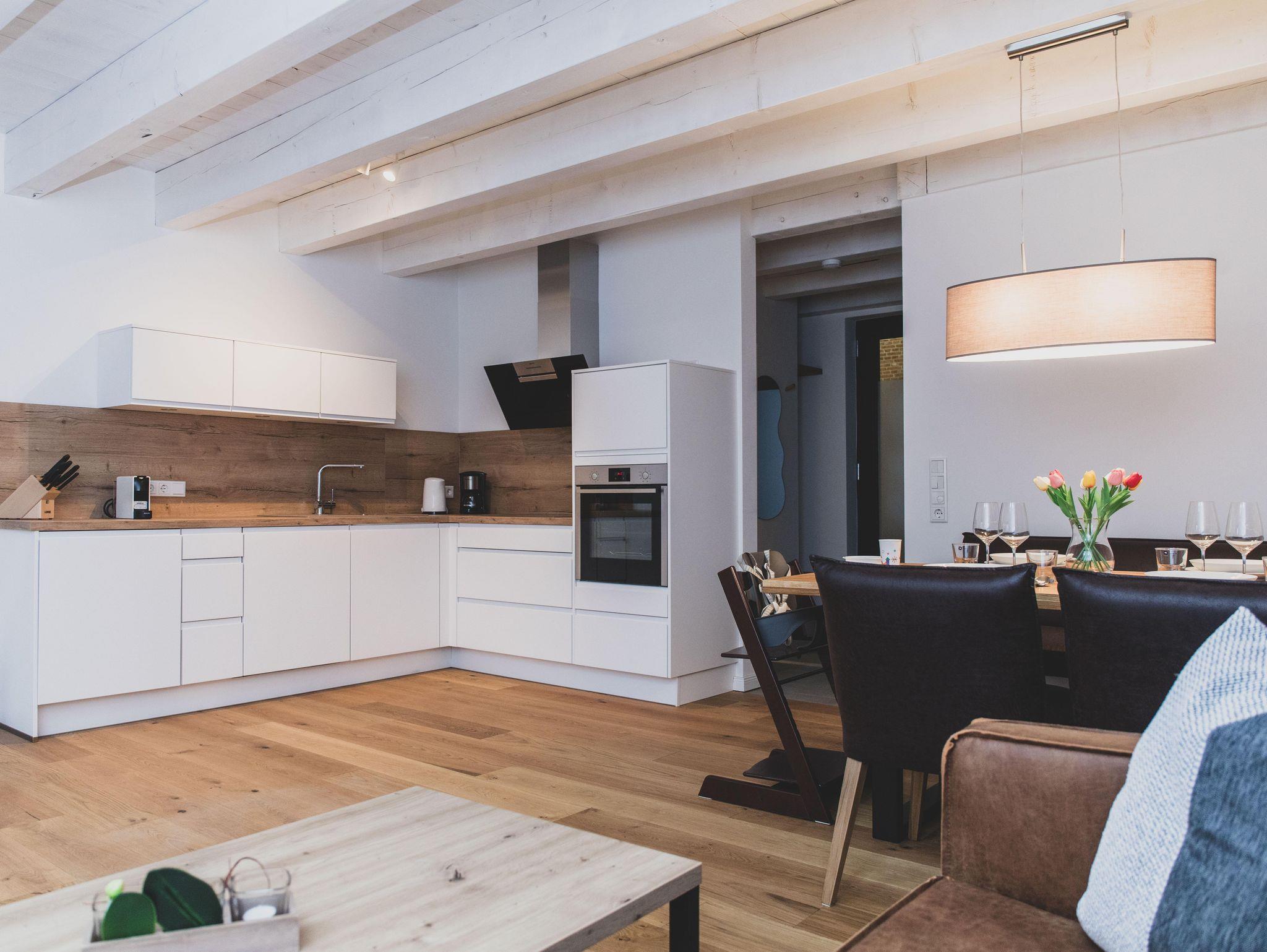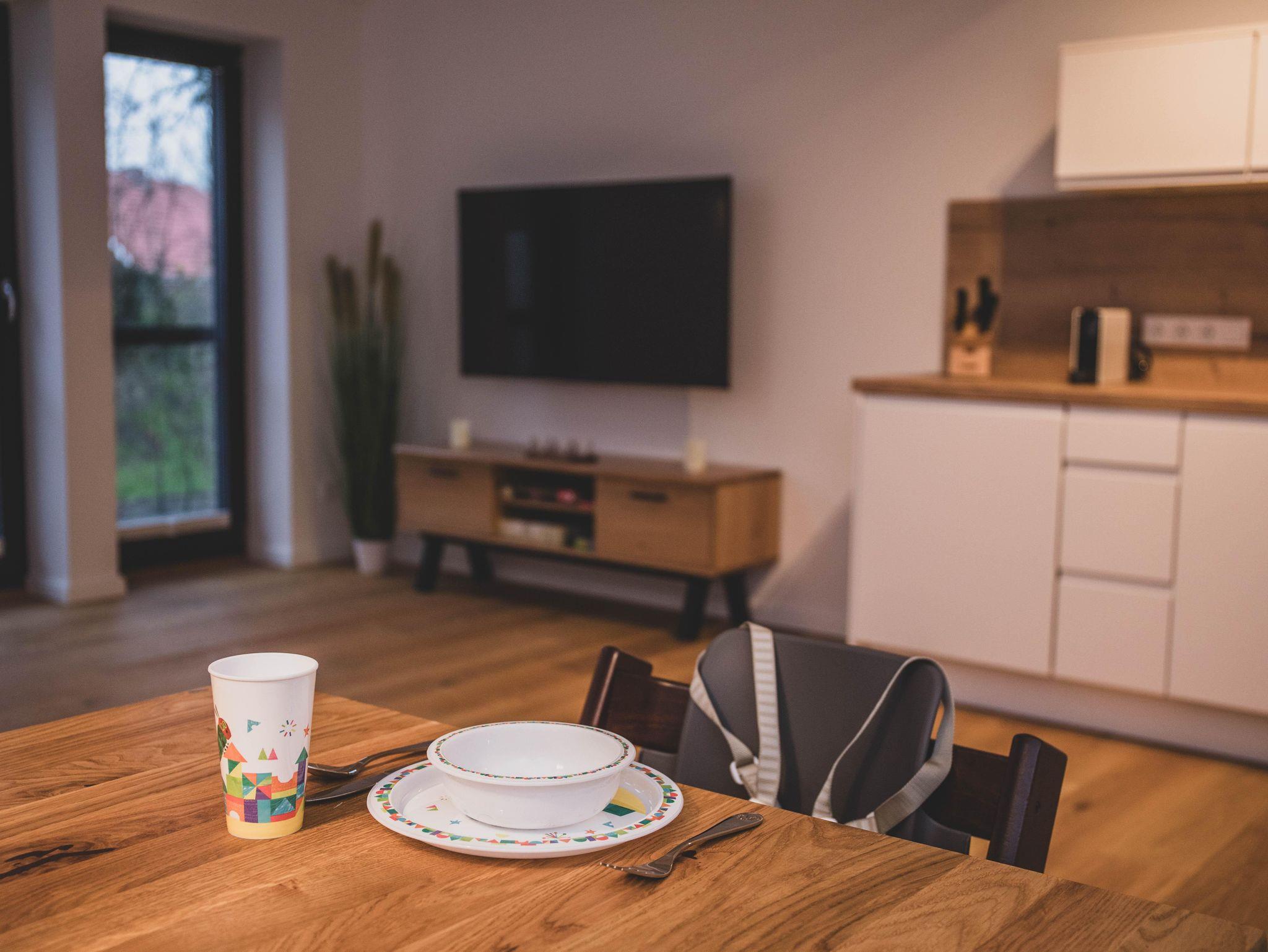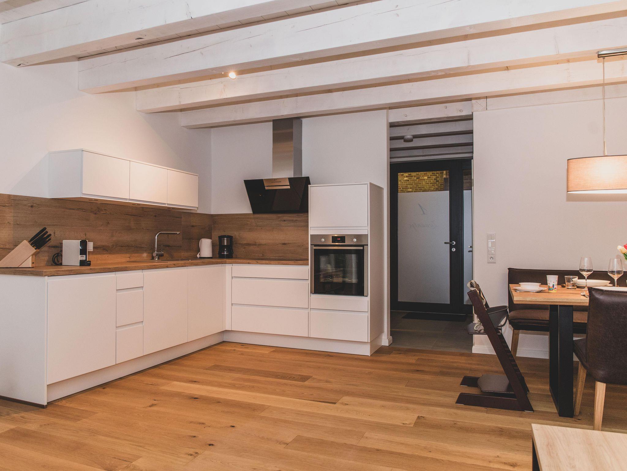Die Ferienwohnung ist liebevoll gestaltet und überzeugt im Erdgeschoss mit einem offenen Wohnkonzept, welches das Wohnzimmer und die Küche miteinander verbindet. Kochen Sie Ihre Lieblingsgerichte in der voll ausgestatteten Küche – mit Geschirrspüler, Induktionsherd, Kühlschrank und zahlreichen Küchengeräten wie einer Nespresso-Maschine, einem Mixer und einer Mikrowelle. Für jüngere Gäste gibt es einen Stokke Tripp-Trapp Hochstuhl mit Baby-Set und Gurt, sowie Kindergeschirr- und besteck. Der stilvolle Esstisch lädt zu geselligen Essen mit Freunden oder der Familie ein und die Sofaecke bietet einen tollen Platz für entspannte Abende beim Fernsehen oder Spielen. Im Obergeschoss befindet sich das voll ausgestattete Bad mit WC und bodengleicher Dusche sowie zwei Schlafzimmer, beide mit Verdunkelungsmöglichkeit und Fliegengitter, zusätzlich sind Nachtlichter und ein Türgitter vorhanden.