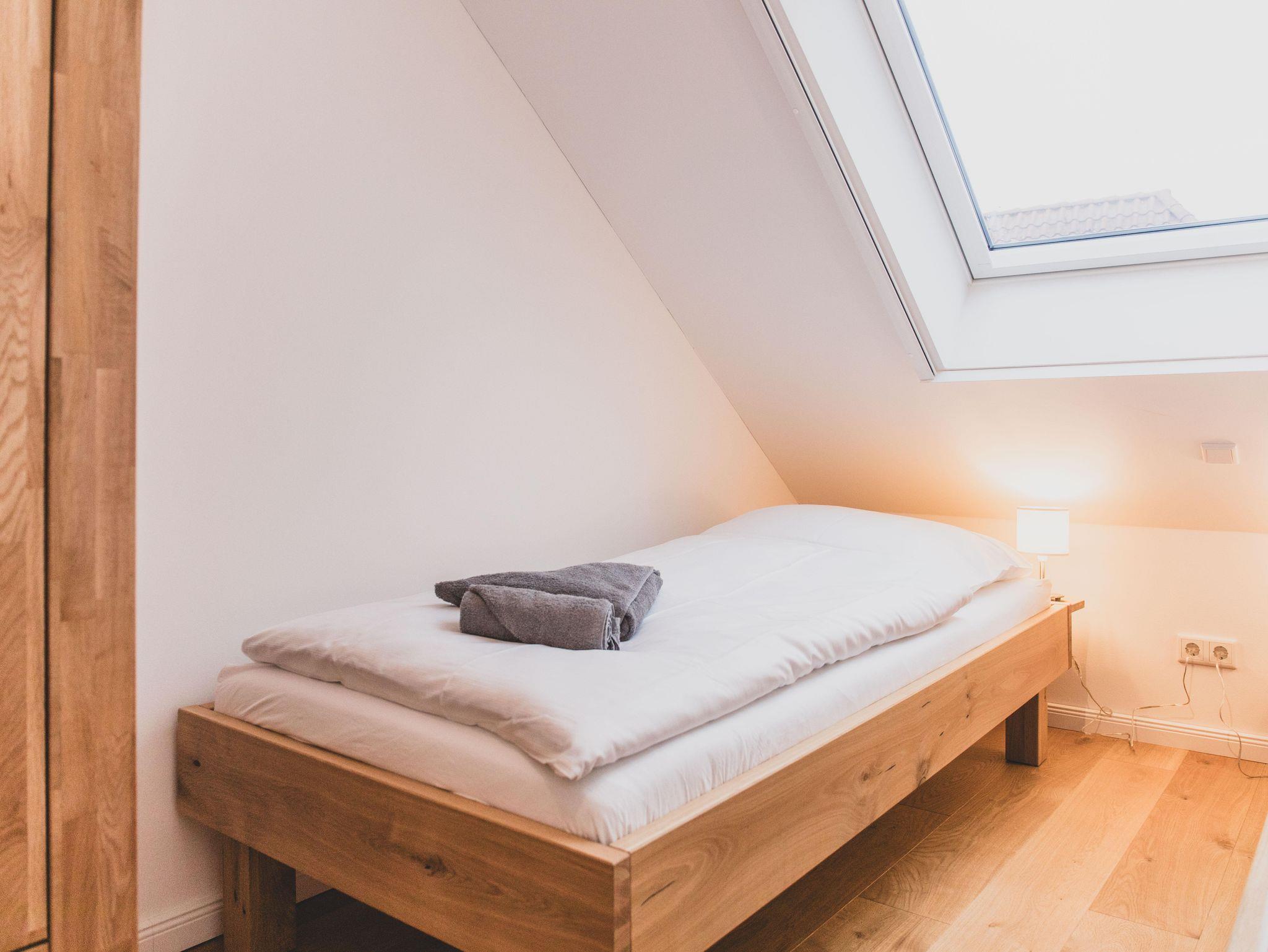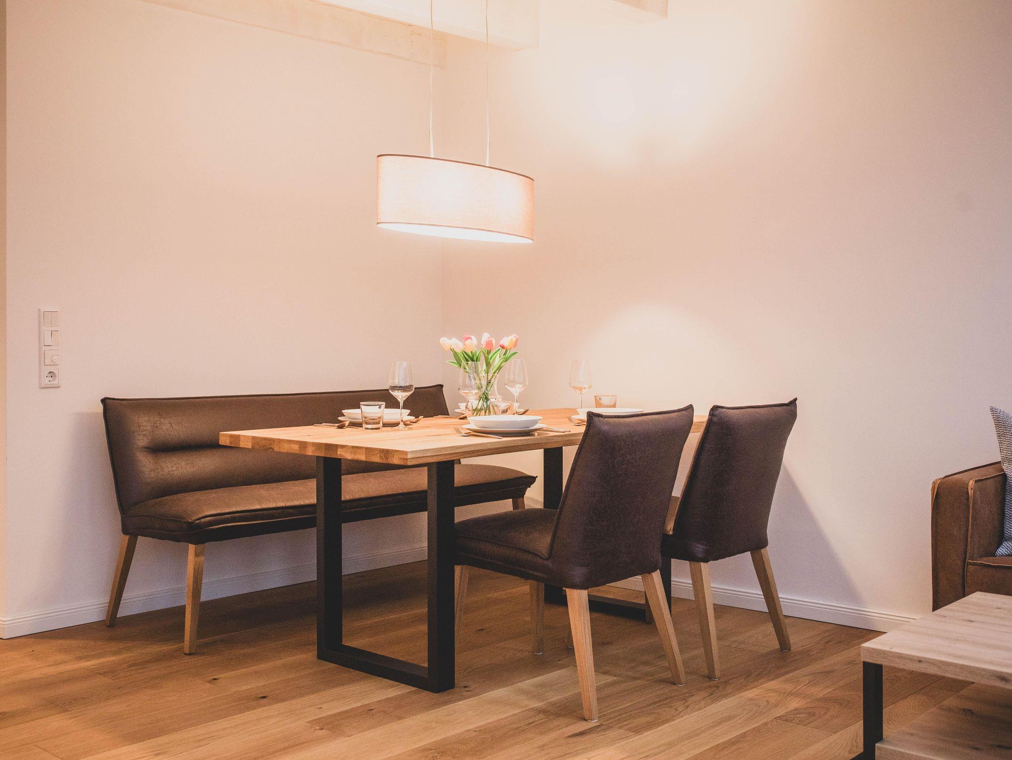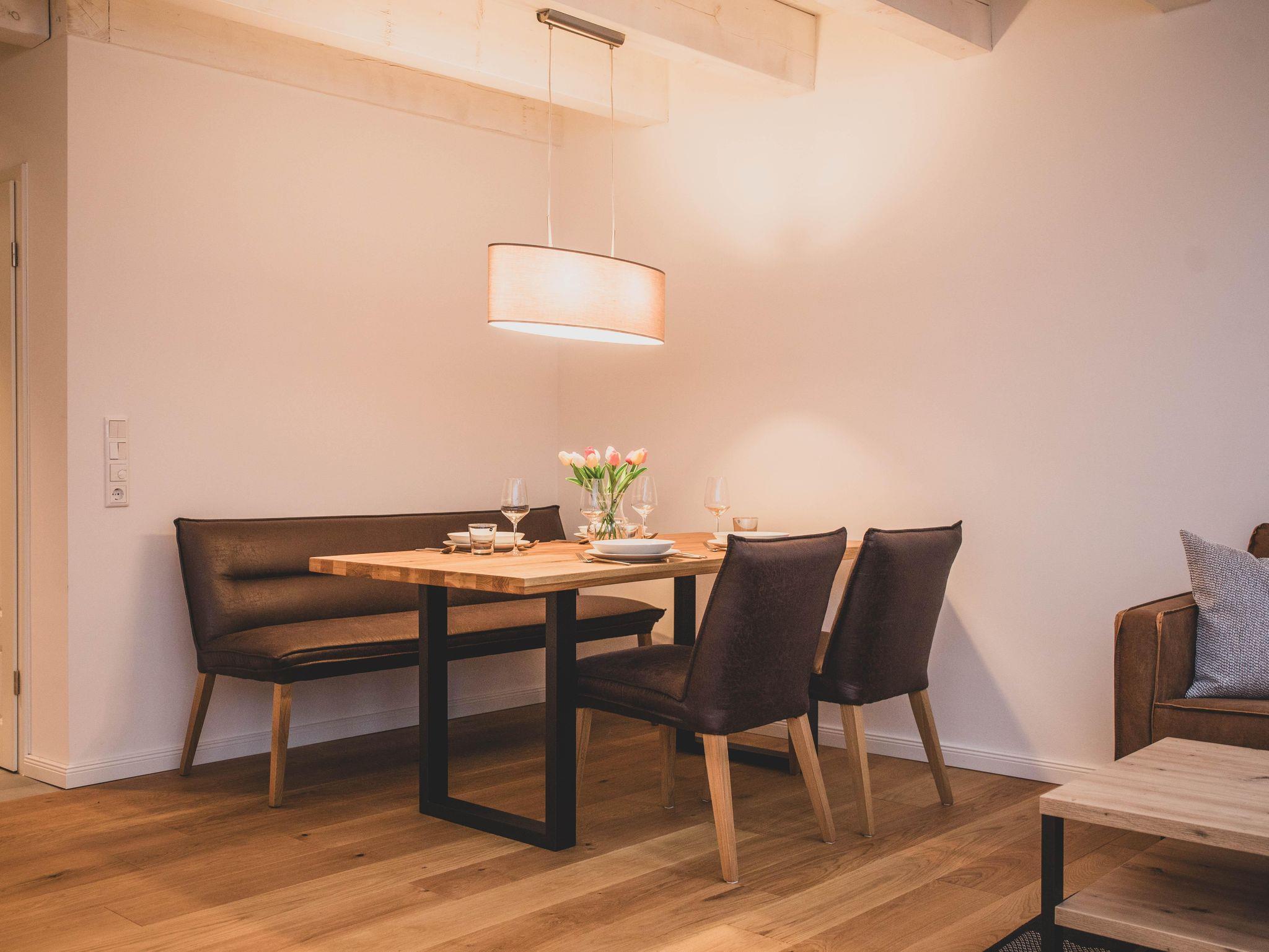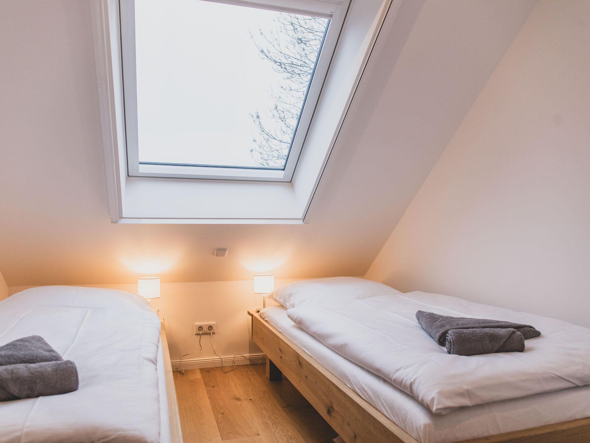 Die Ferienwohnung ist liebevoll gestaltet und überzeugt im Erdgeschoss mit einem offenen Wohnkonzept, welches das Wohnzimmer und die Küche miteinander verbindet. Kochen Sie Ihre Lieblingsgerichte in der voll ausgestatteten Küche – mit Geschirrspüler, Induktionsherd, Kühlschrank und zahlreichen Küchengeräten wie einer Nespresso-Maschine, einem Mixer und einer Mikrowelle. Für jüngere Gäste gibt es einen Stokke Tripp-Trapp Hochstuhl mit Baby-Set und Gurt, sowie Kindergeschirr- und besteck. Der stilvolle Esstisch lädt zu geselligen Essen mit Freunden oder der Familie ein und die Sofaecke bietet einen tollen Platz für entspannte Abende beim Fernsehen oder Spielen. Im Obergeschoss befindet sich das voll ausgestattete Bad mit WC und bodengleicher Dusche sowie zwei Schlafzimmer, beide mit Verdunkelungsmöglichkeit und Fliegengitter, zusätzlich sind Nachtlichter und ein Türgitter vorhanden.